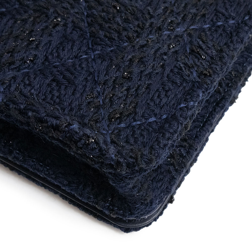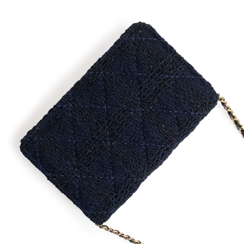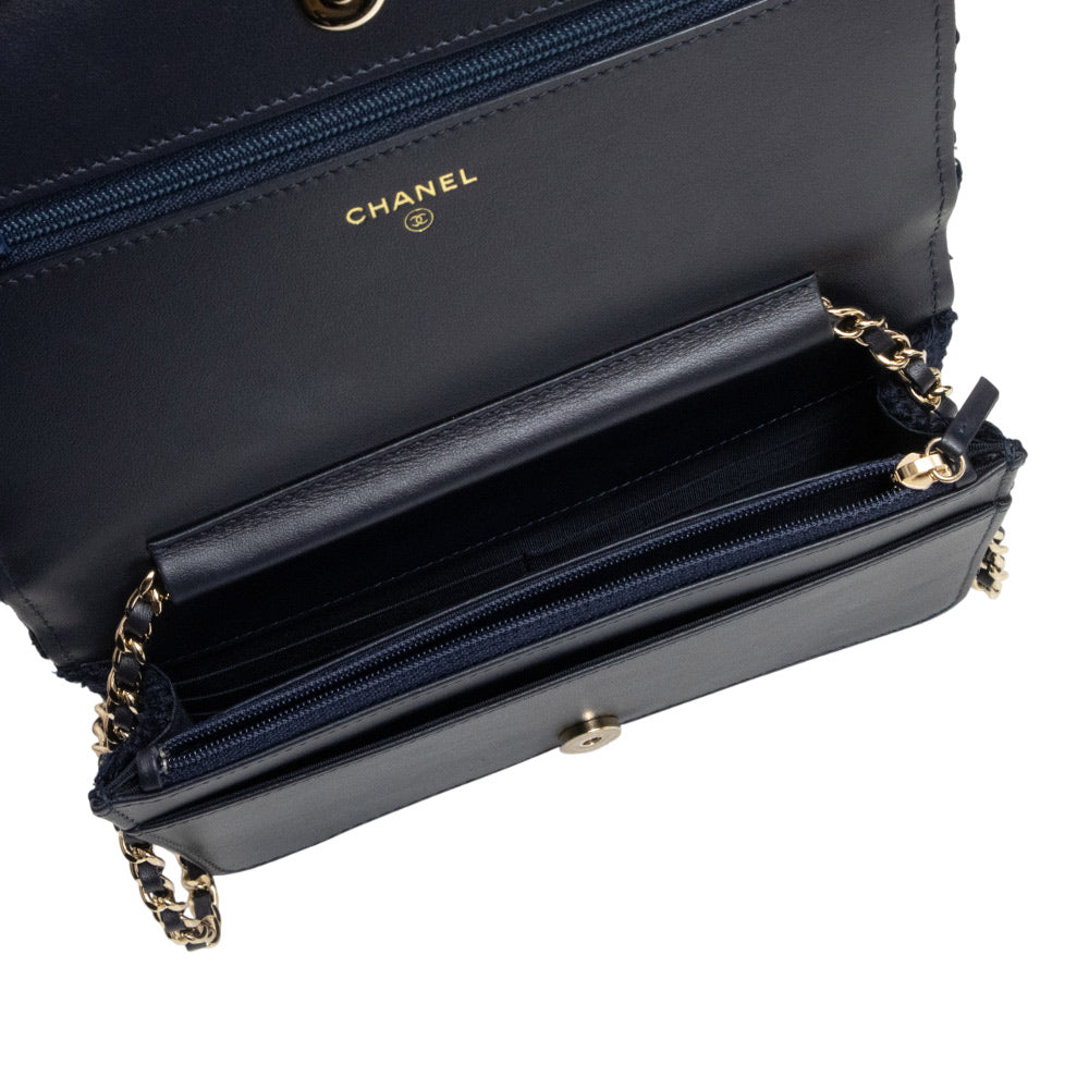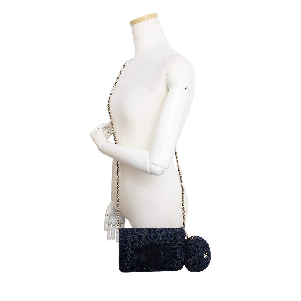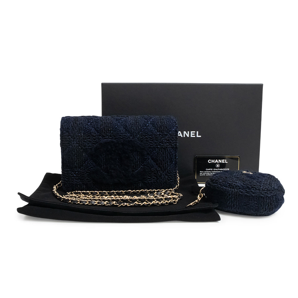 [Unused Display Item] CHANEL Matelasse Coco Mark Chain Wallet Shoulder Bag/Crossbody Long Wallet in Navy Tweed with Champagne Gold Hardware and Pouch