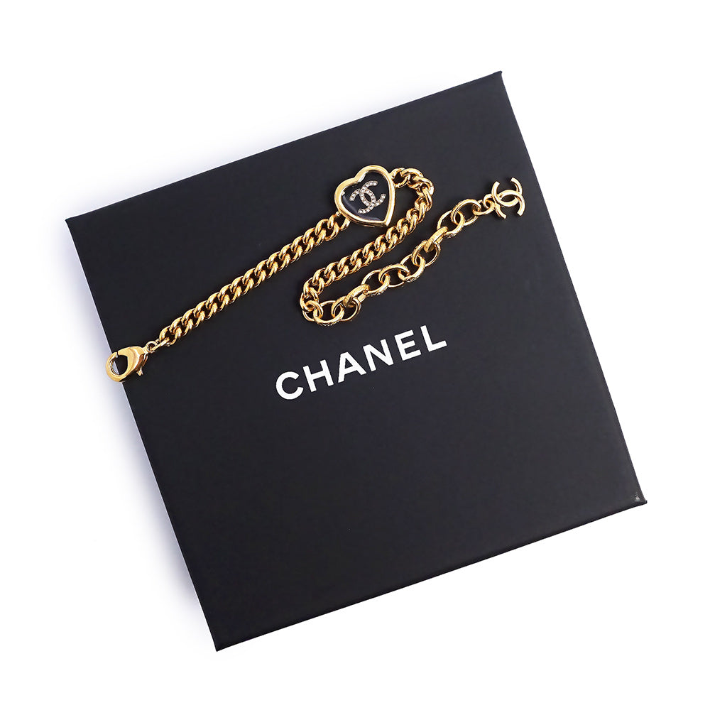 This cute heart-shaped bracelet from Chanel features a rhinestone-adorned CC mark for a charming look. It can be worn for a wide range of occasions, from everyday wear to parties.