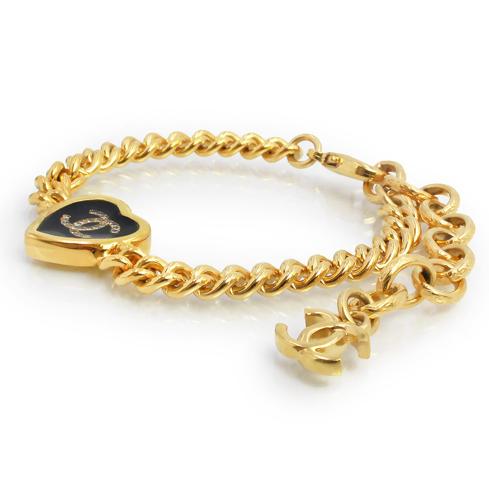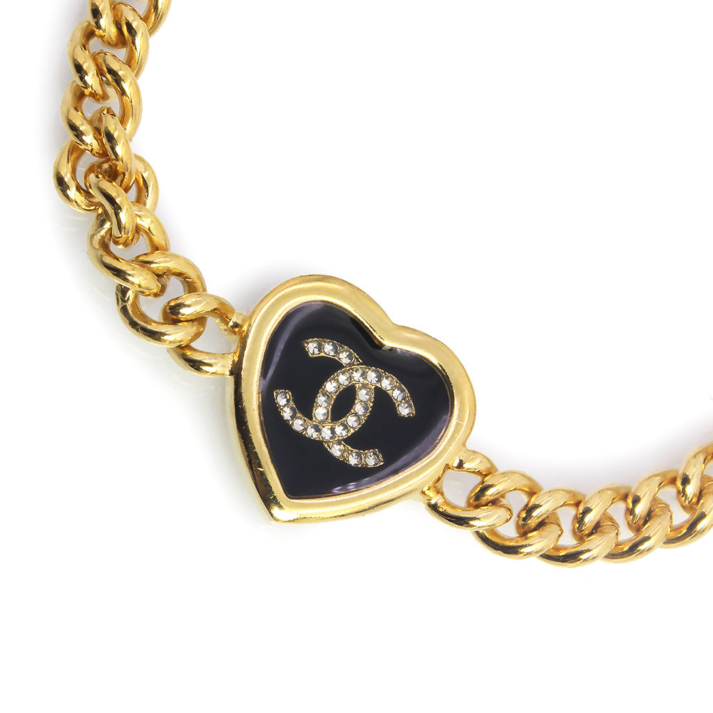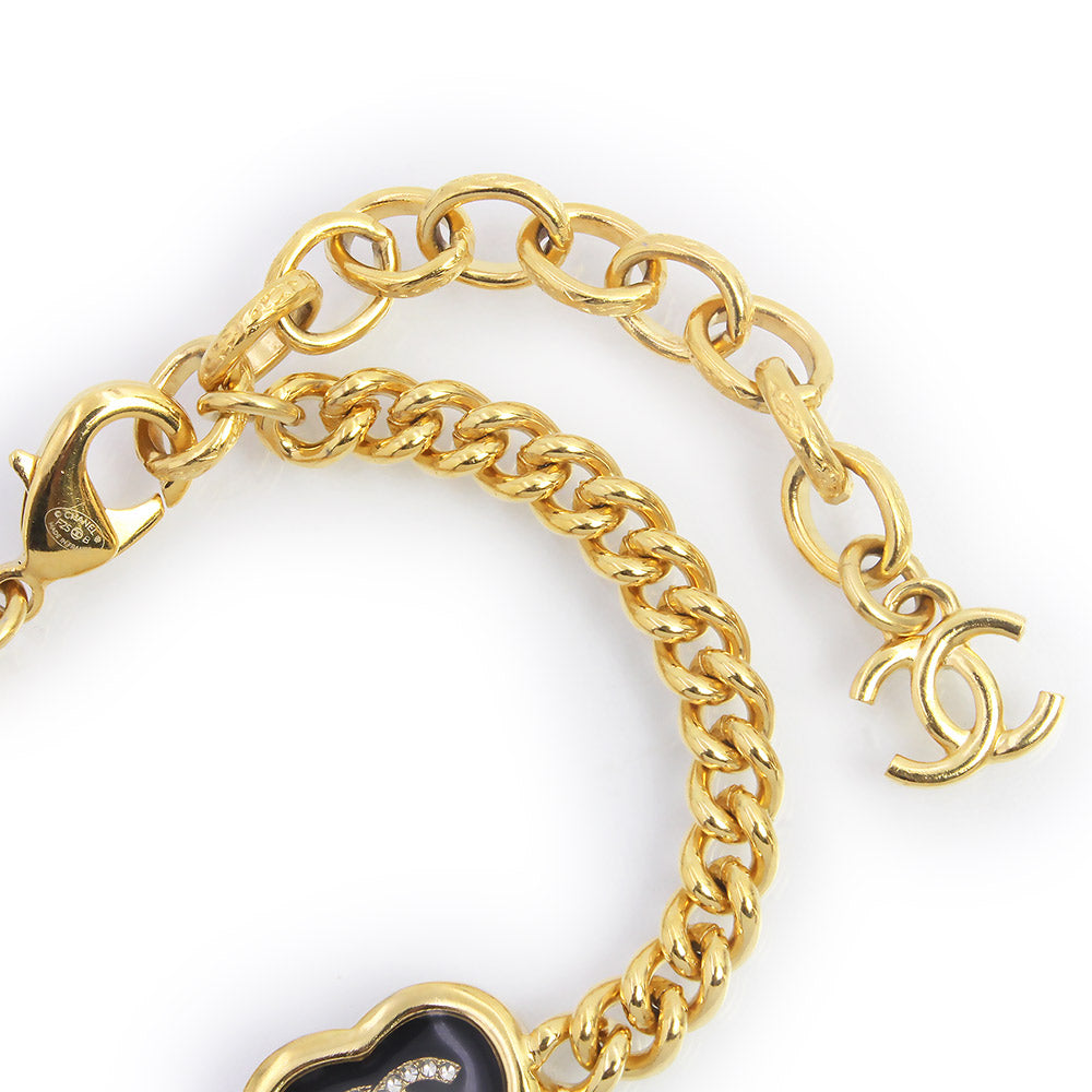 [Excellent Condition] CHANEL ABG320 Coco Mark Rhinestone Heart Gold Black Chain Bracelet with Box