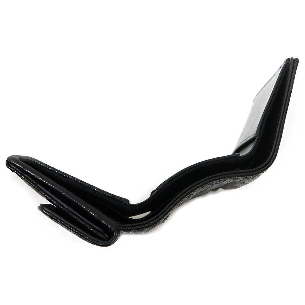 Although it fits in one hand, it has ample storage space with a bill compartment, coin case, and card pockets. This stylish wallet features luxurious black caviar leather and a rhinestone star.