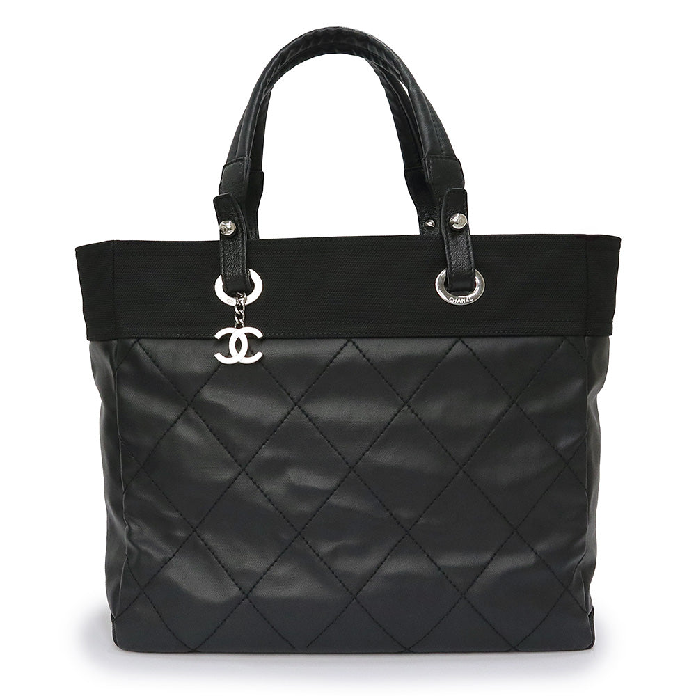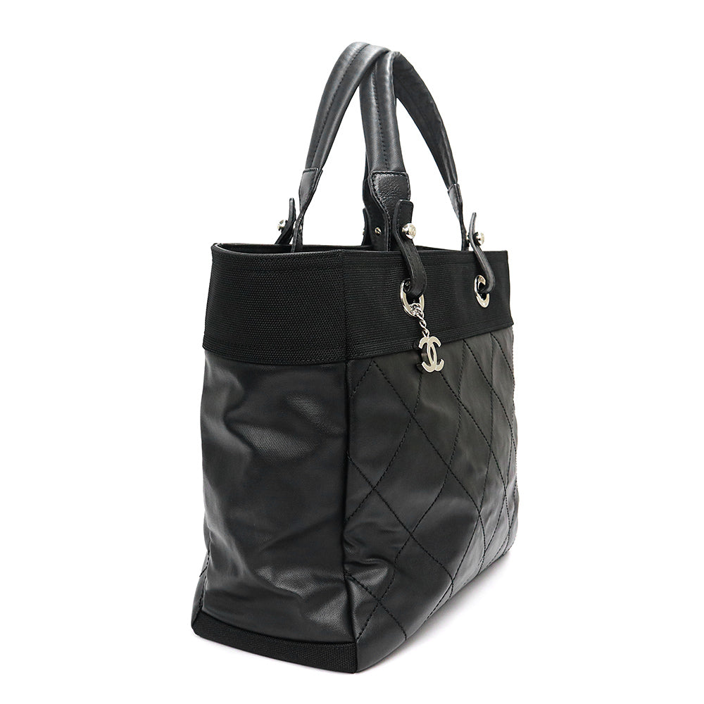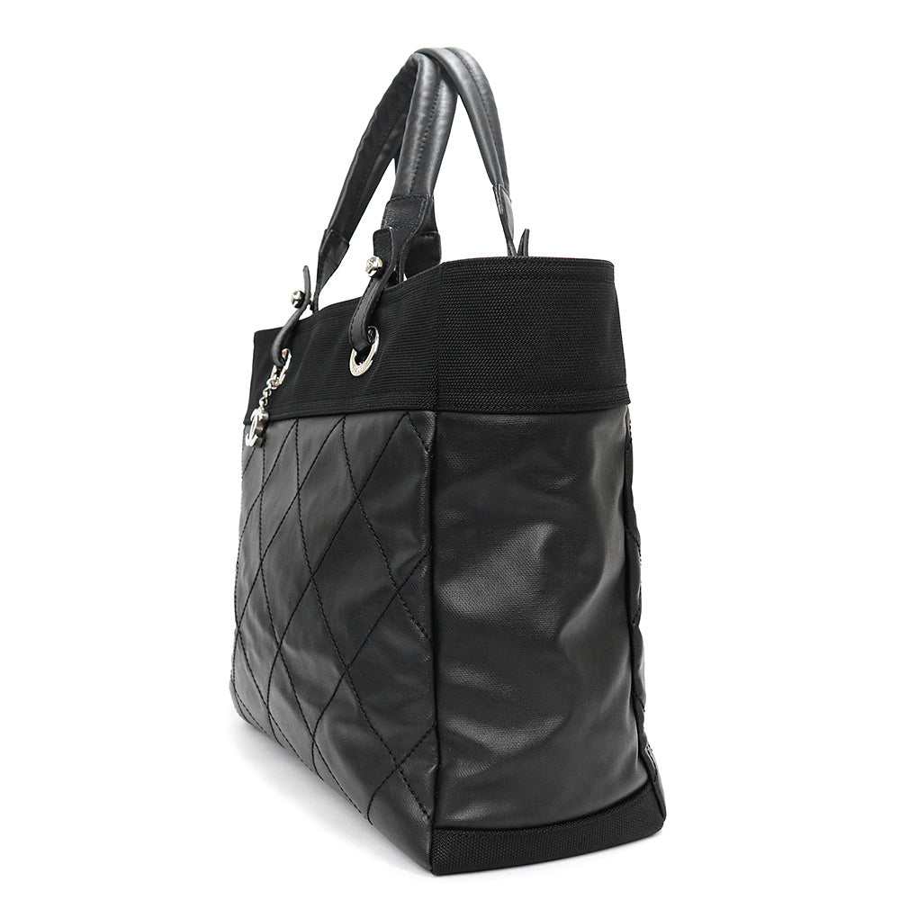 Pre-owned CHANEL Paris-Biarritz Tote MM (A34209) in coated canvas and calfskin leather with silver hardware.