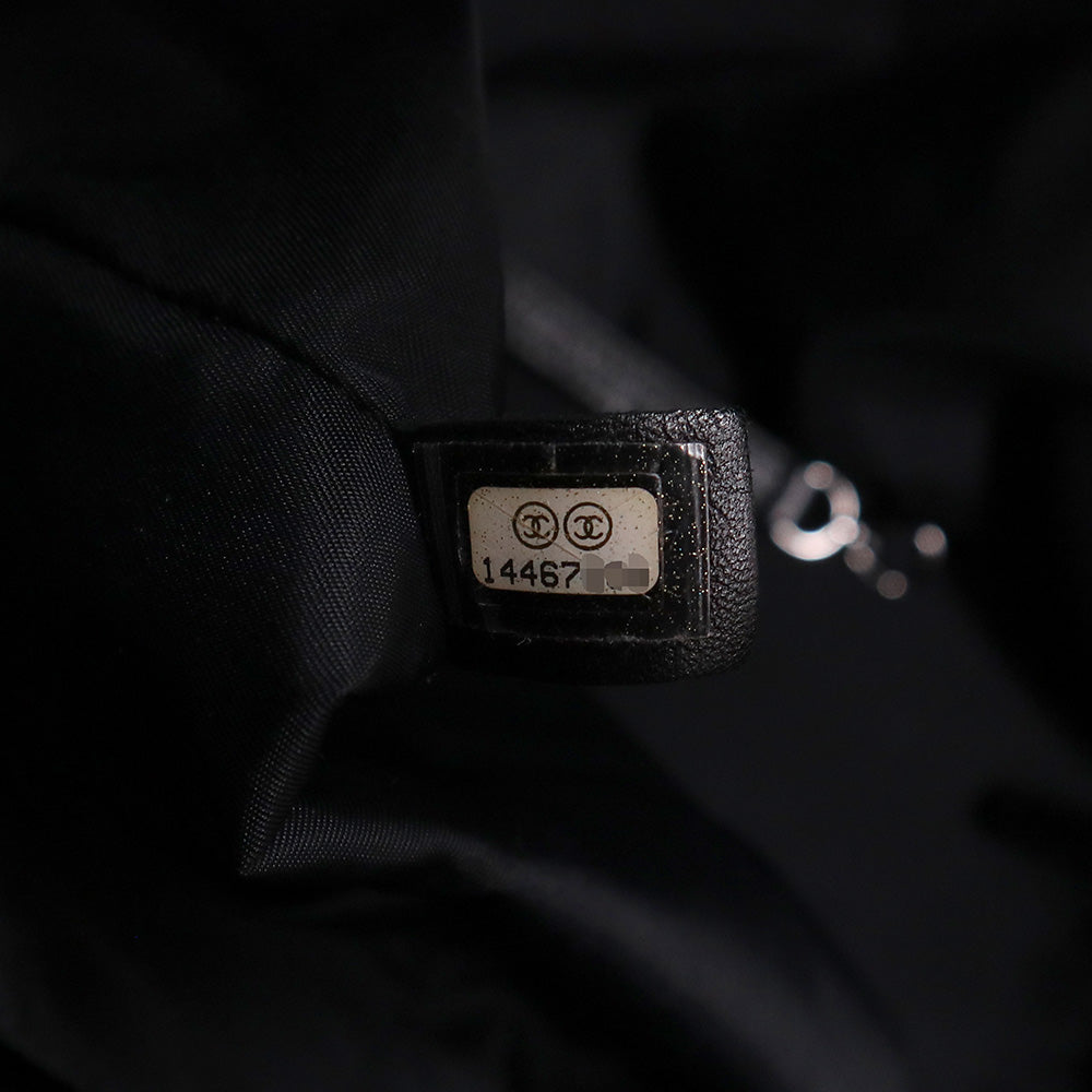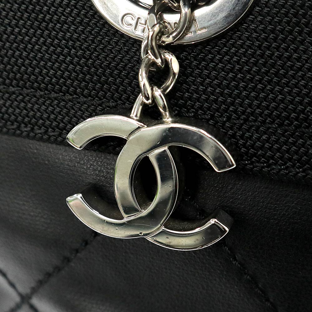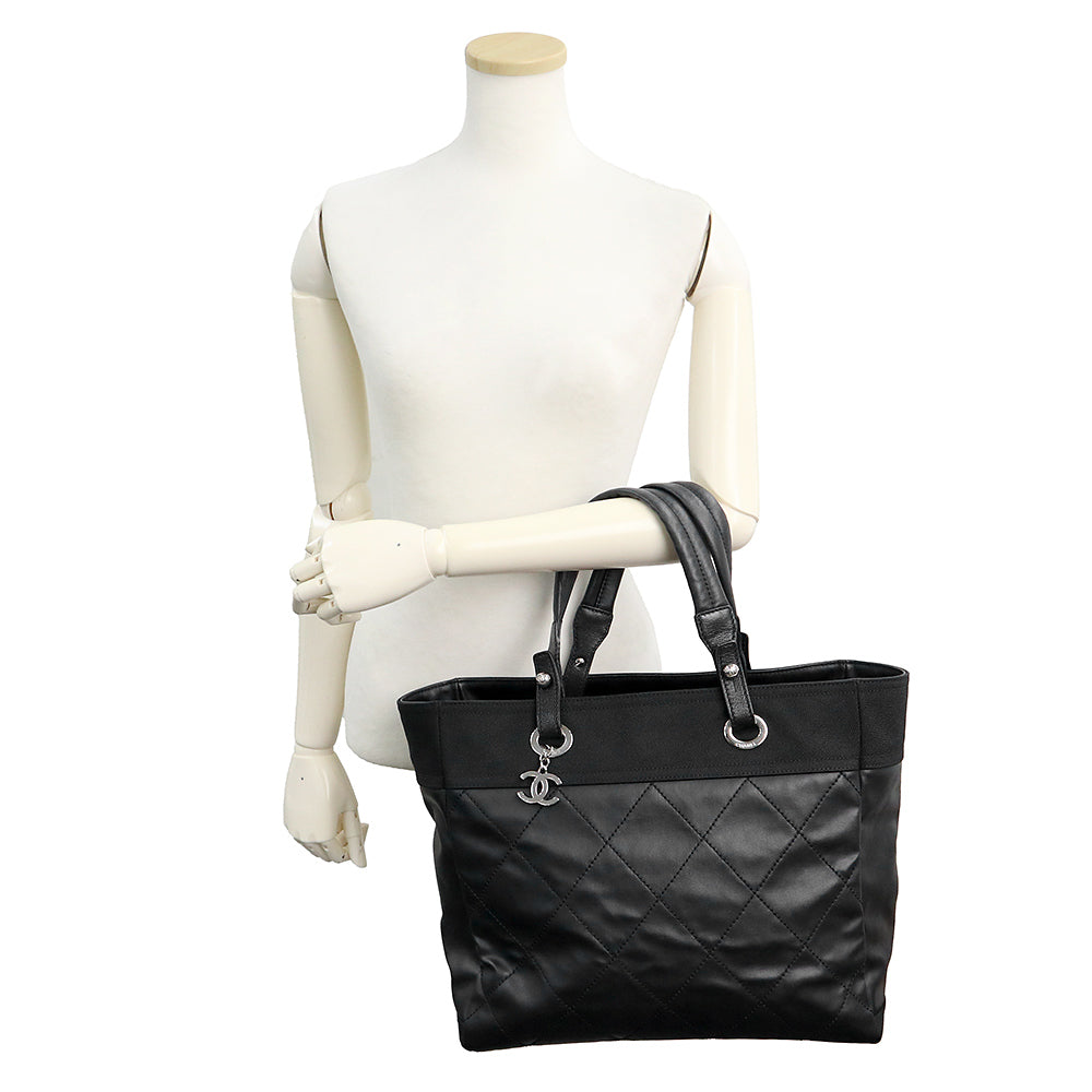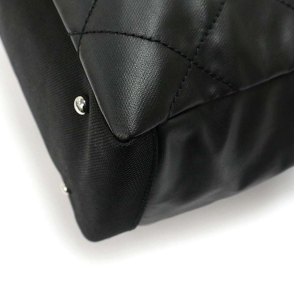 Pre-owned CHANEL Paris-Biarritz Tote MM (A34209) in coated canvas and calfskin leather with silver hardware.