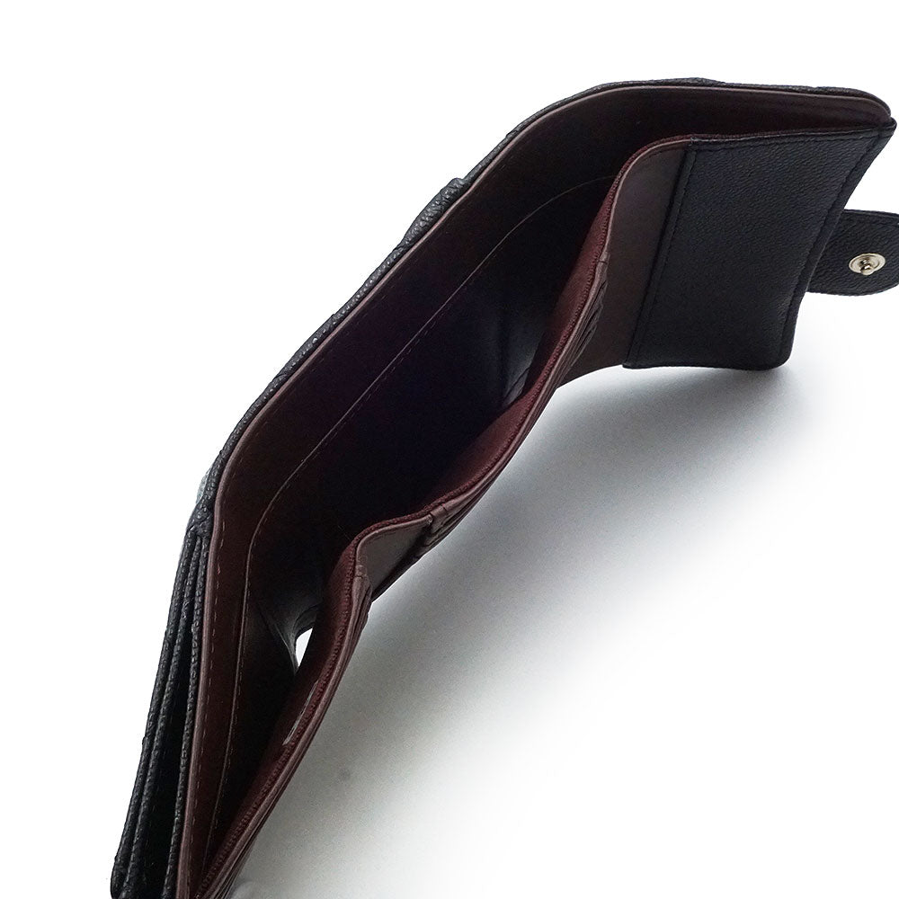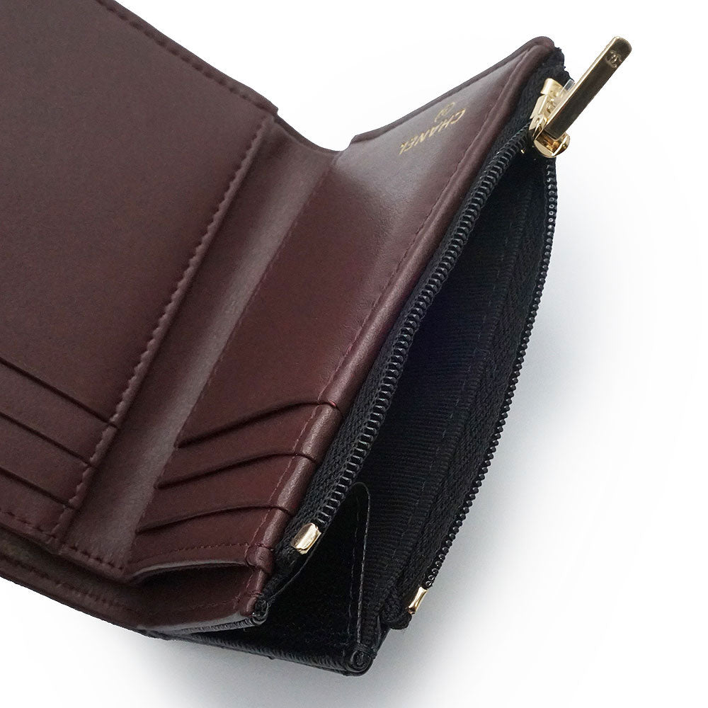 This Chanel tri-fold wallet features a beautiful Coco mark on the front. Its cool black color makes it compact yet stylish and easy to use. |