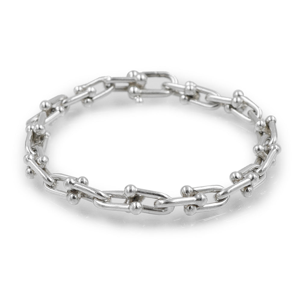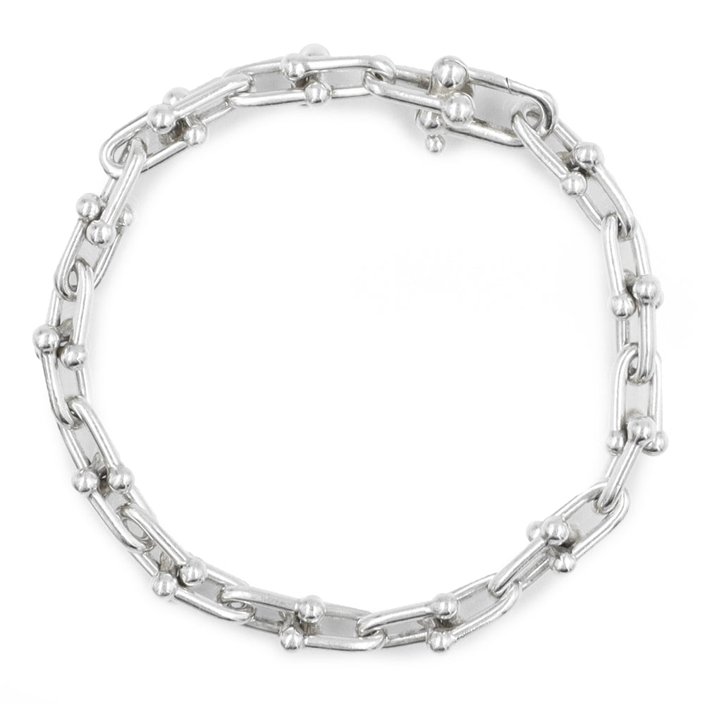 Tiffany HardWear embodies the spirit of the New York woman who boldly confronts life's challenges, exuding a rebellious elegance. This sophisticated bracelet features the collection's iconic gauge links. |