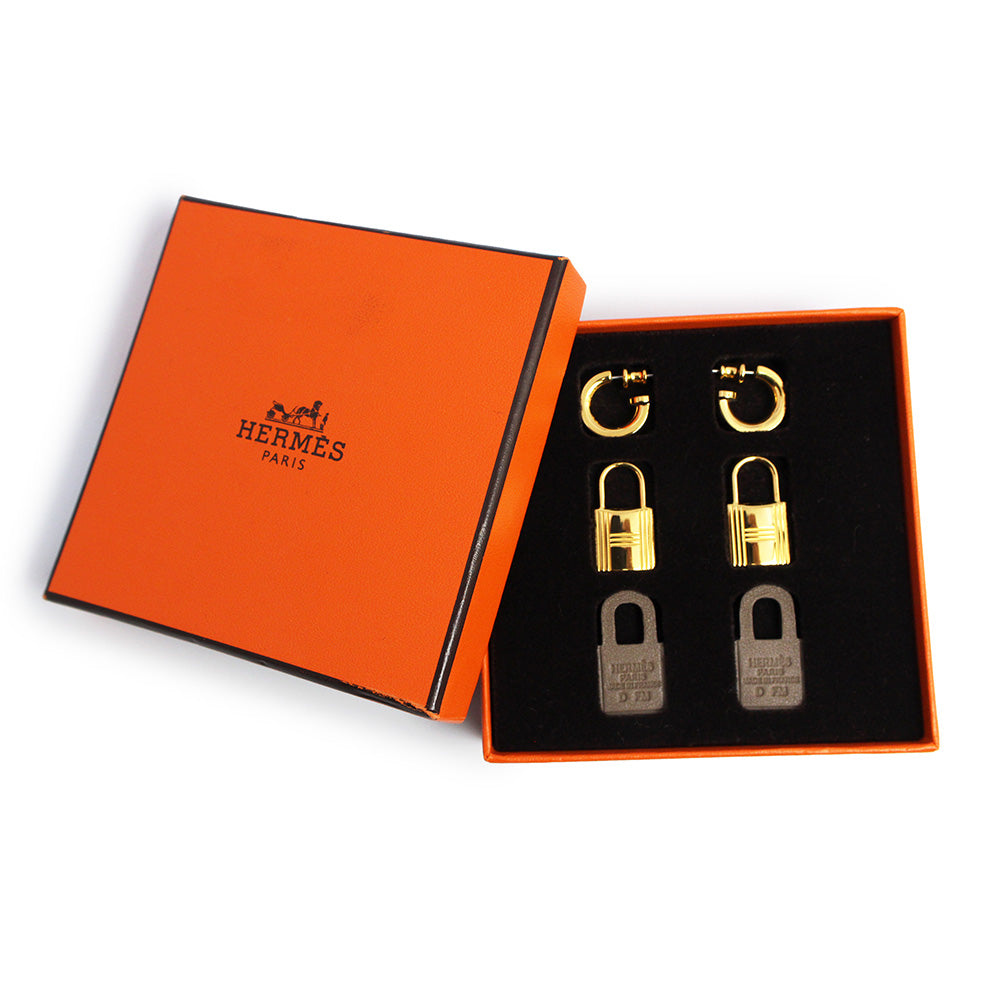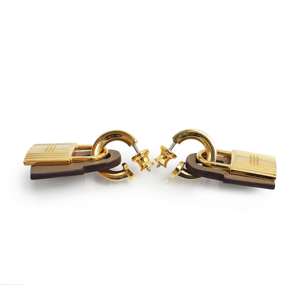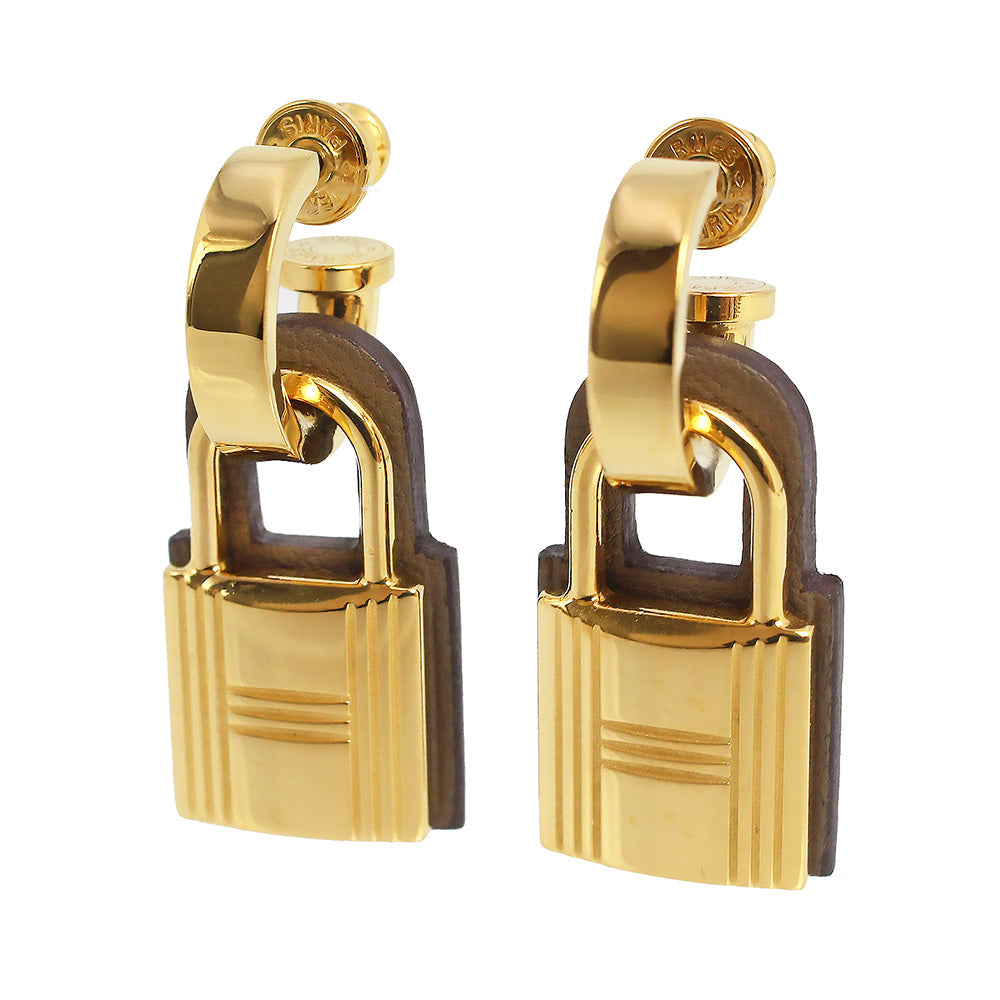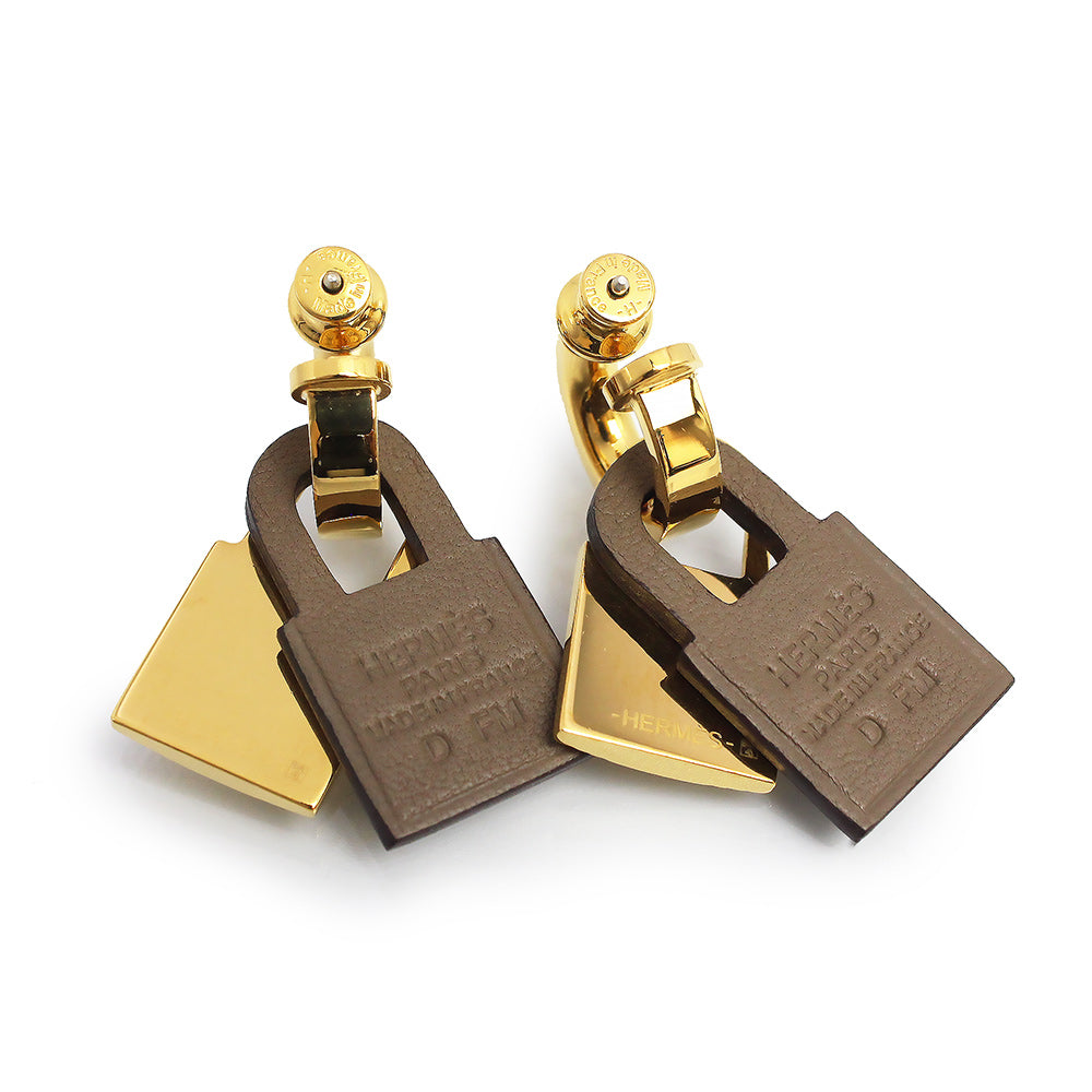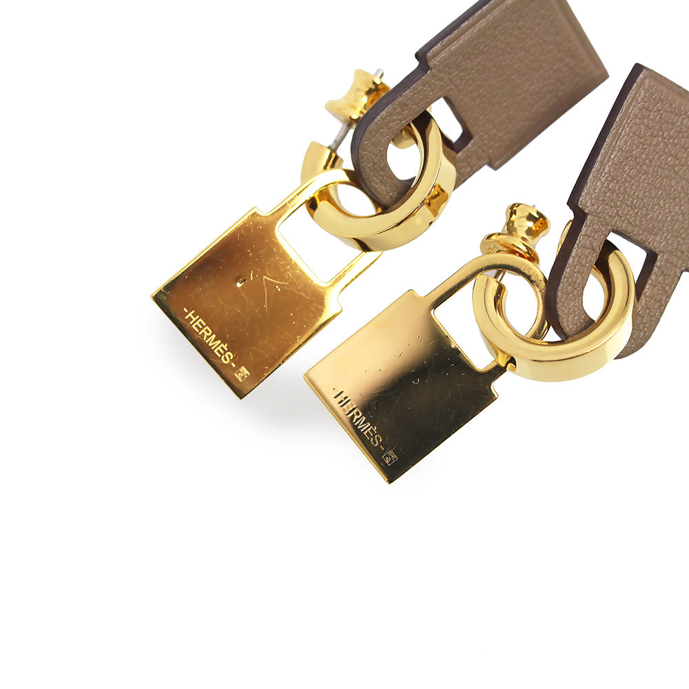 Pre-owned Hermès O'Kelly Cadena Earrings in Swift Leather, Etoupe Leather, Greige, Gold Hardware, D Stamp, with Box