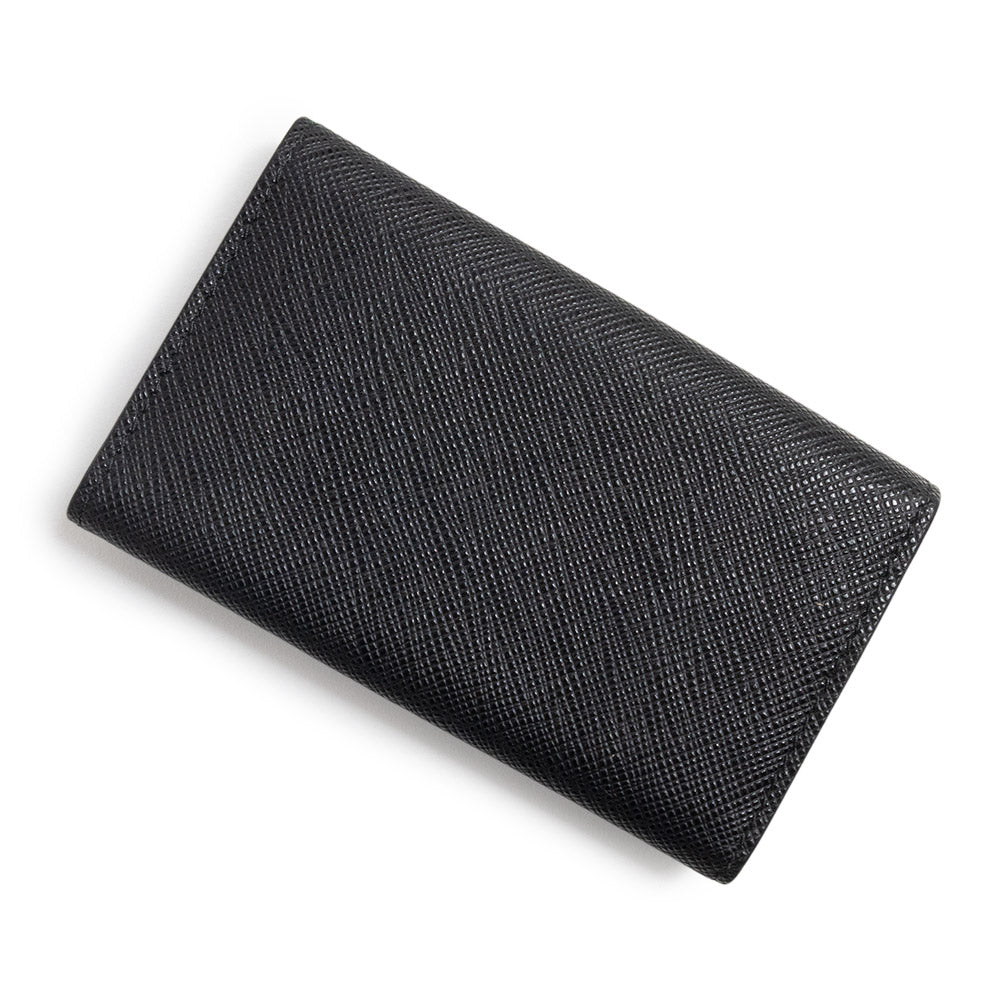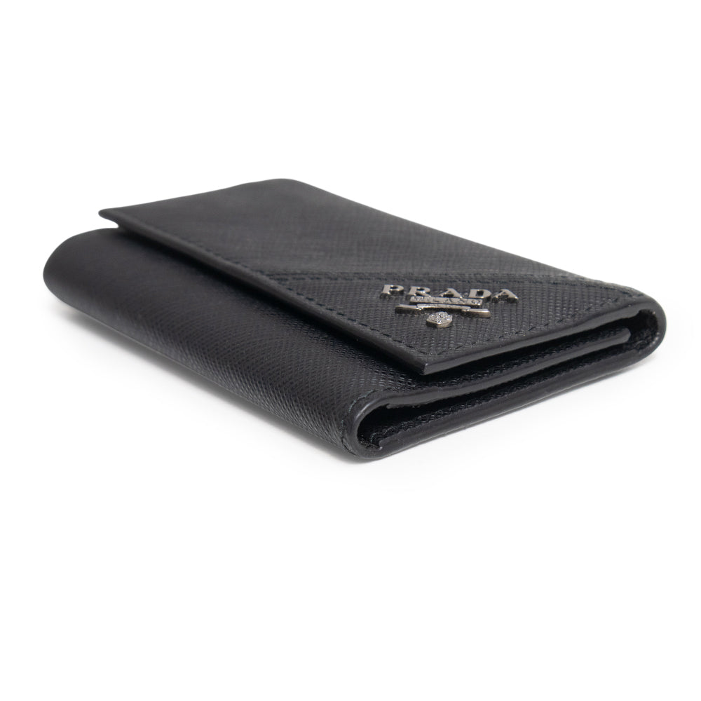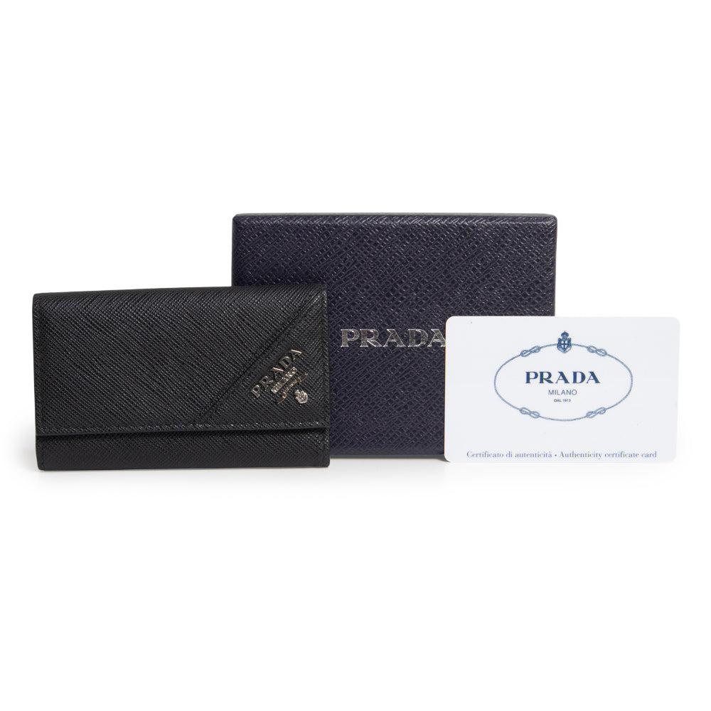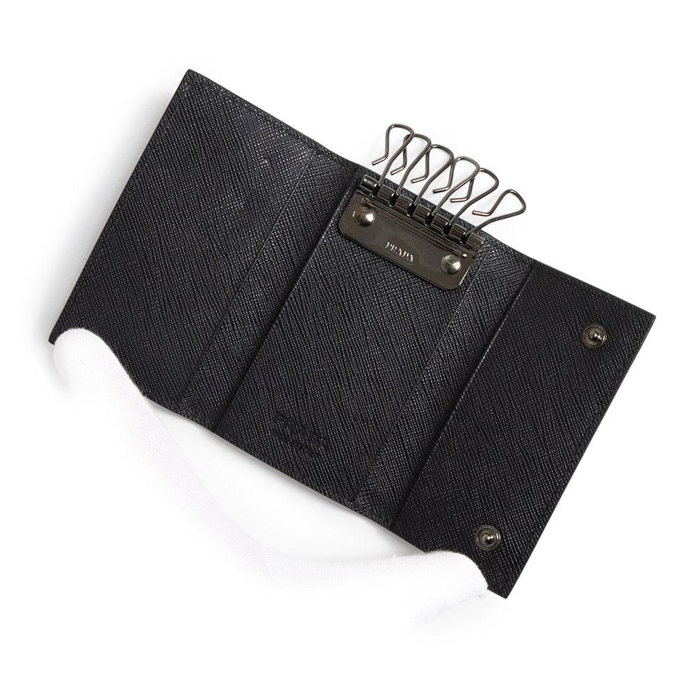 This sophisticated key case features Prada's signature Saffiano leather, accented with a Prada metal logo at the corner of the flap, a snap closure, six key hooks, and two fabric-lined pockets.
