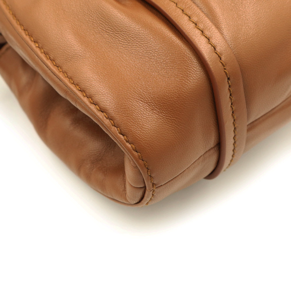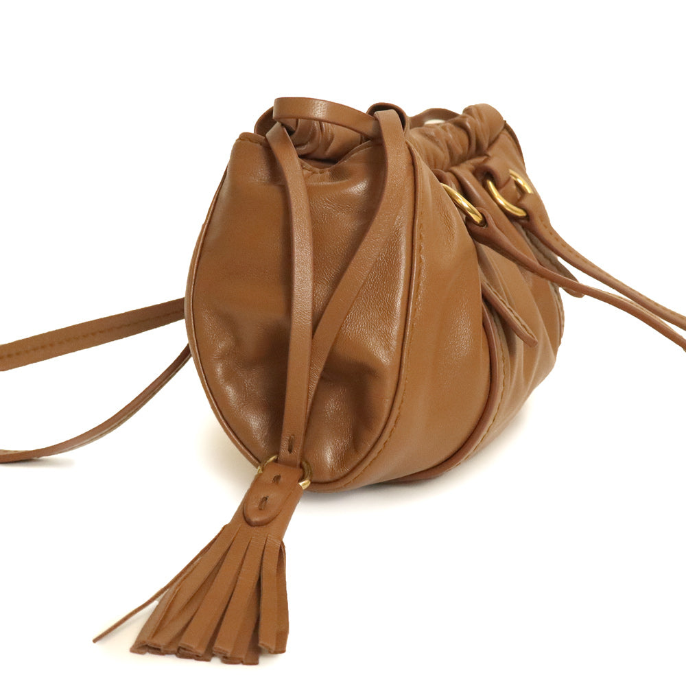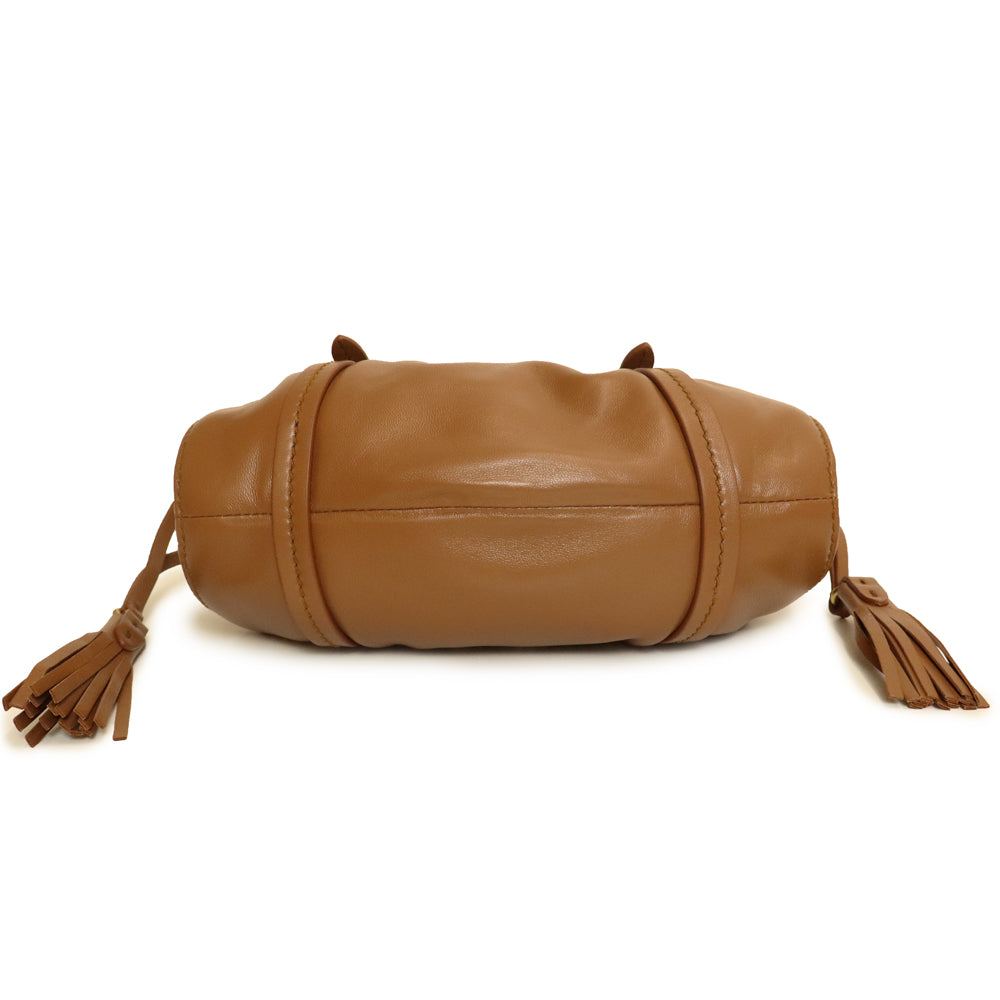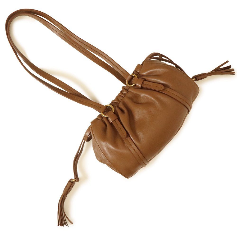 Crafted from soft nappa leather with a gathered top, it features a tassel pendant at the side, gold-tone logo lettering at the front, and a handle for carrying by hand or over the shoulder.