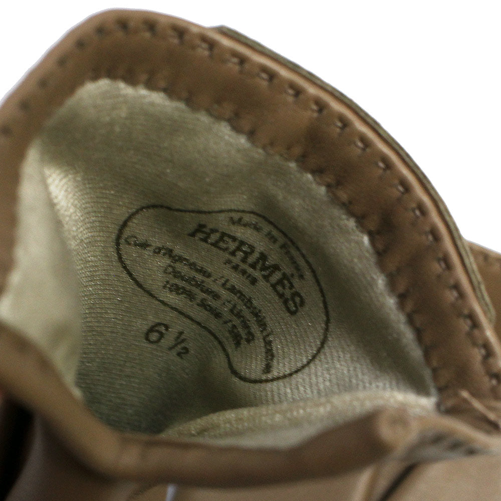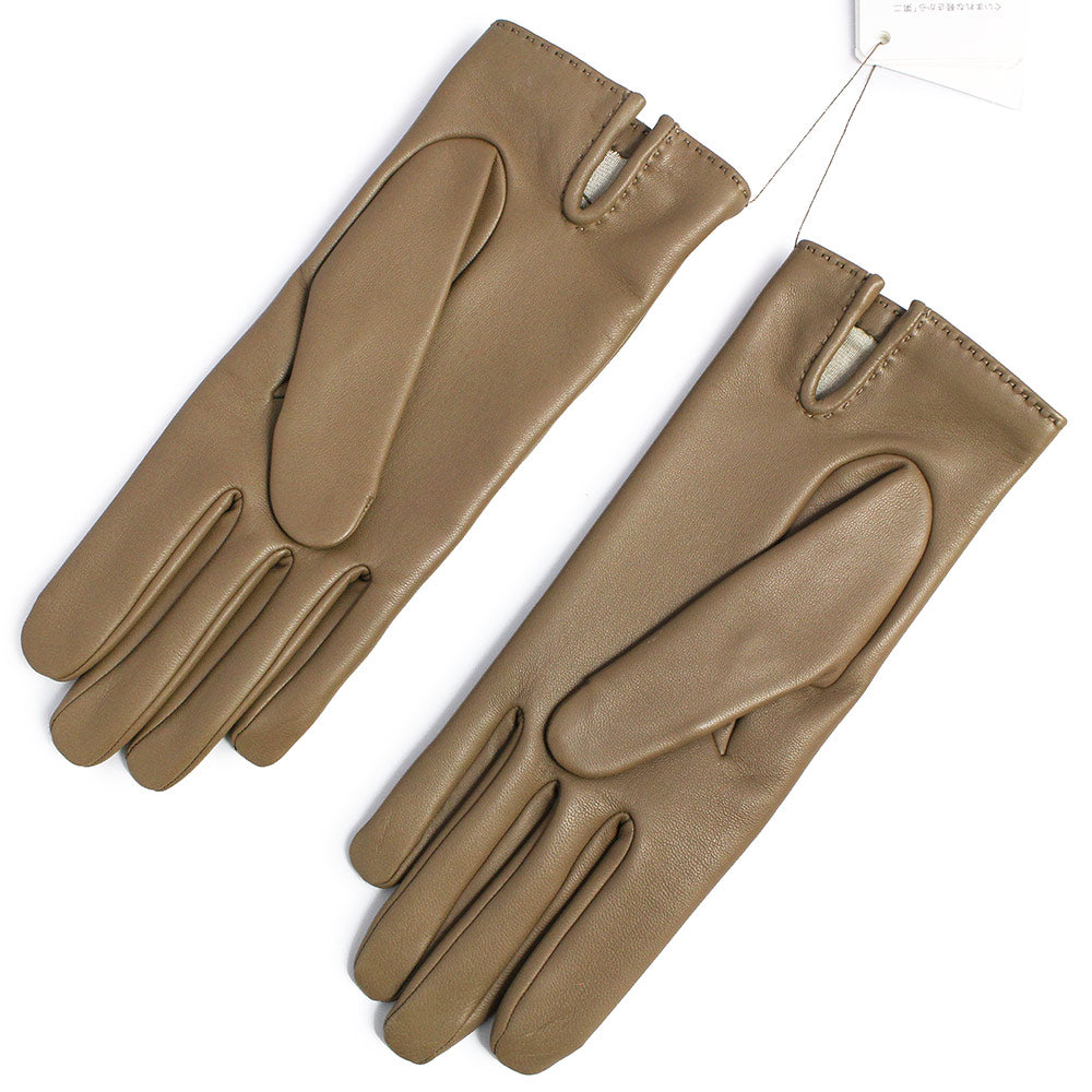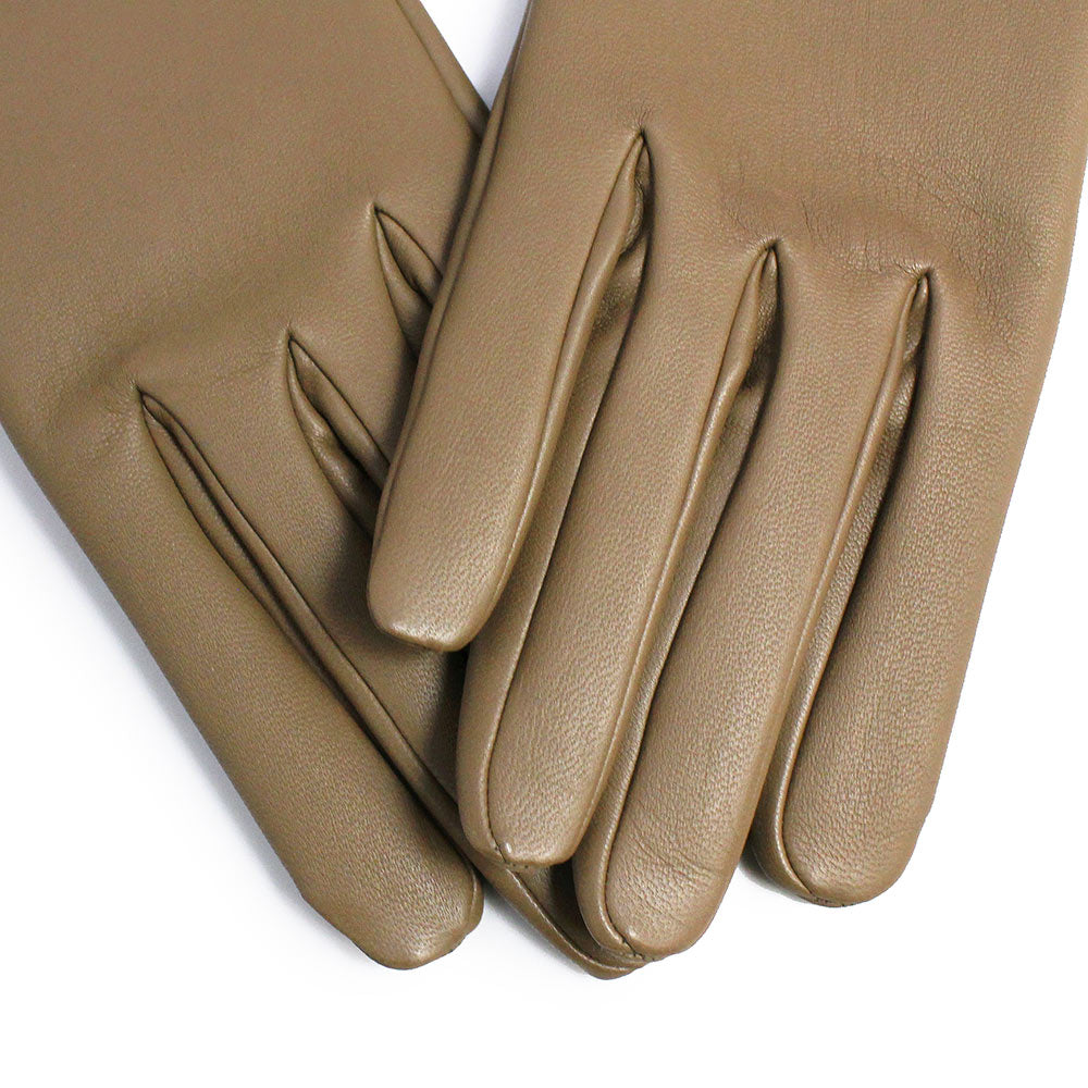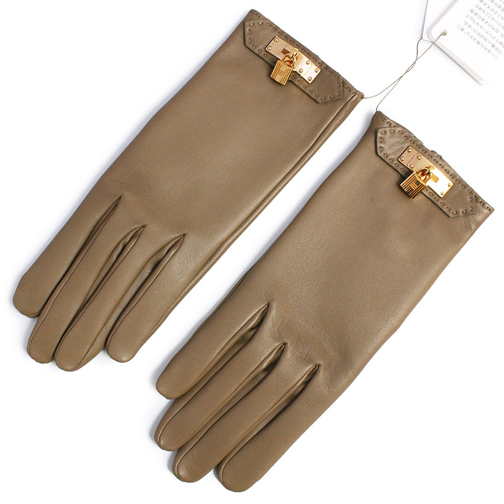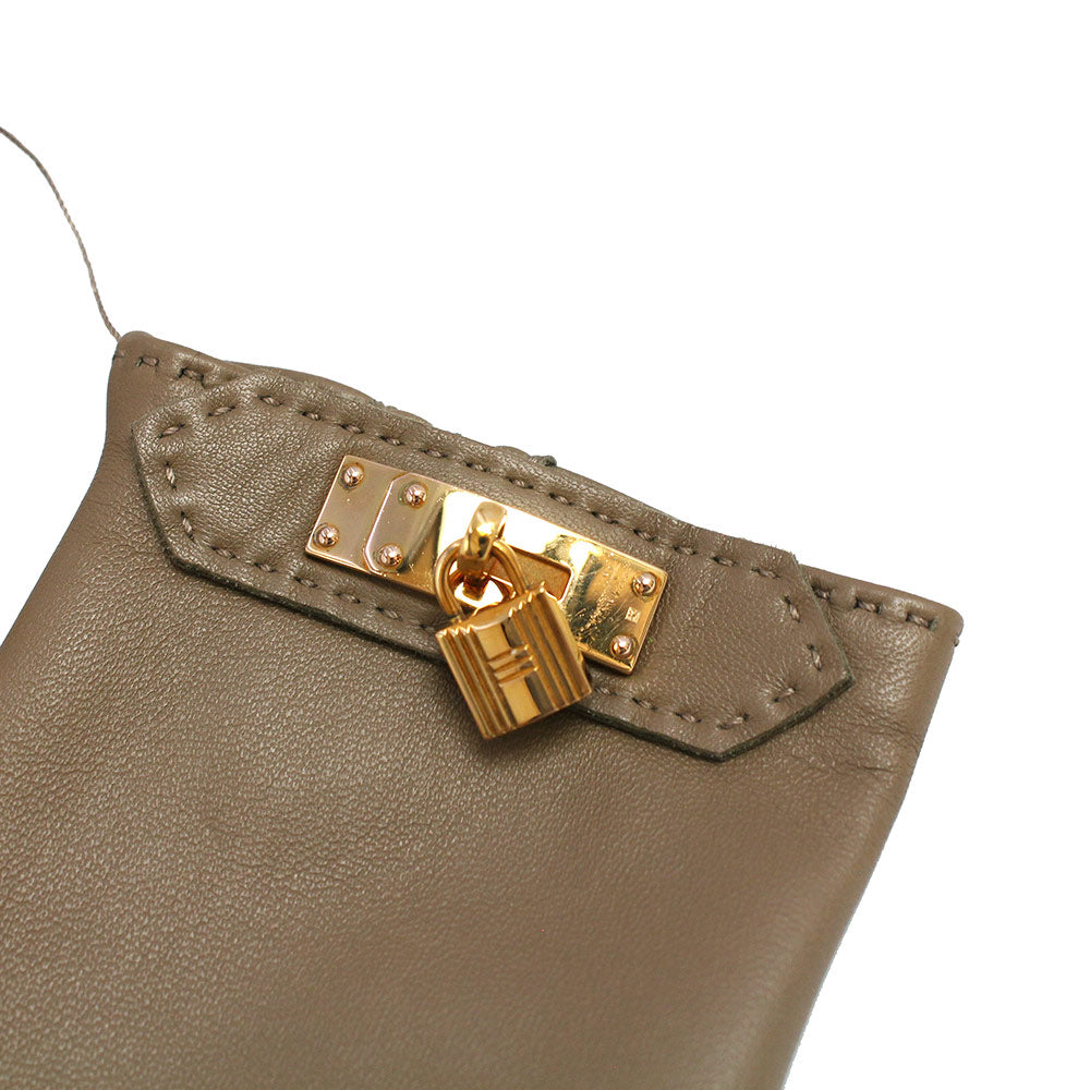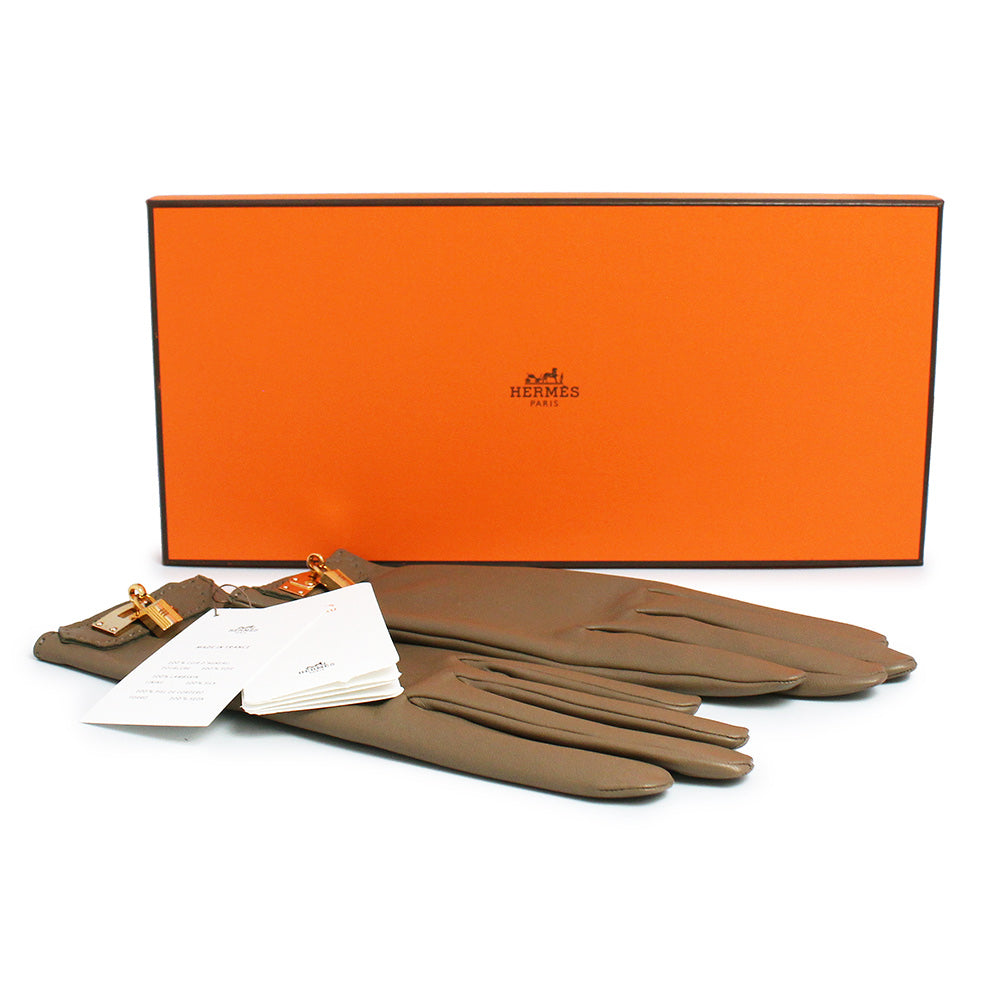 [Unused and stored] Hermès Kelly Soya Gloves #6 1/2, Lambskin Leather, Etoupe, Greige, Gold Hardware, Box Included