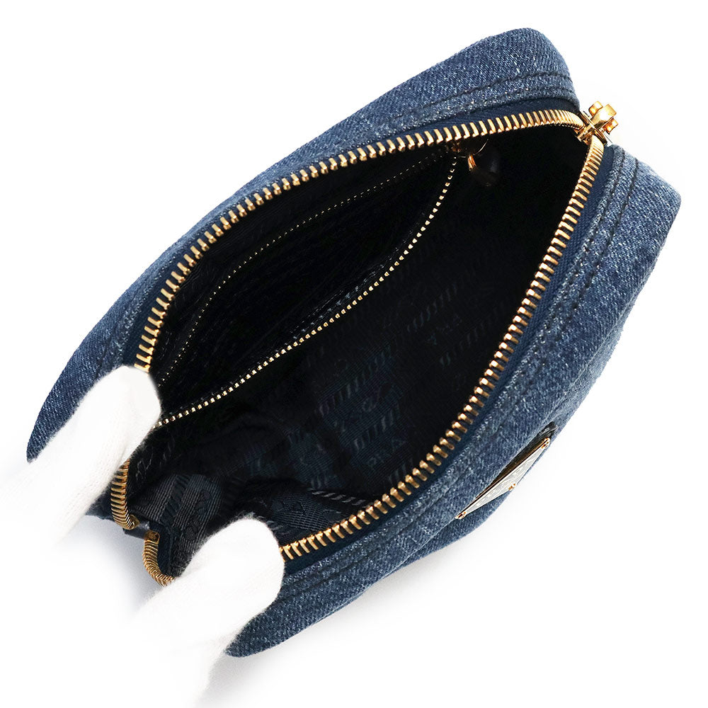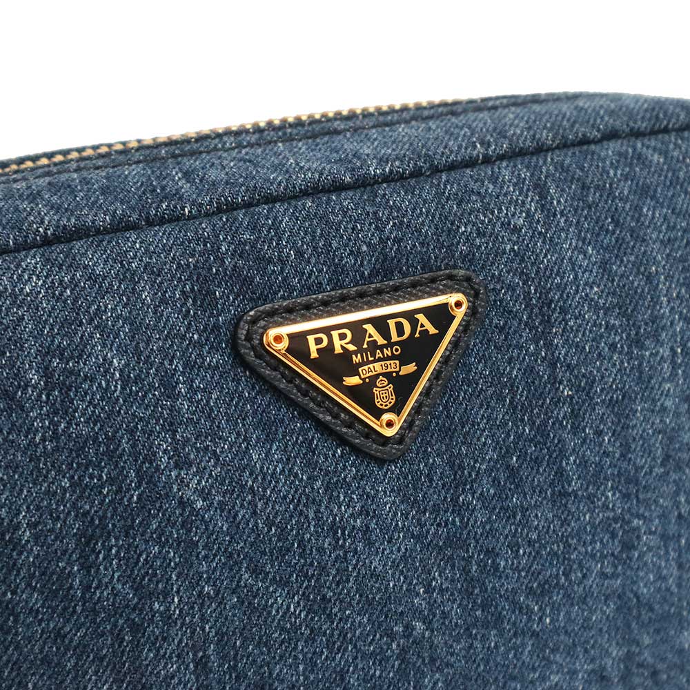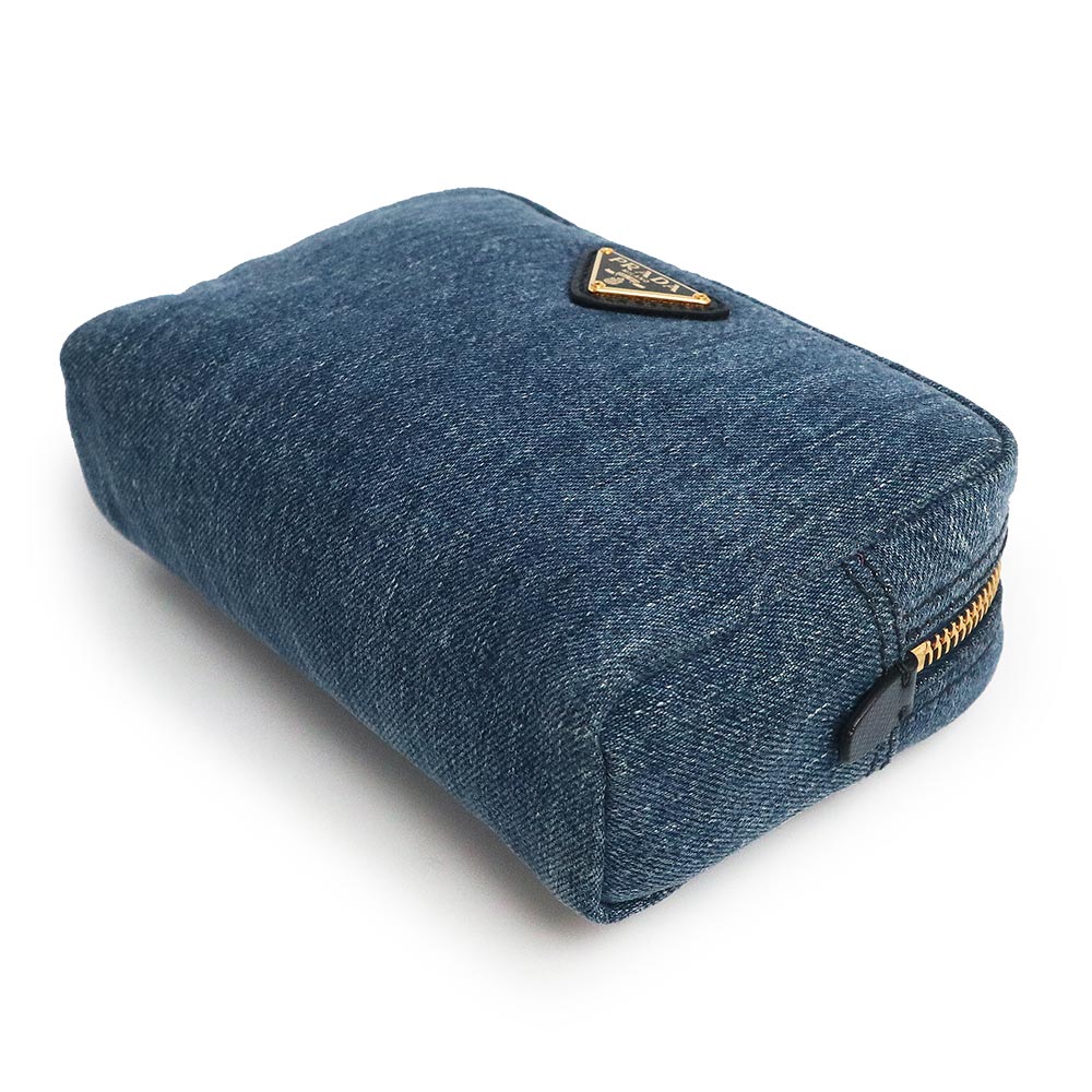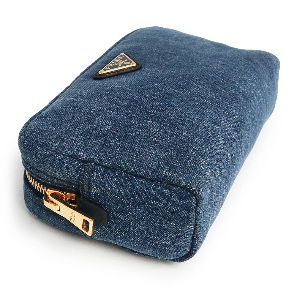 [Unused Display Item] Prada Triangle Logo Cosmetic Makeup Pouch, Blue Denim with Gold Hardware, 1NA021