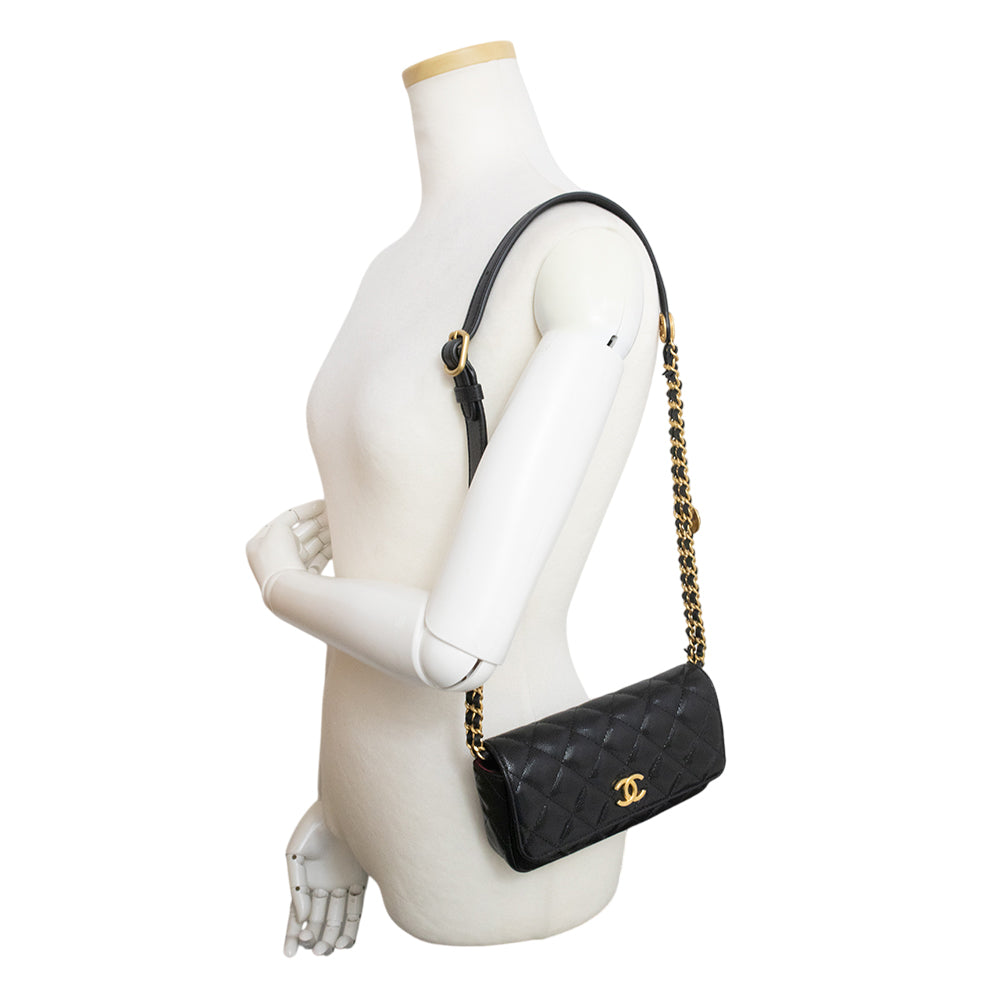 This mini flap chain shoulder bag is crafted from soft CHANEL caviar leather. The shoulder strap is a combination of double chain and leather, accented with a Coco Mark coin motif. |