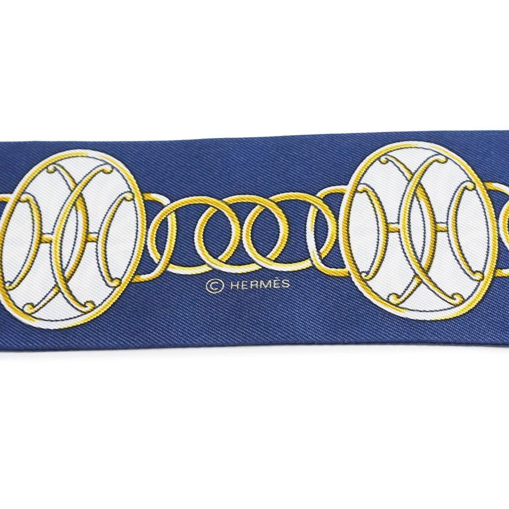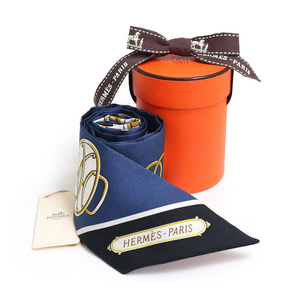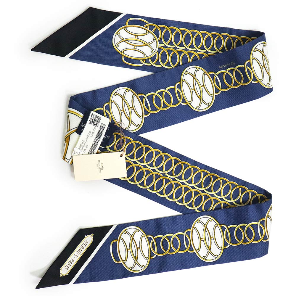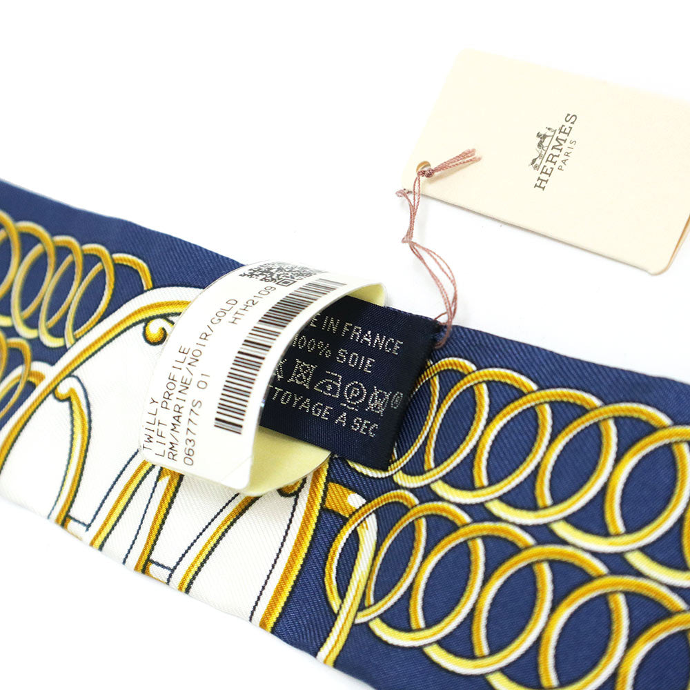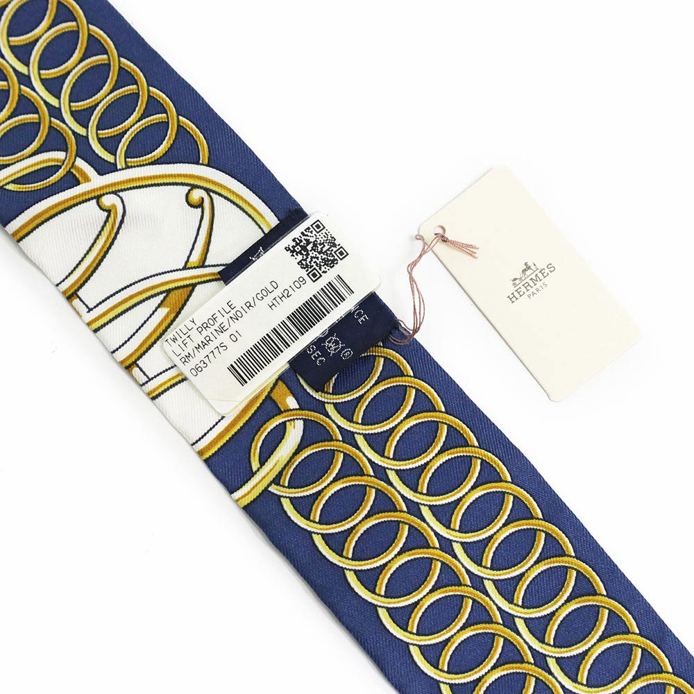 [New and unused] HERMES Twilly Lift Profile 100% Silk Scarf in Marine Noir Gold and Blue Ribbon. Box included.