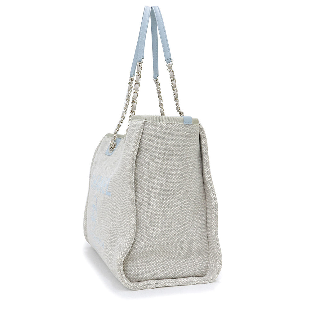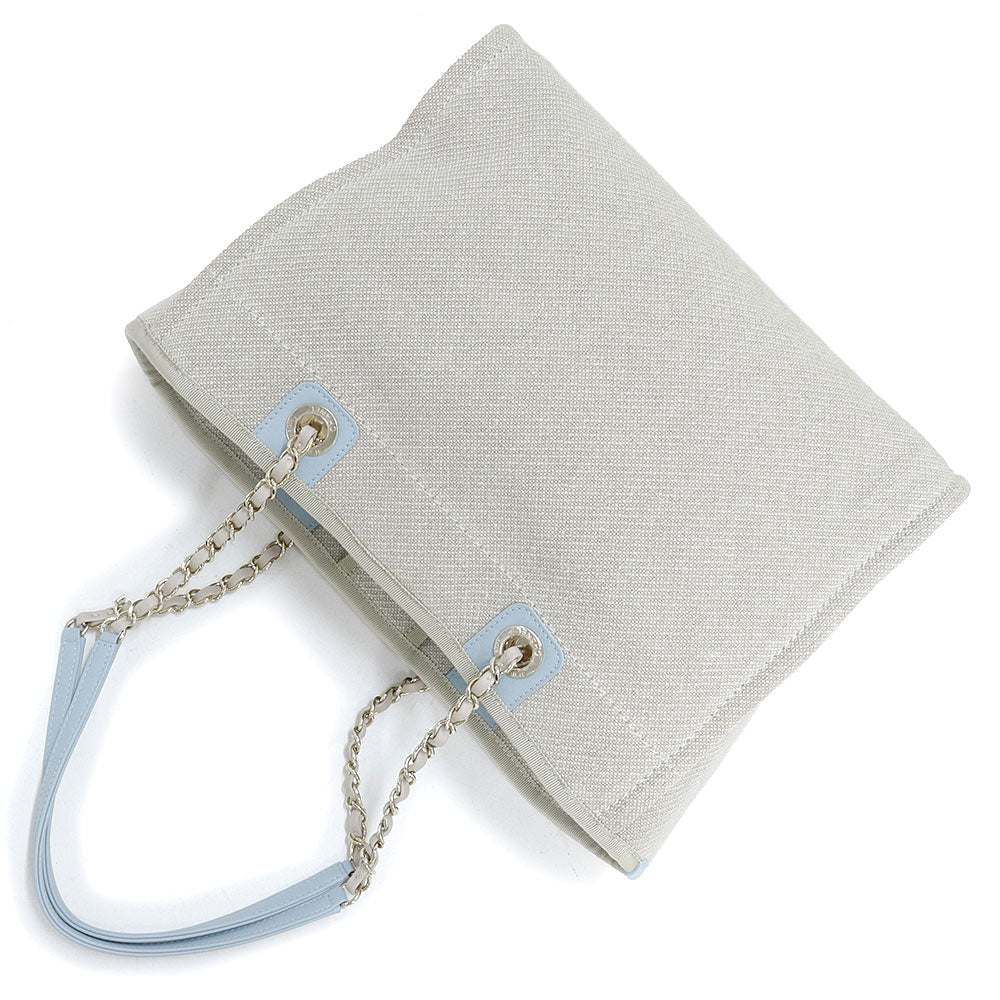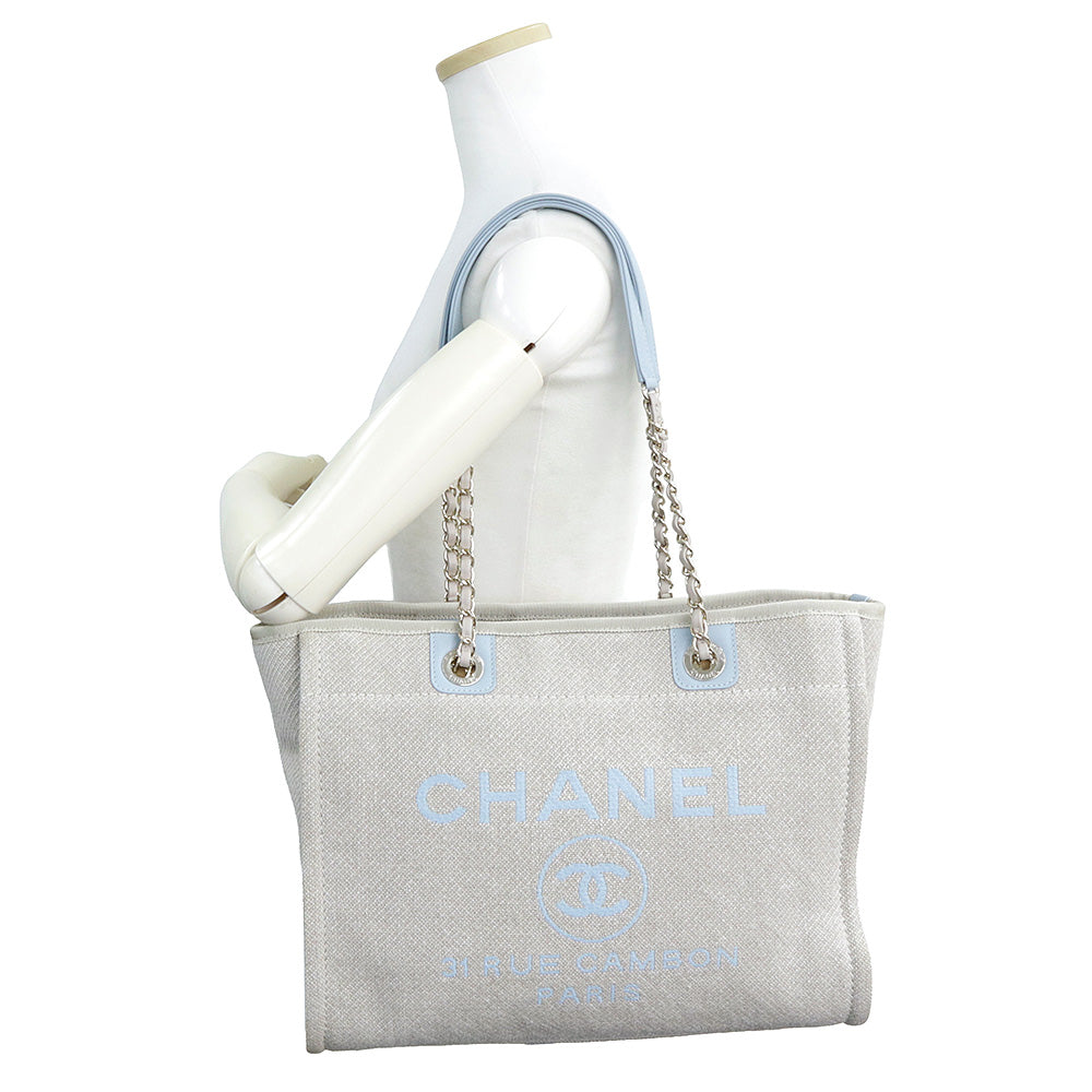 [Unused Display Item] CHANEL Coco Mark Chain Deauville MM Tote Bag, Canvas, Leather, Beige, Light Blue, Light Gold Hardware, A67001, Box Included