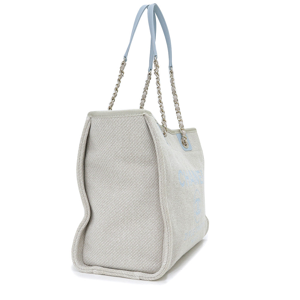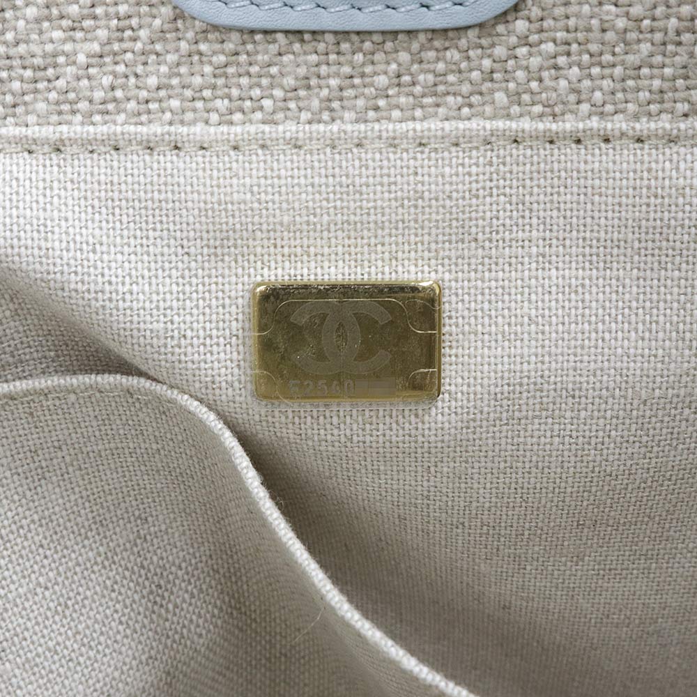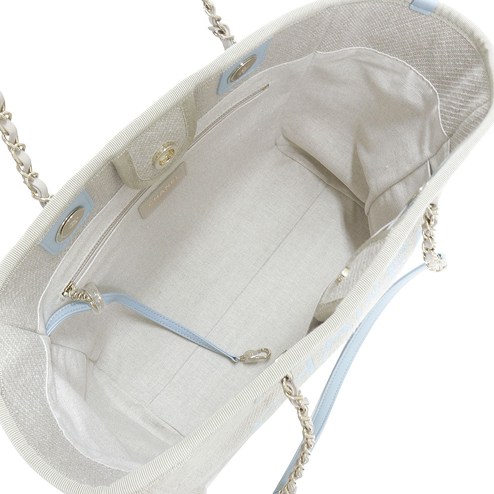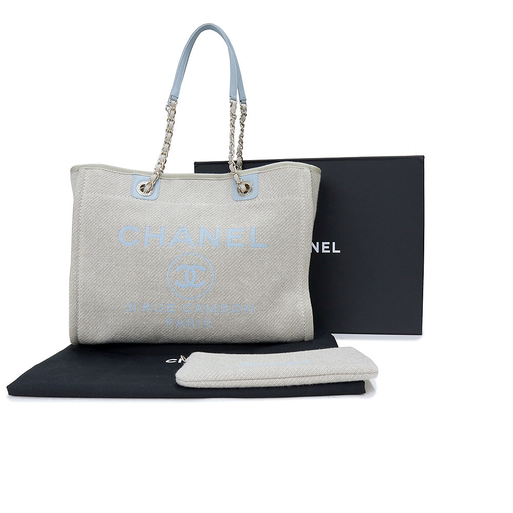 [Unused Display Item] CHANEL Coco Mark Chain Deauville MM Tote Bag, Canvas, Leather, Beige, Light Blue, Light Gold Hardware, A67001, Box Included