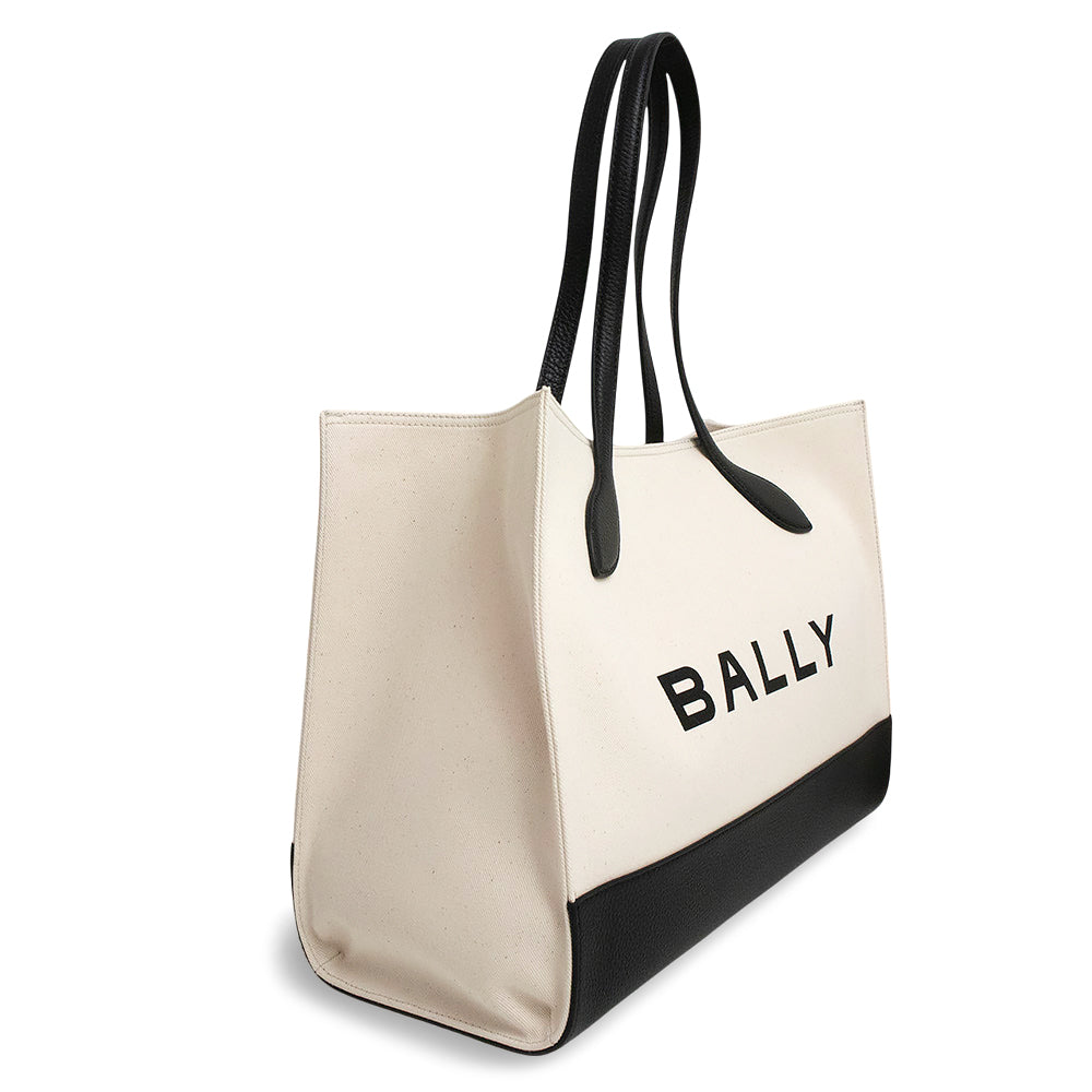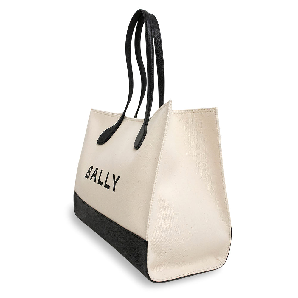 This classic Bally fabric tote bag is accented with a black logo and features a neutral design perfect for everyday use. |