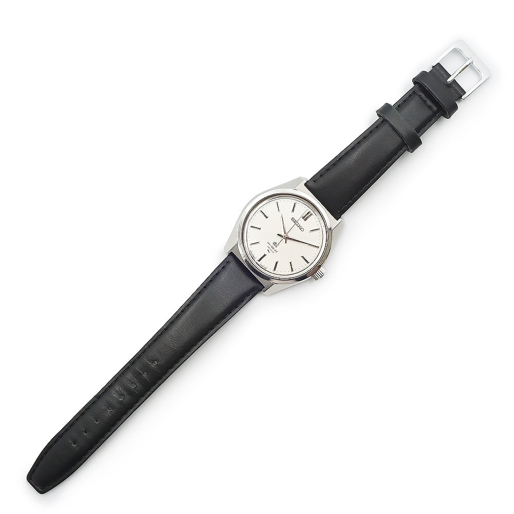 現在も歴史を刻み続けるグランドセイコーの腕時計。文字盤はシンプルなシルバーにバーインデックスの使いやすい組み合わせ。ムーブメントは手巻き36000振動の4520Aを搭載しています。