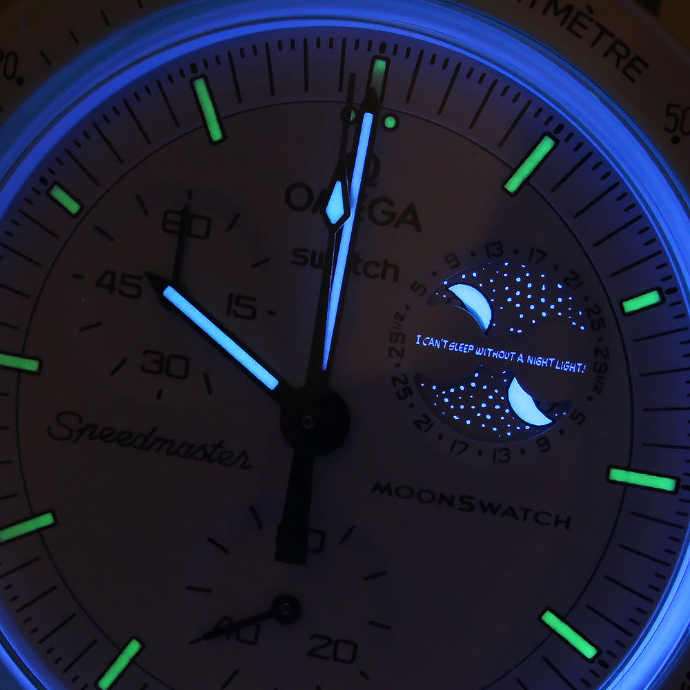 This innovative collaboration between OMEGA and Swatch features a watch in solid white, showcasing the full moon. Snoopy, who has been involved in manned space missions since the 1960s, is depicted reclining on the moon on a moving moon phase disc within the subdial at 2 o'clock. When illuminated by ultraviolet light, the unique subdial reveals a famous quote from Snoopy's comic strip, hidden among the crescent moon and stars. |