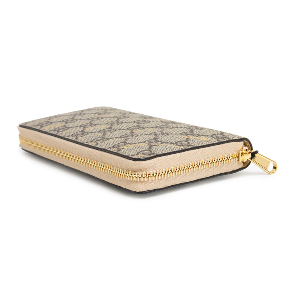 This round zipper long wallet is made from "GG SUPREME," a canvas fabric with Gucci's iconic GG pattern coated using an environmentally friendly process, and features a gold horsebit print. It is a highly durable and popular wallet not only for its design but also for its ample storage capacity. |