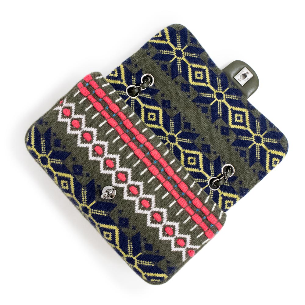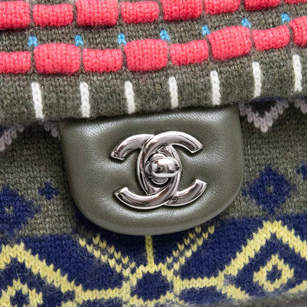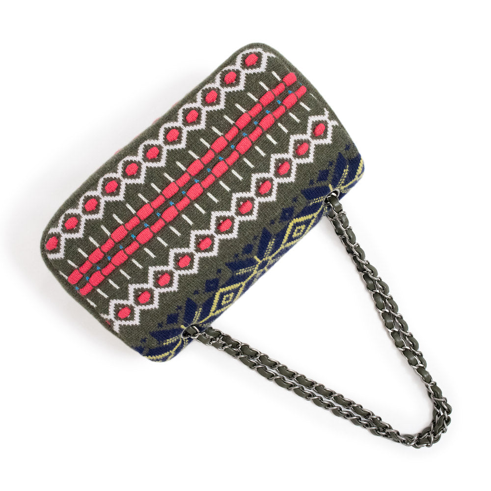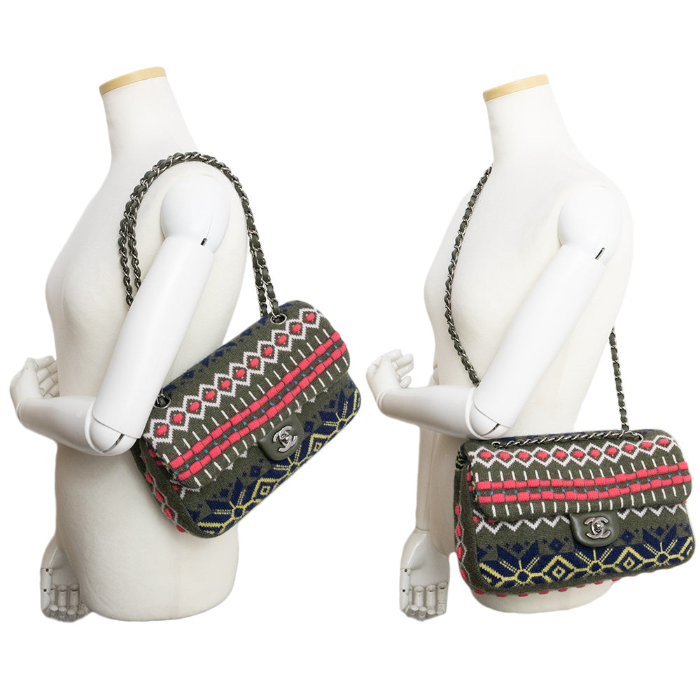This adorable Chanel knit bag features a three-dimensional Nordic pattern. Its casual design and size make it perfect for everyday use or going out. You can also use it as a clutch bag by tucking away the chain. |