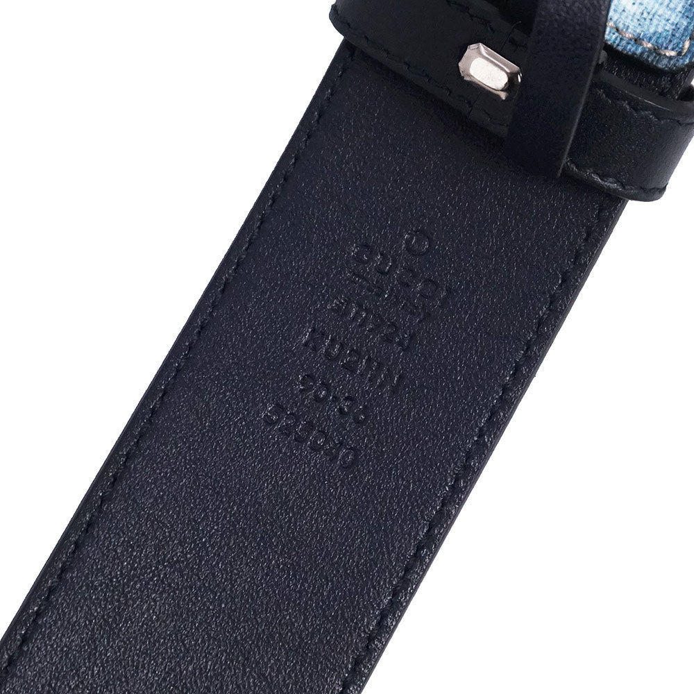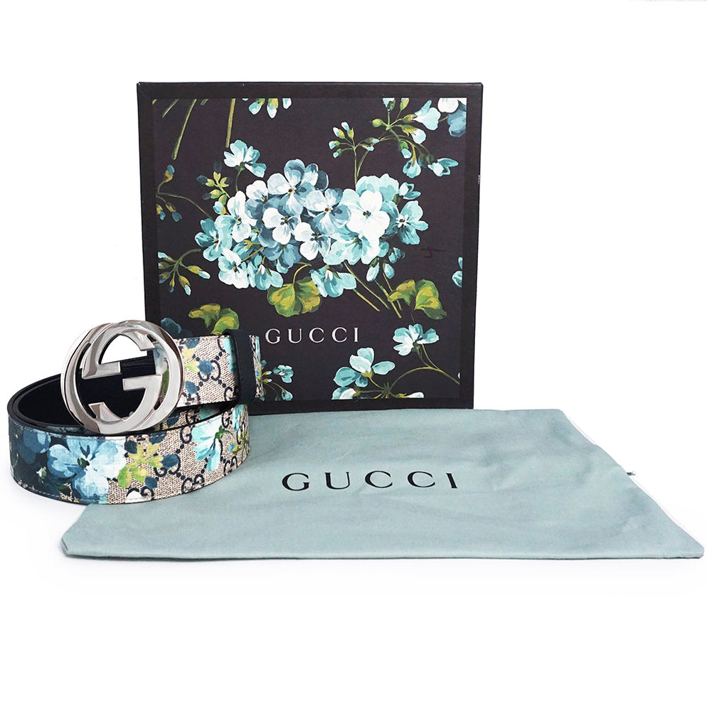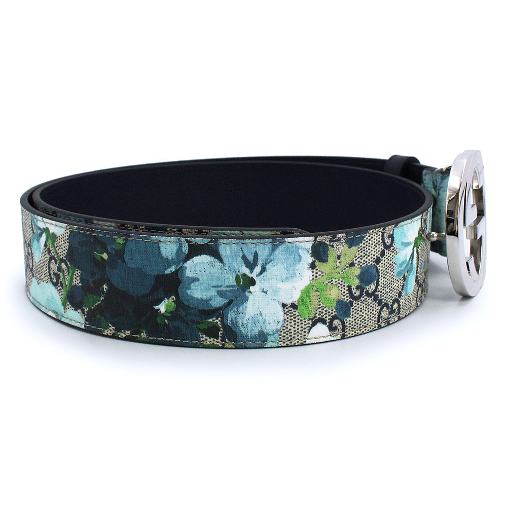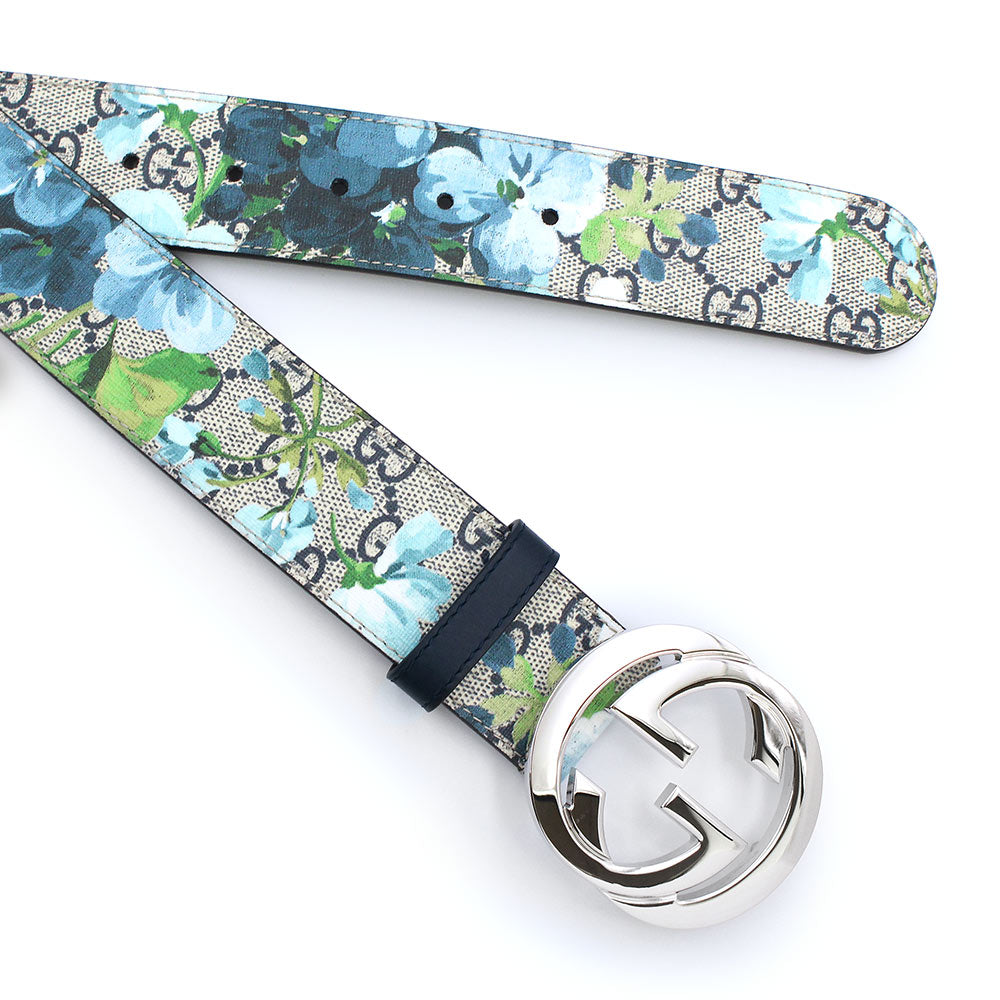 [Brand New/Unused] Gucci GG Belt, 40mm, #90 GG Blooms Supreme, Blue/Beige with Silver Hardware, 411924, with Interlocking G Buckle