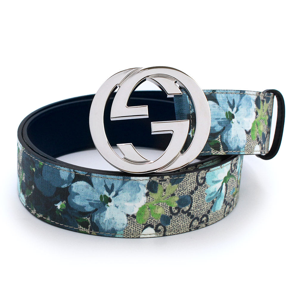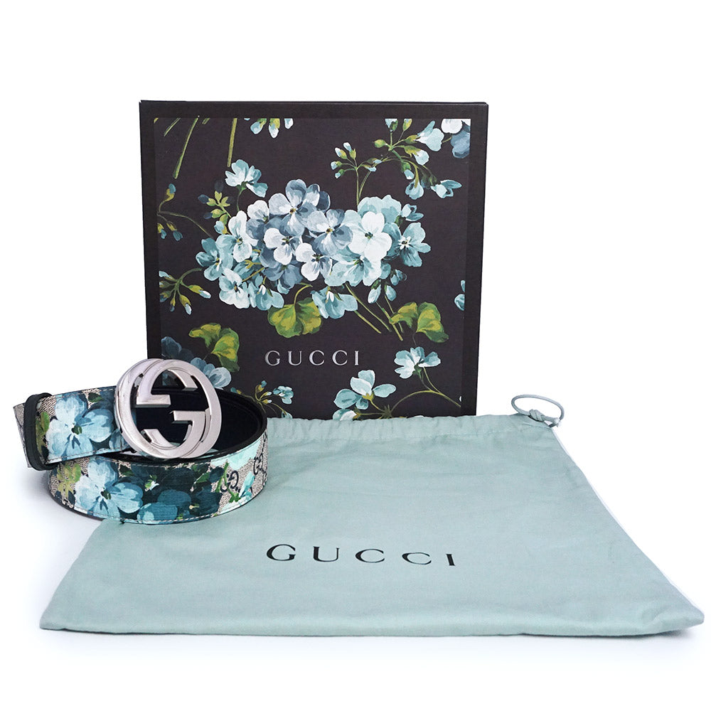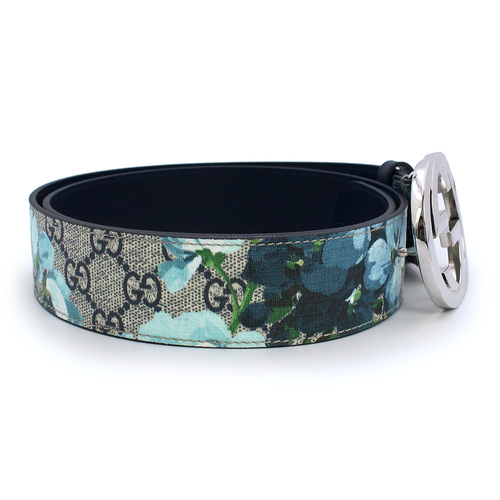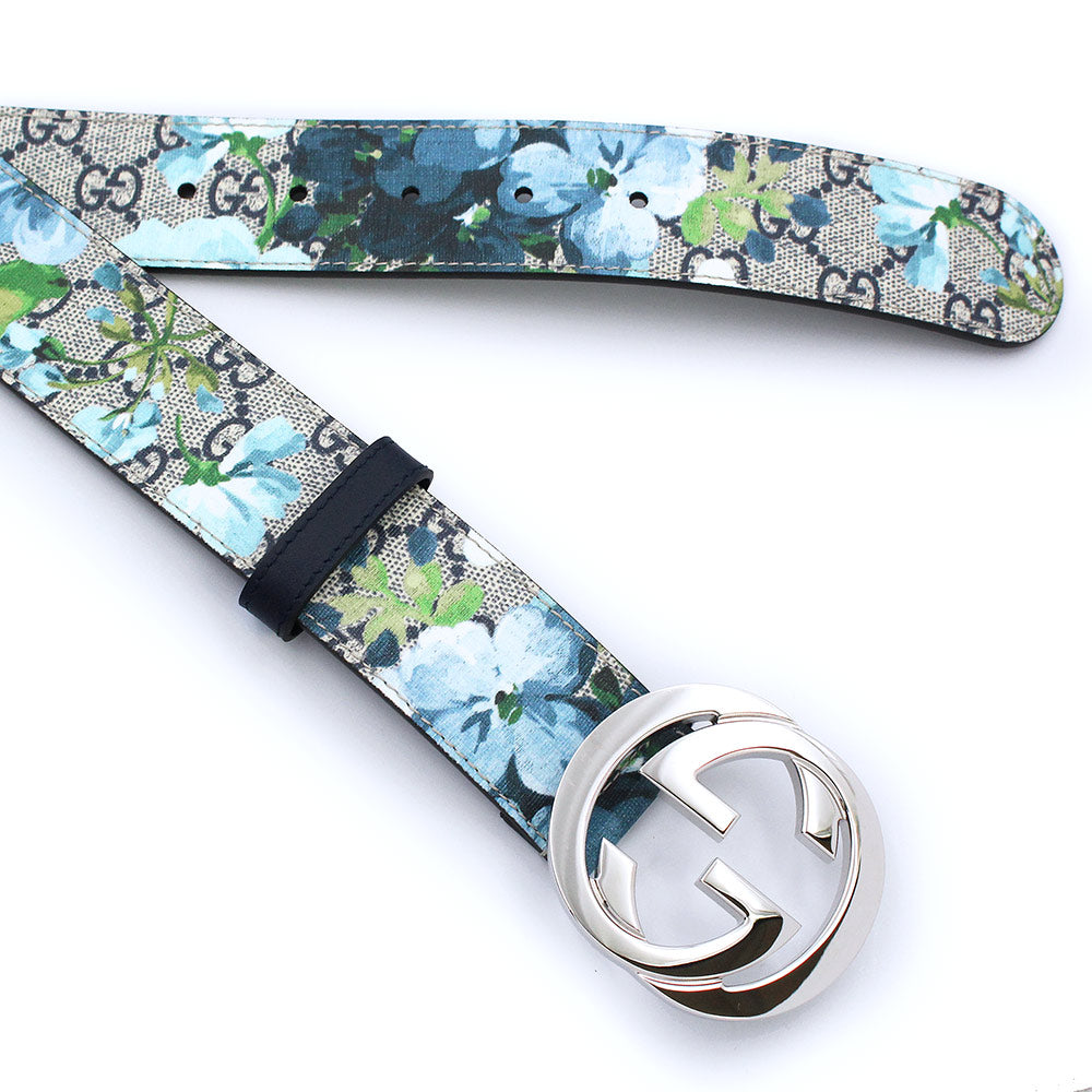 [Brand New/Unused] Gucci GG Belt, 40mm, #95 GG Blooms Supreme, Blue/Beige with Silver Hardware, 411924, with Interlocking G Buckle