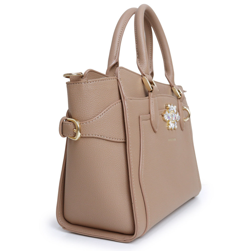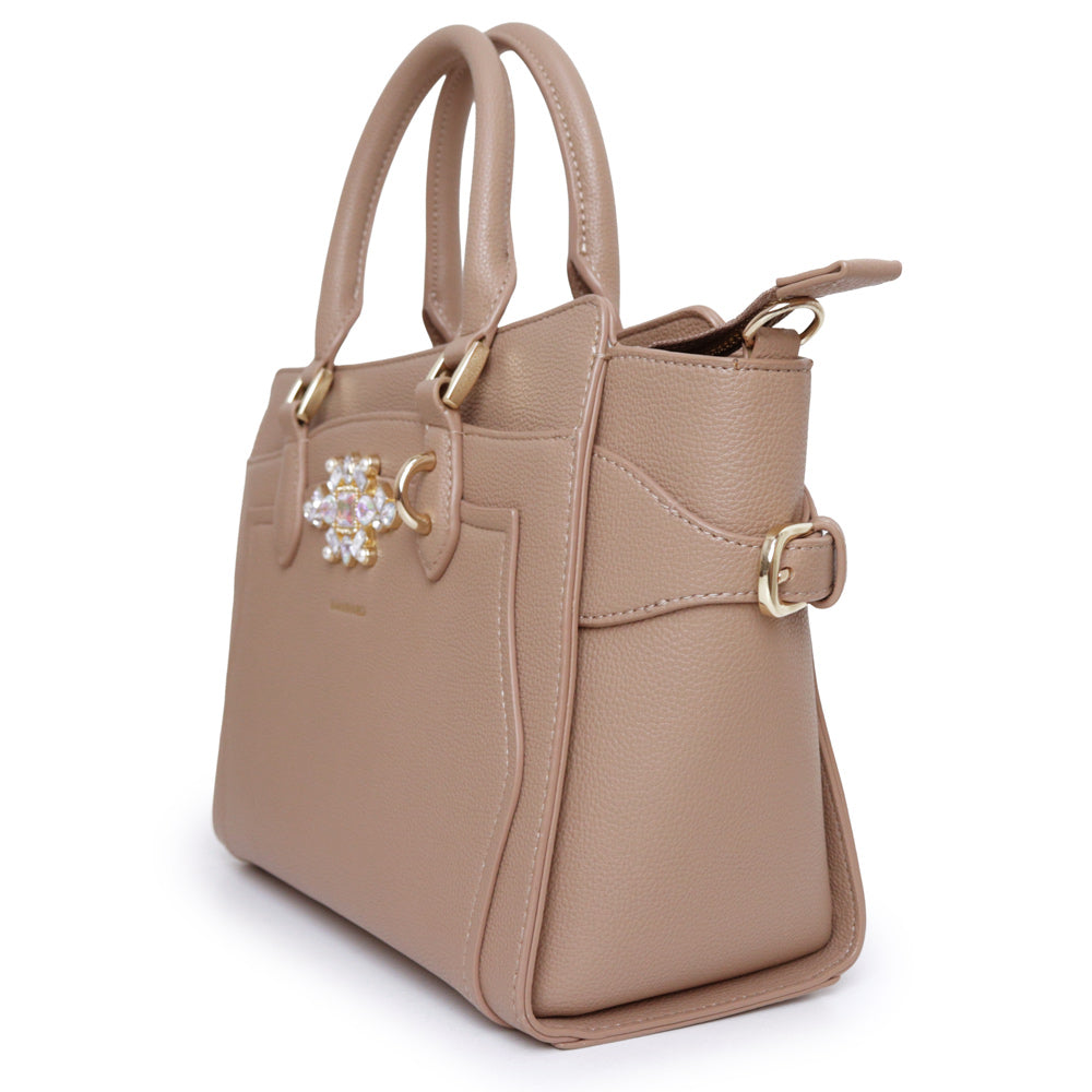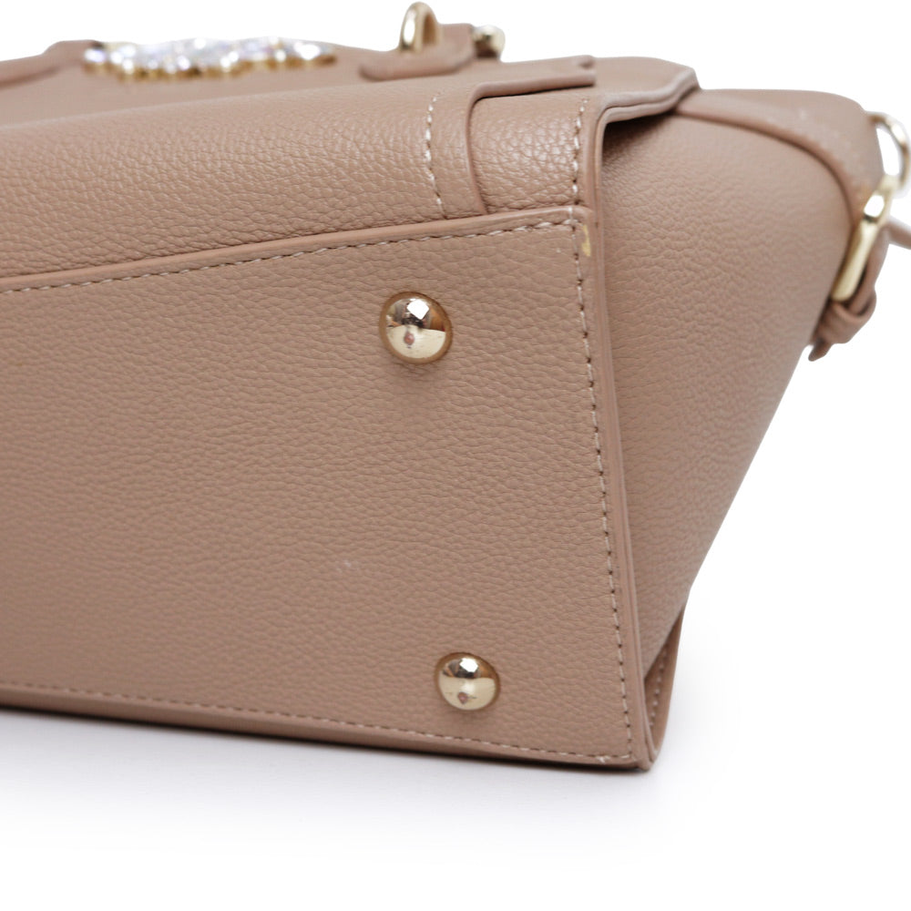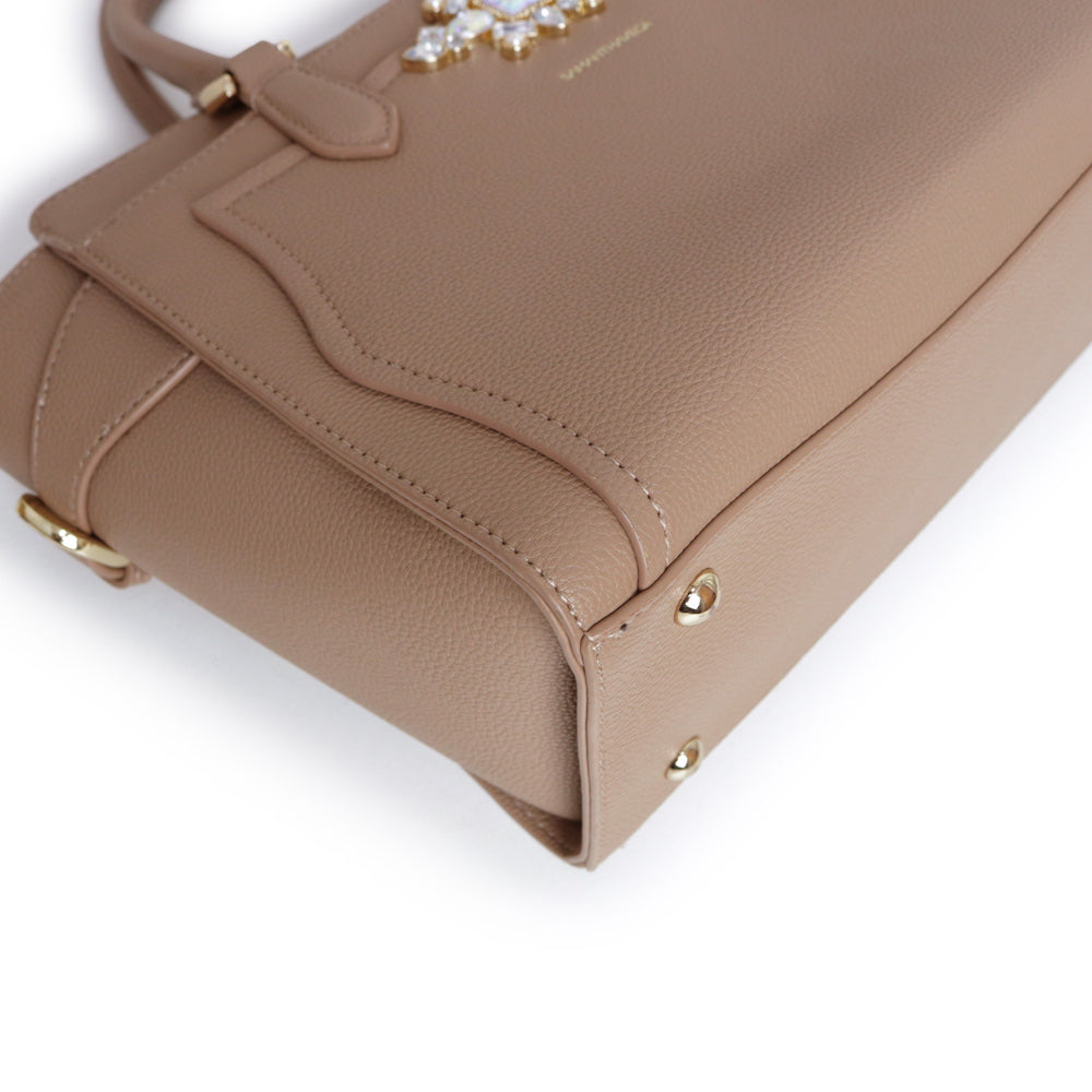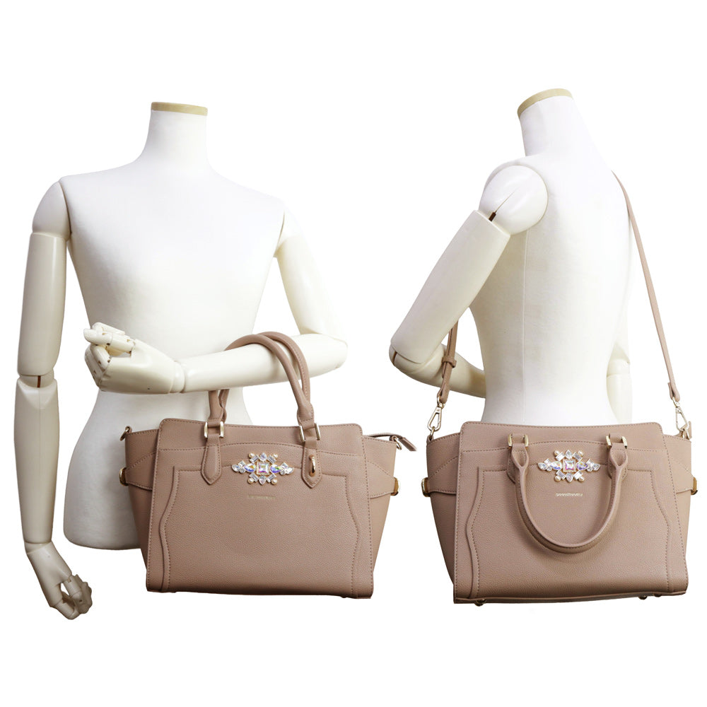 【美品】サマンサベガ Samantha Vega 梅田エスト店 オンライン限定 ビジューモチーフ ハンドバッグ 合成皮革 ベージュ モカ ゴールド金具 SA6473AW02146