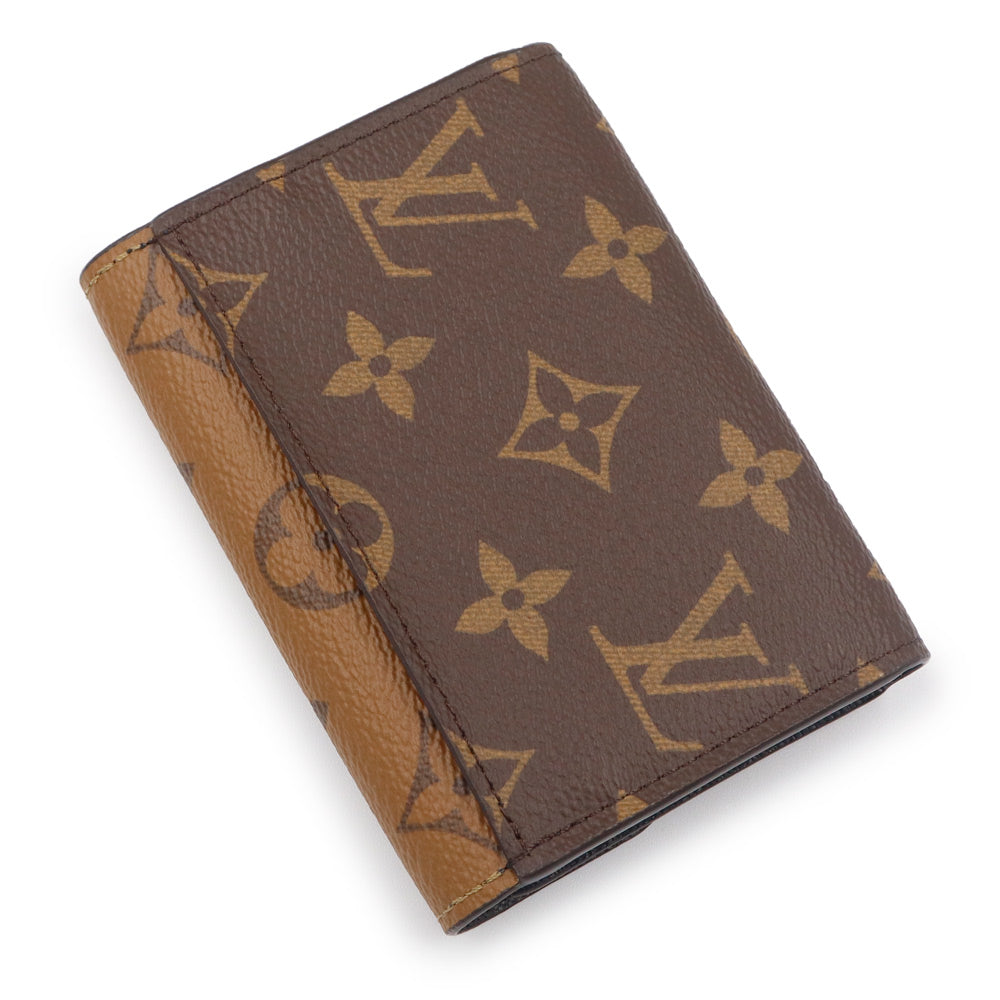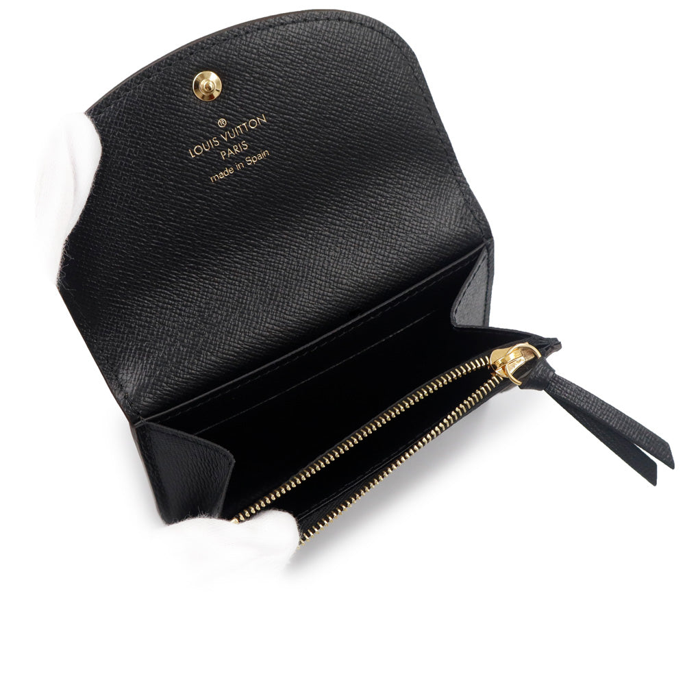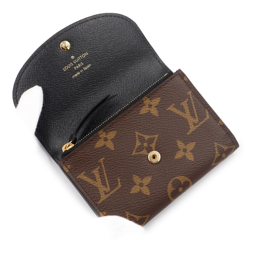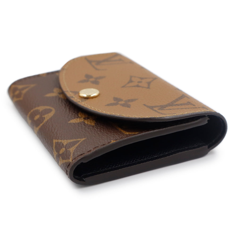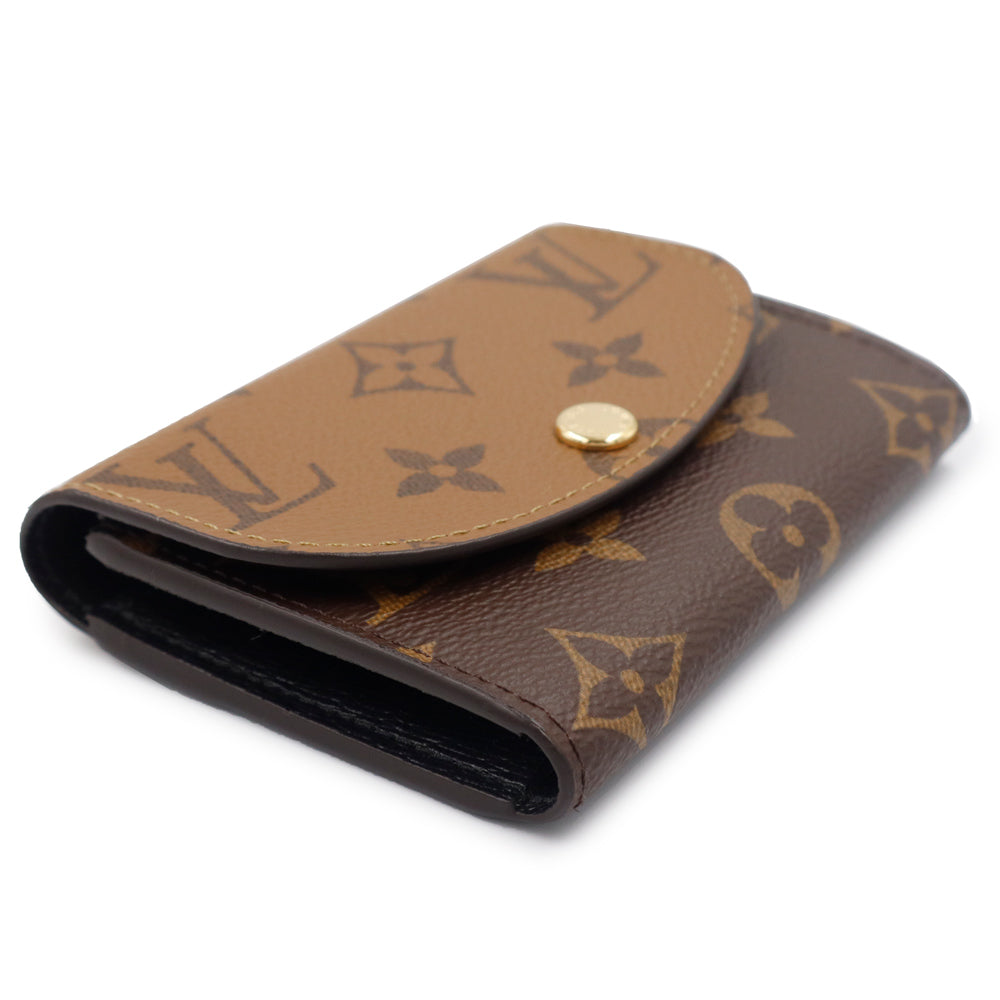 モノグラムとモノグラム・リバース キャンバスを組み合わせた、個性的で洗練されたデザインが印象的な「ポルトモネ・ロザリ」。丸みを帯びたフラップには、ゴールドカラーのスナップボタンがアクセントとして施されており、コンパクトながらも機能性に優れたつくりになっています。 |