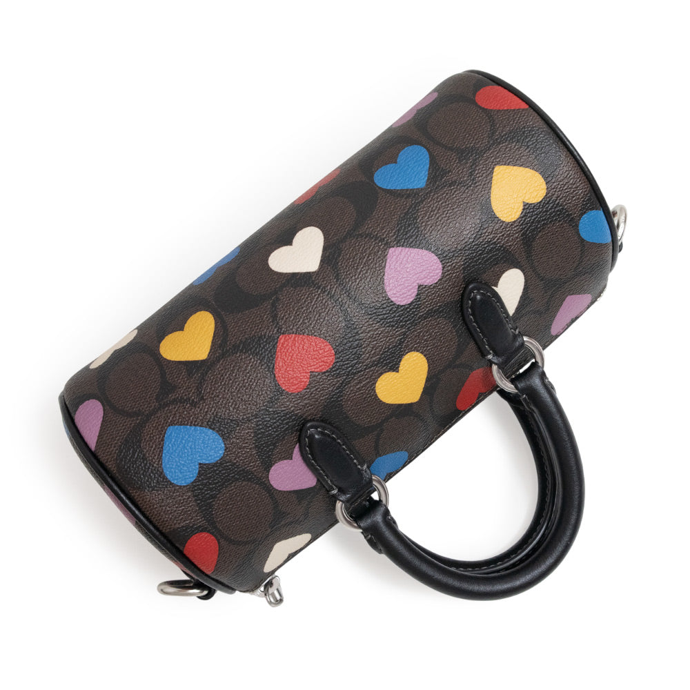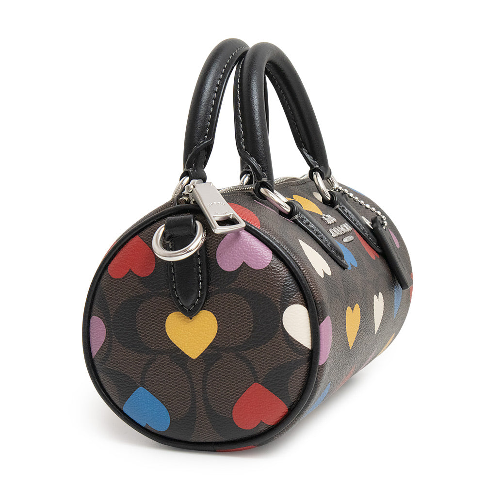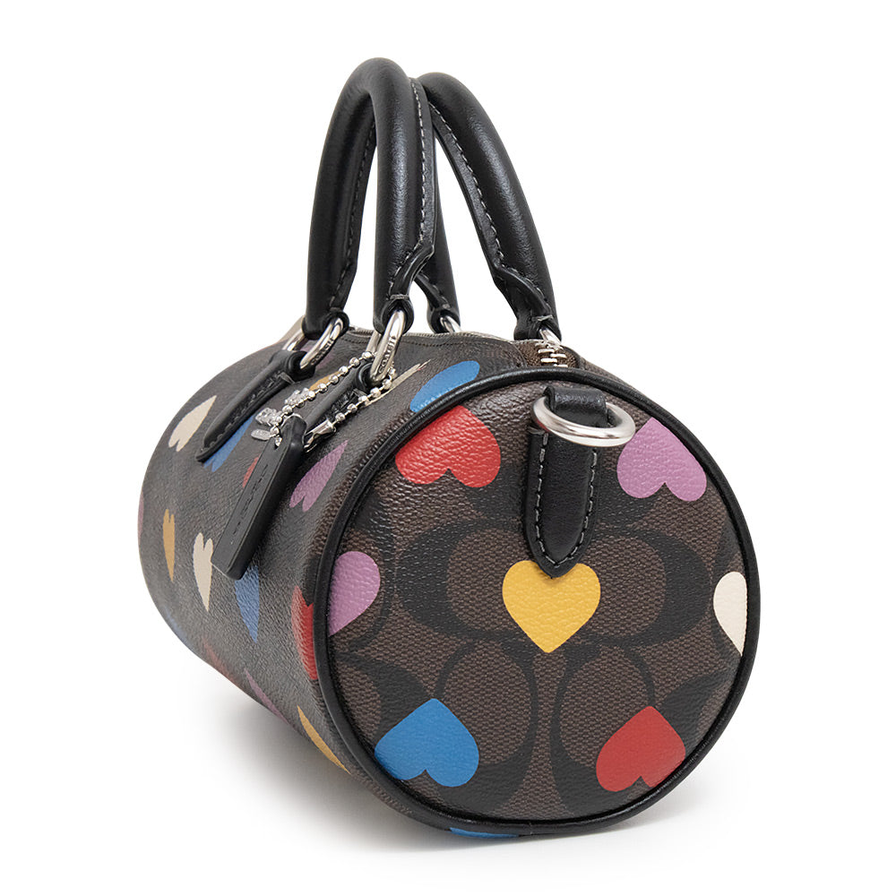 COACHの2wayミニバッグです。シグネチャーコーティングキャンバスにカラフルなハートがちりばめられた可愛らしいデザイン。取外し可能のショルダーベルト付きなので、2Wayでお使いいただけます。 |