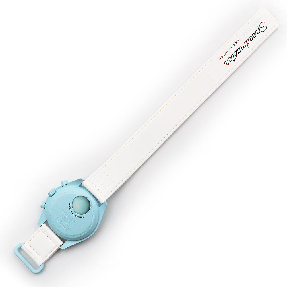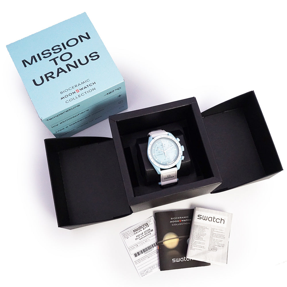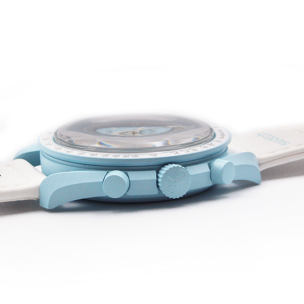オメガとスウォッチの革新的なコラボレーション、ウォッチ。このシリーズは、太陽系の惑星にちなんだ11本のモデルでデビューし、それぞれの裏ぶたには惑星が描かれています。天王星を表現した「MISSION TO URANUS」のデザインは、パステルブルーのフェイスとホワイトのストラップが鮮やかで、優しさが演出されています。 |
