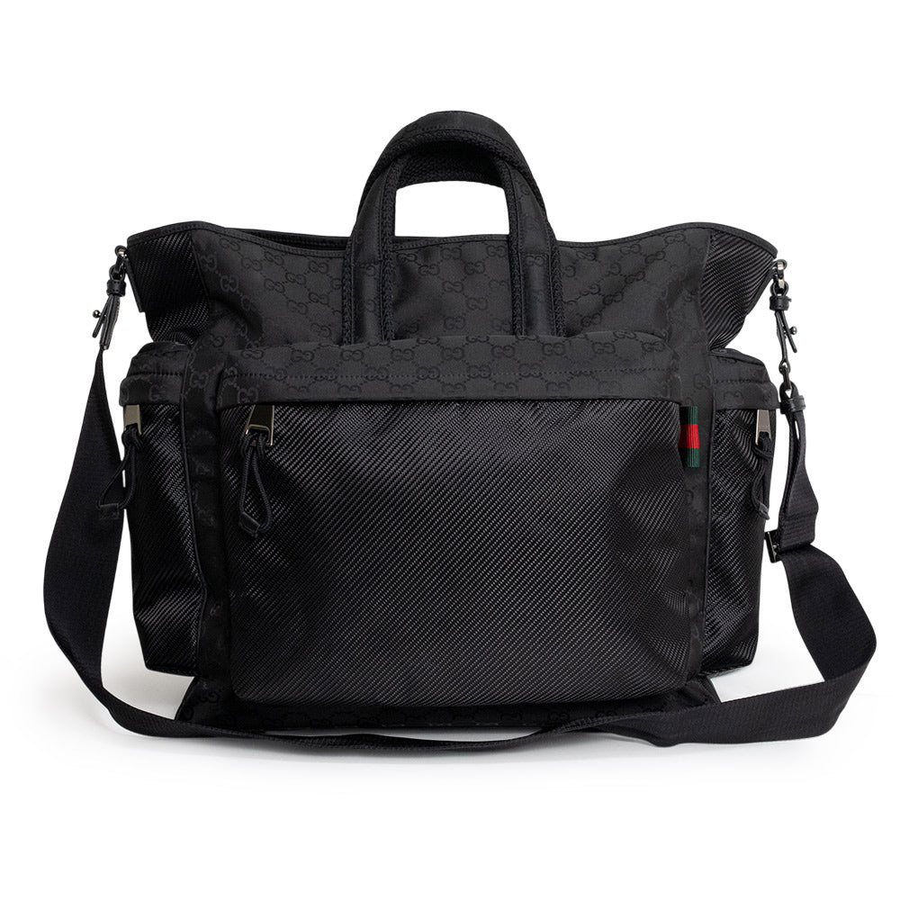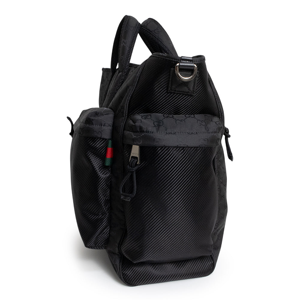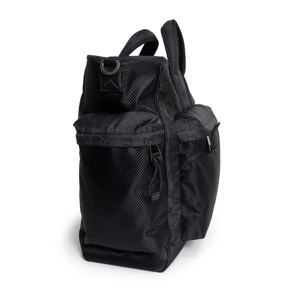 スリークなラインとスポーティーなムードを兼ね備えた、最新コレクションのメンズ バッグ セレクションのトートバッグ。ソフトでありながら耐久性に優れた洗練されたブラックのナイロンで仕立てられ、全体にGGパターンがあしらわれています。 |