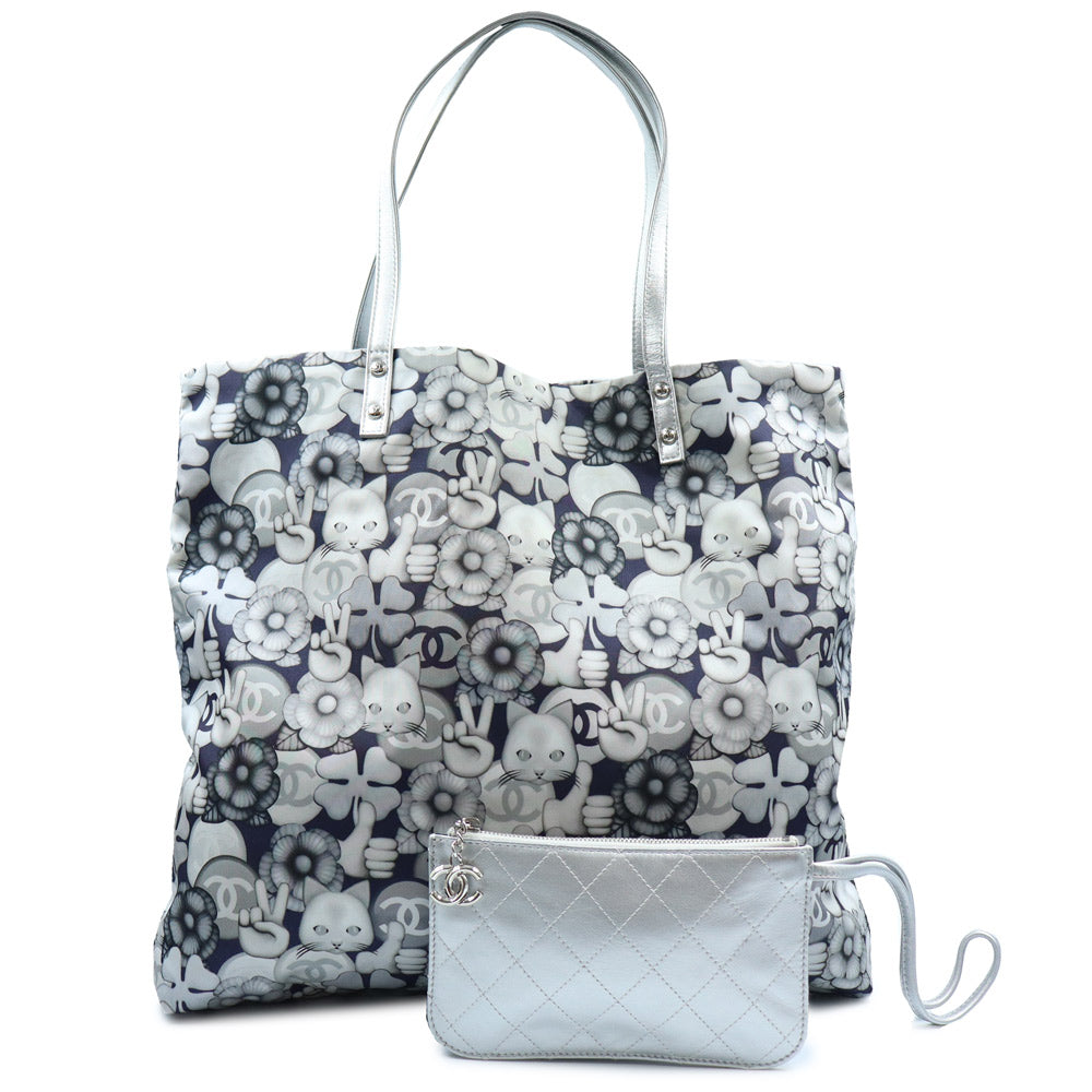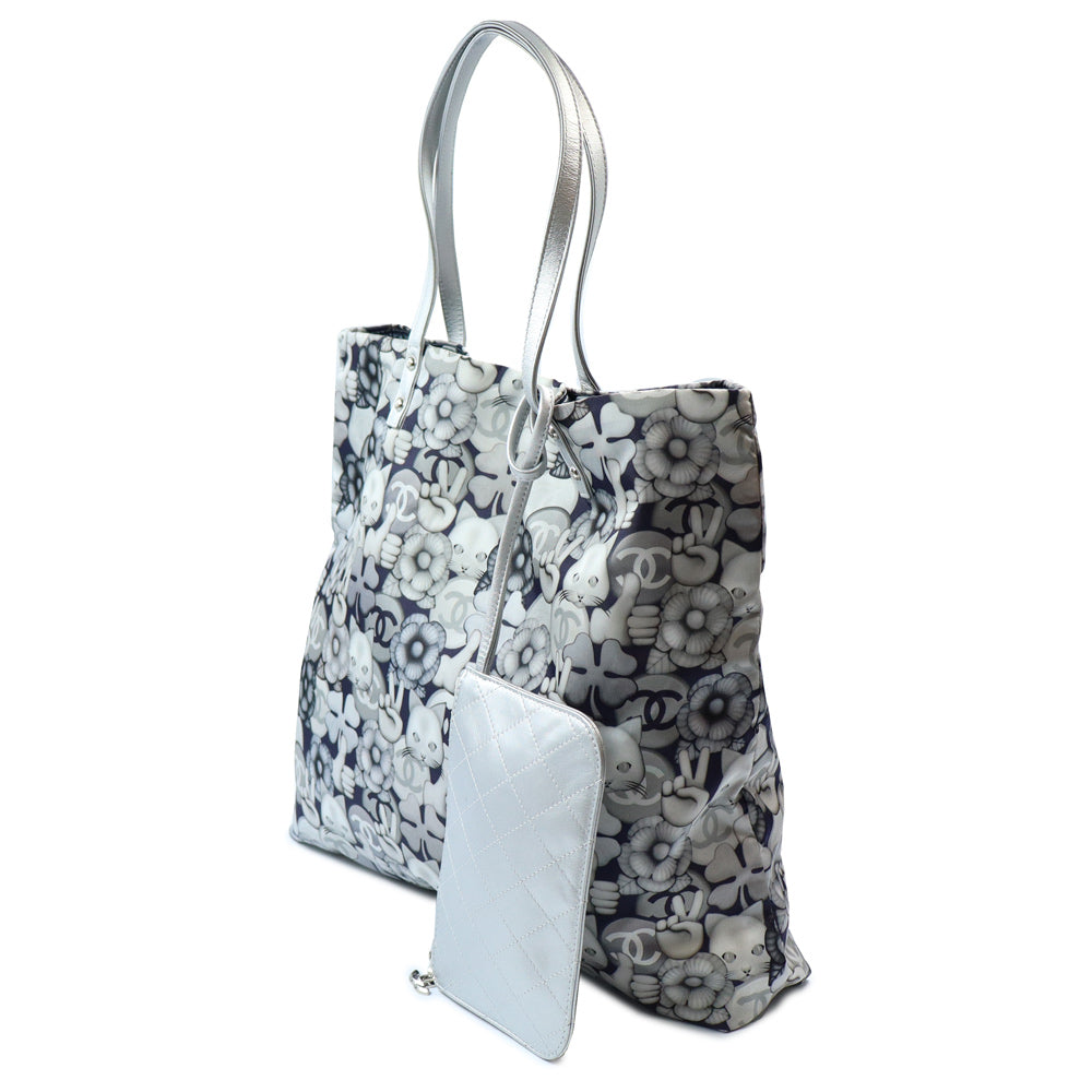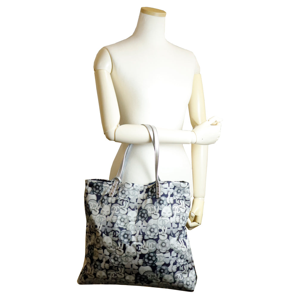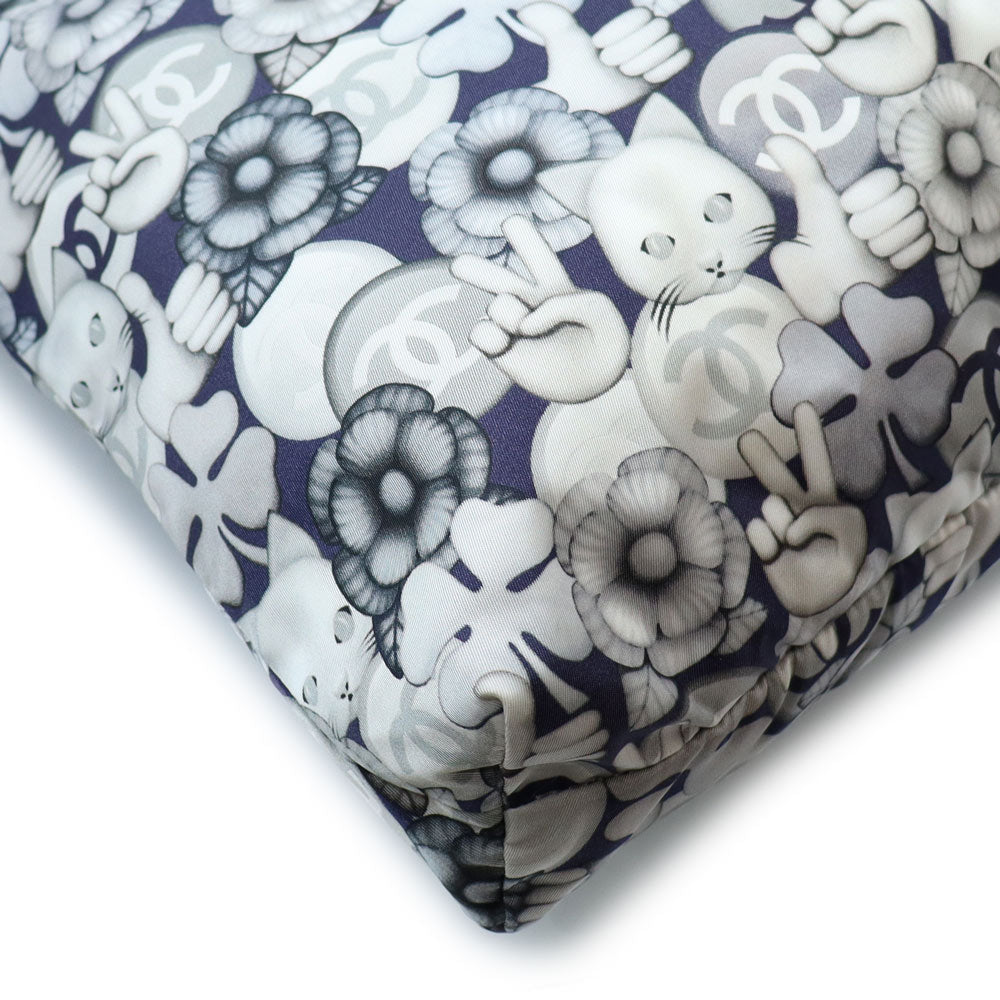 【美品】CHANEL シャネル A69928 シュペット 猫 ネコ柄 グラフィック トートバッグ プリントファブリック レザー ホワイト ネイビー ハンドバッグ シルバー金具 ポーチ付き