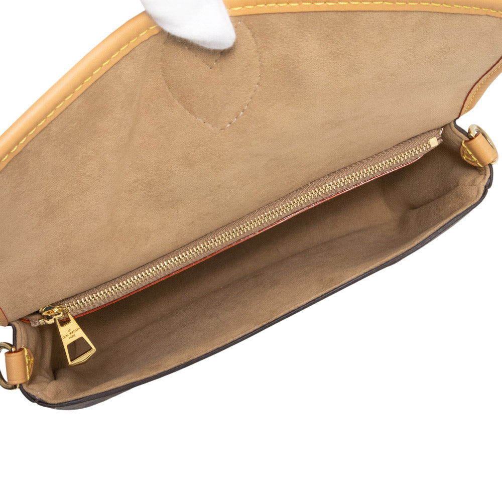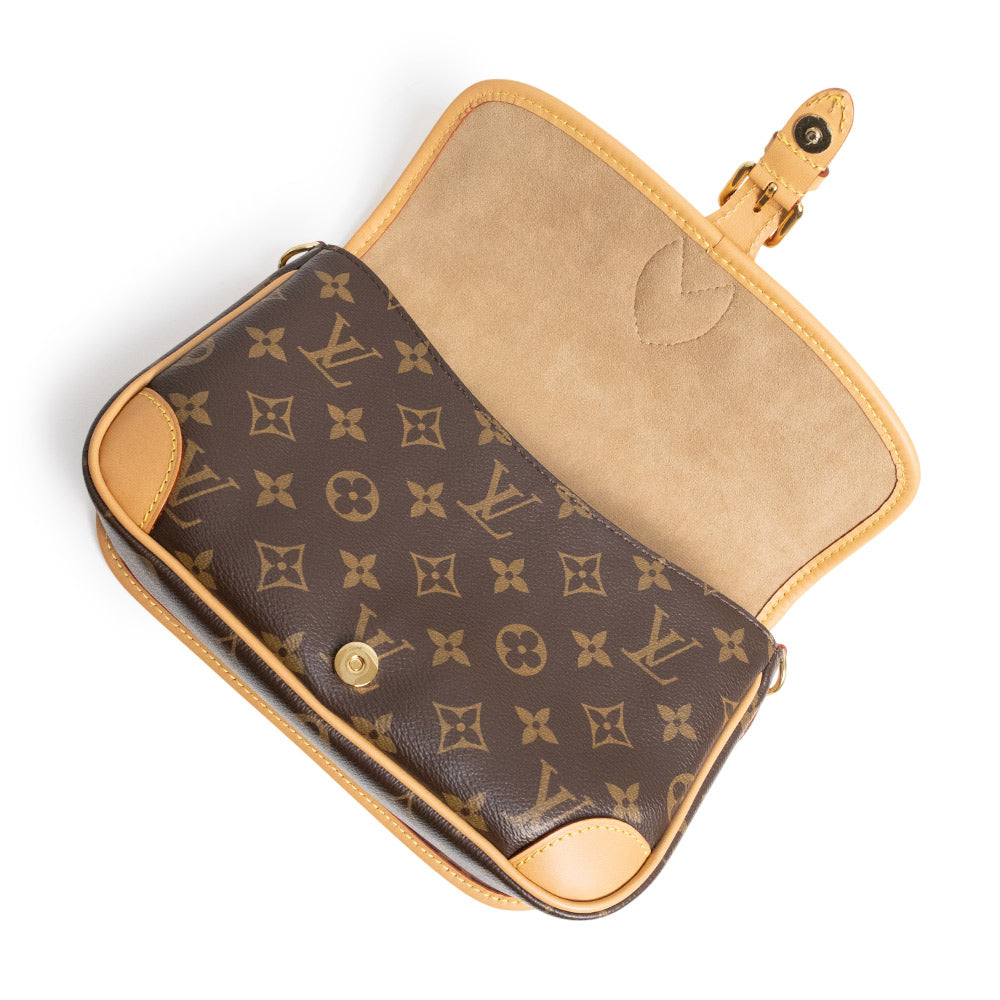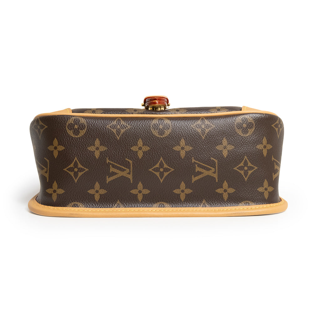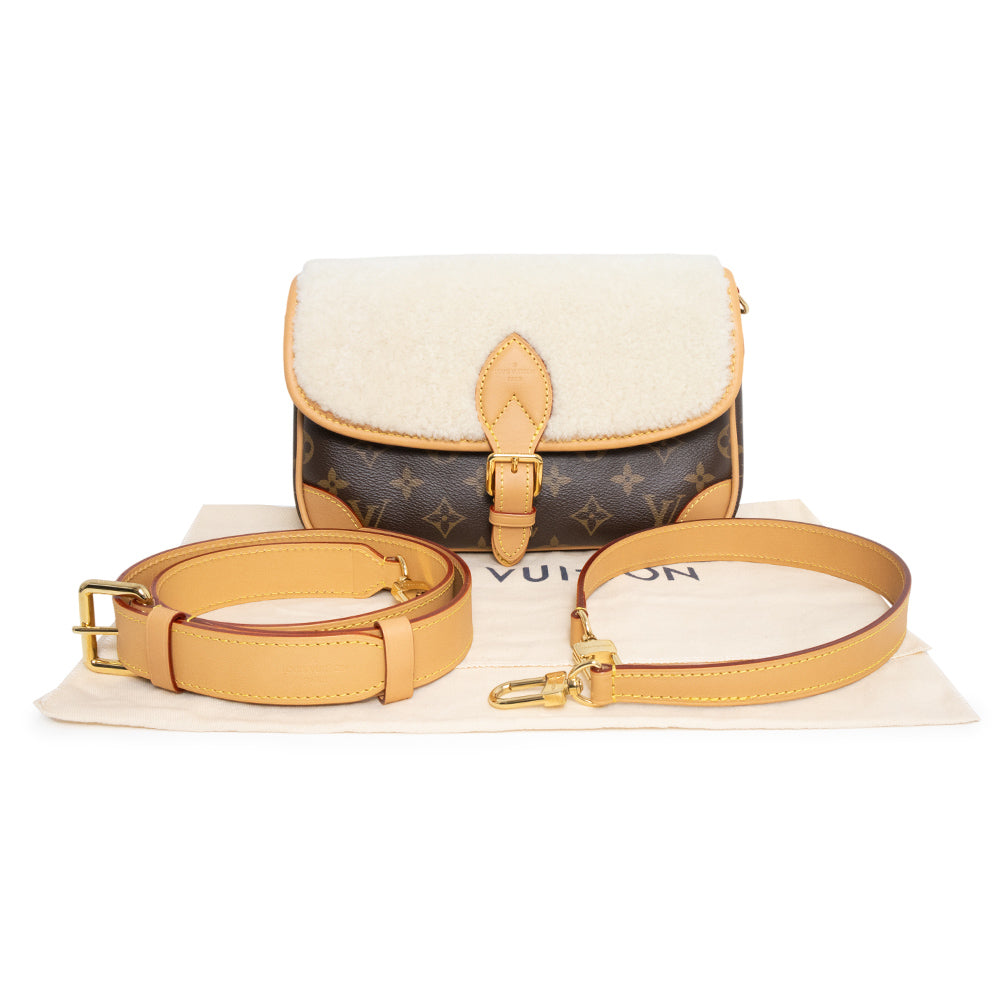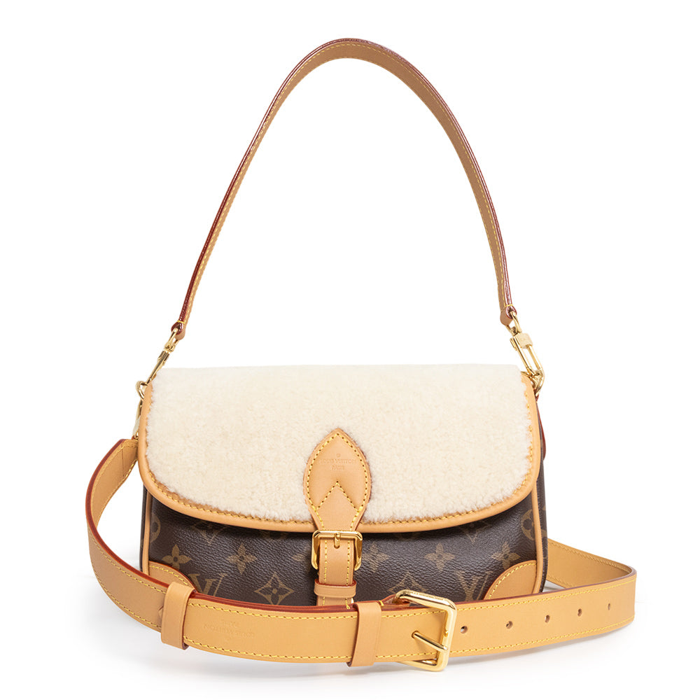 1990年代のクラシカルなモデルを再解釈して、モノグラム・キャンバスで仕立てられた「ディアヌ NM PM」。定番のモノグラムキャンバスとヌメ革のトリミングに、シアリングのフラップがポイントになったデザイン。付け外し可能なトップハンドルとショルダーストラップが付属しますので、2Wayでお使いいただけます。 |
