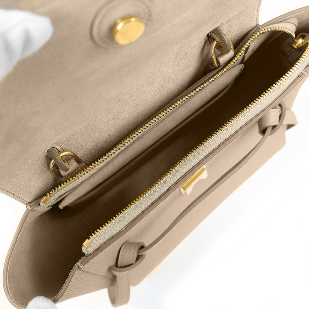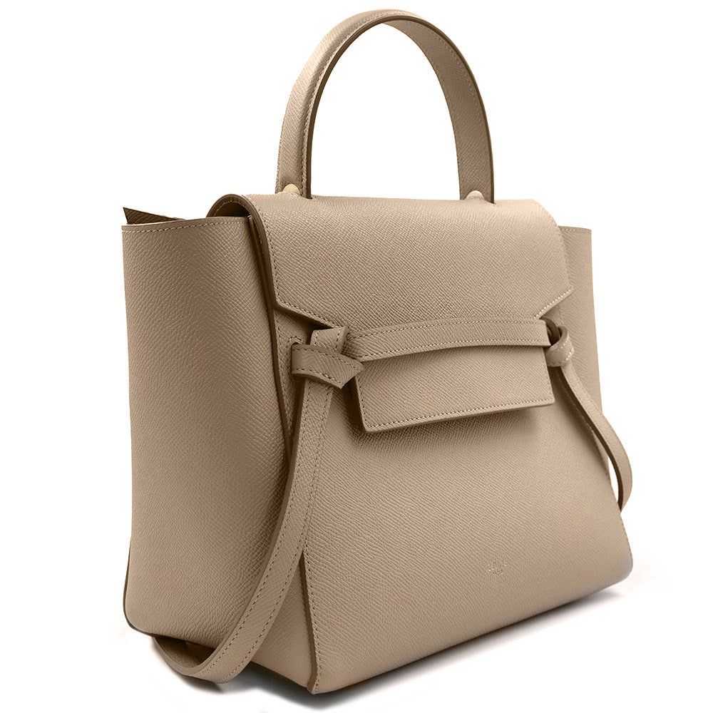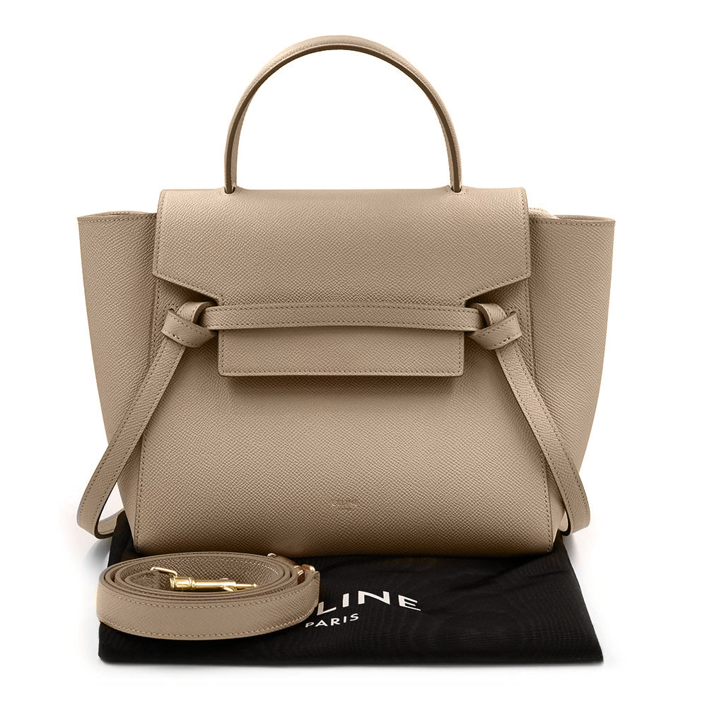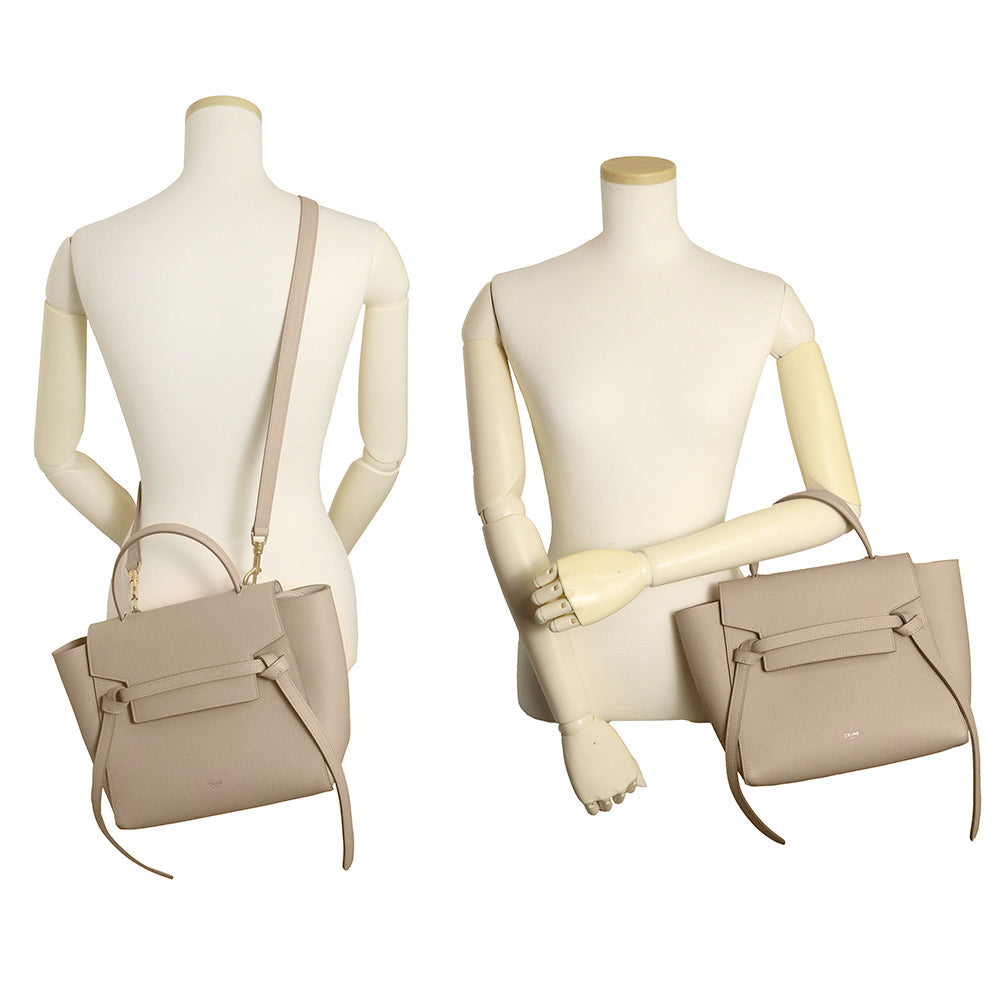 セリーヌより淡いベージュカラーが目を引く「ベルトバッグ マイクロ」。バッグ背面にファスナーポケット、内部にポケットが備えられており高い収納力が魅力です。横幅も広めなので長財布や化粧ポーチなども余裕で入るサイズ感となっています。ハンドバッグとして、またショルダーバッグとしてもどちらでもお使いいただくことができます。 |