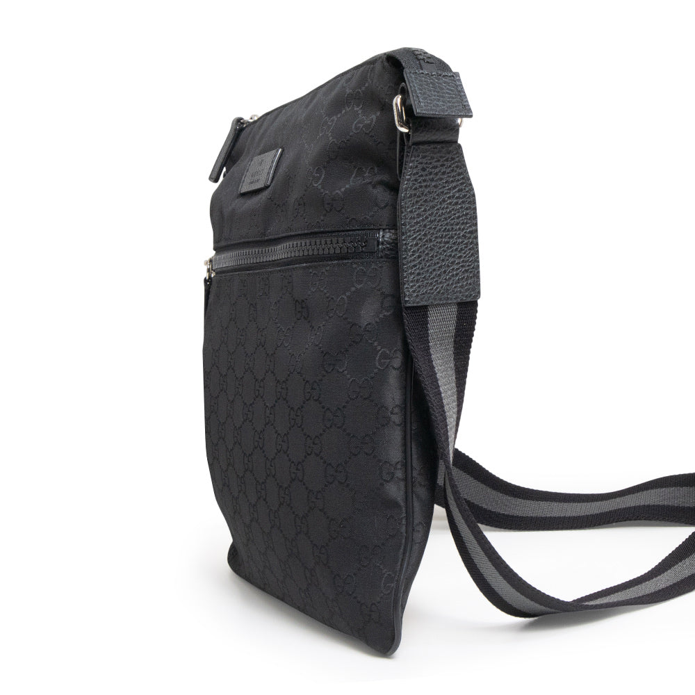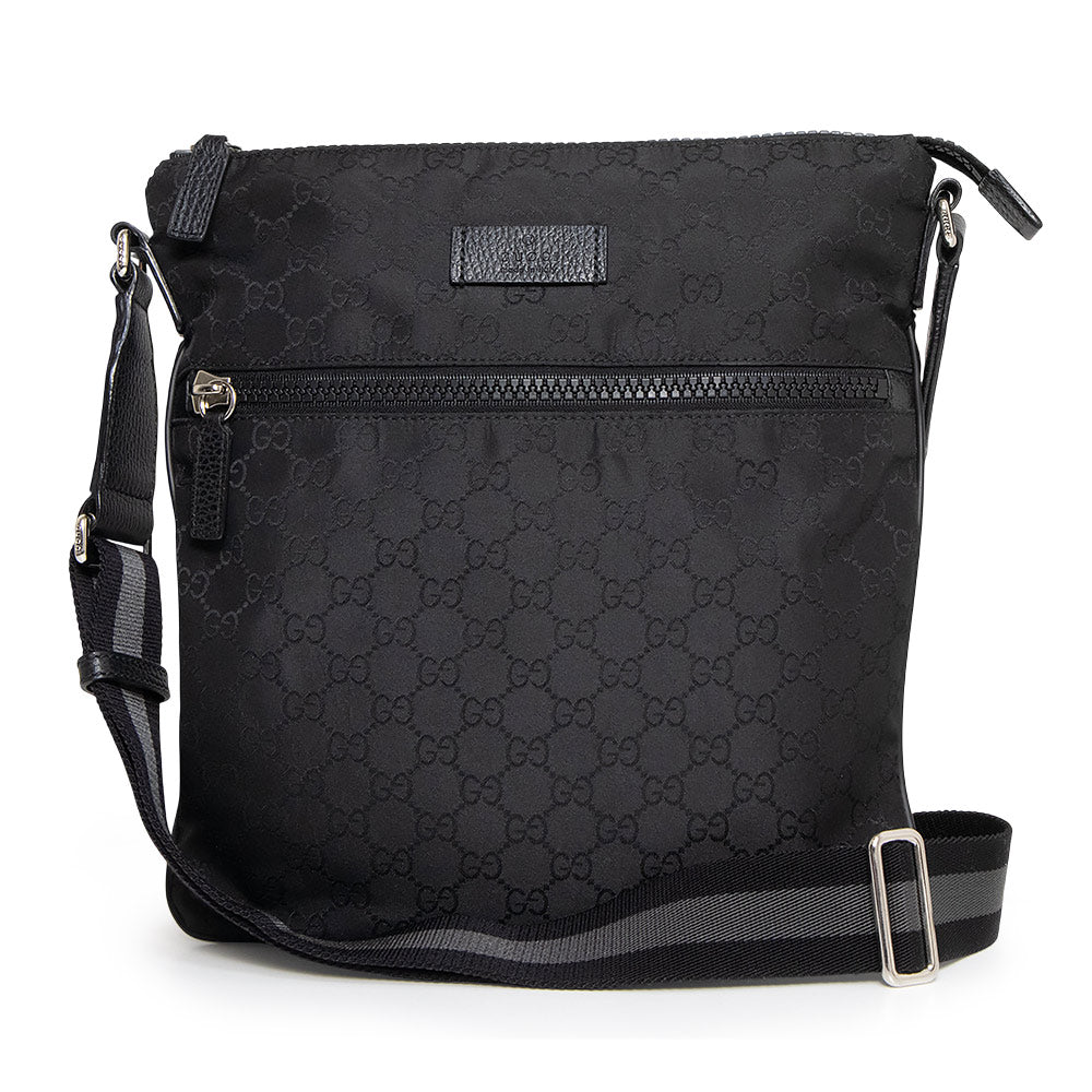 GGナイロンのショルダーバッグ。コンパクトな薄マチデザインは普段使いにピッタリです。どんなファッションにも合わせやすいブラックカラーで、デイリー使いはもちろんちょっとしたお出かけに大変重宝するバッグです。 |