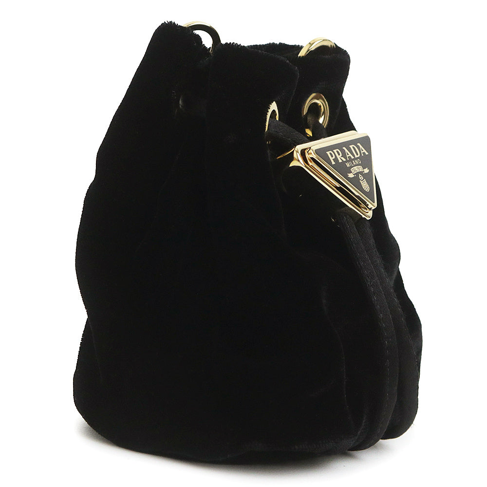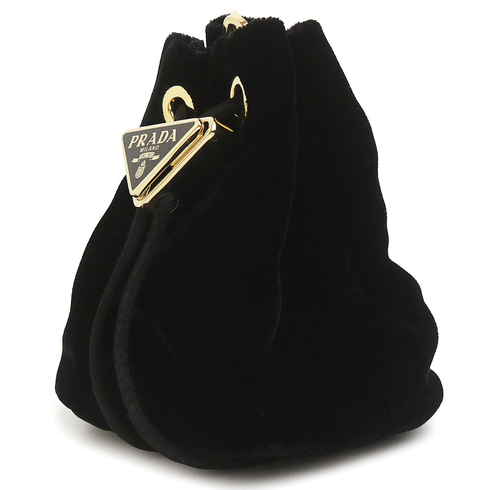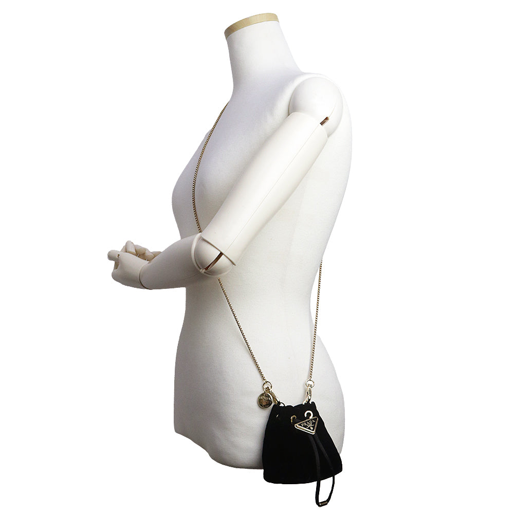 【未使用 展示品】PRADA プラダ 1NR016 ミニ チェーン ショルダーバッグ トライアングル 三角ロゴプレート ドローストリング 巾着 ベルベット ナイロン ブラック ポーチ ゴールド金具 箱付