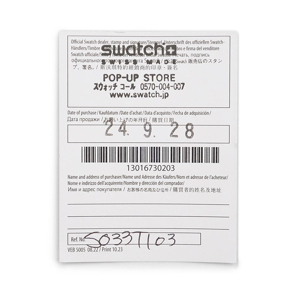 オメガとスウォッチの革新的なコラボレーション、ウォッチ。段差が設けられた外周やシャープでスムーズなラグ構造、タキメーターベゼルにはアイコニックな「ドットオーバー90」が再現されています。 バイオセラミックケースは非常に軽量で、ベルトの着け心地も良く、オリジナルのスピードマスターには無い魅力が詰まっています。 |