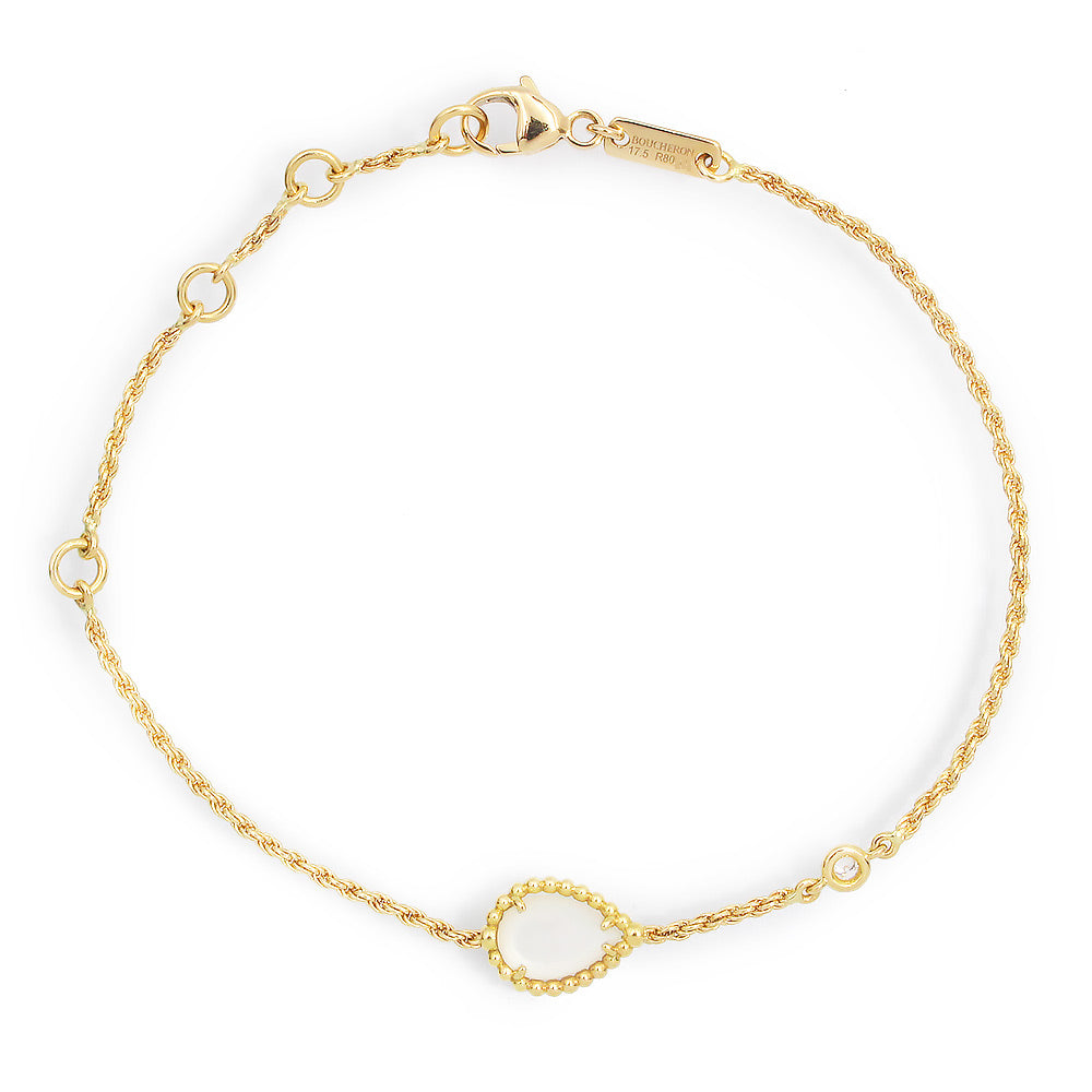 スネークの神秘的な美しさを表現したセルパンボエム。イエローゴールドの華奢なチェーンとマザーオブパールのドロップモチーフがしなやかに肌に沿い、身に着ける人を輝かせます。 |