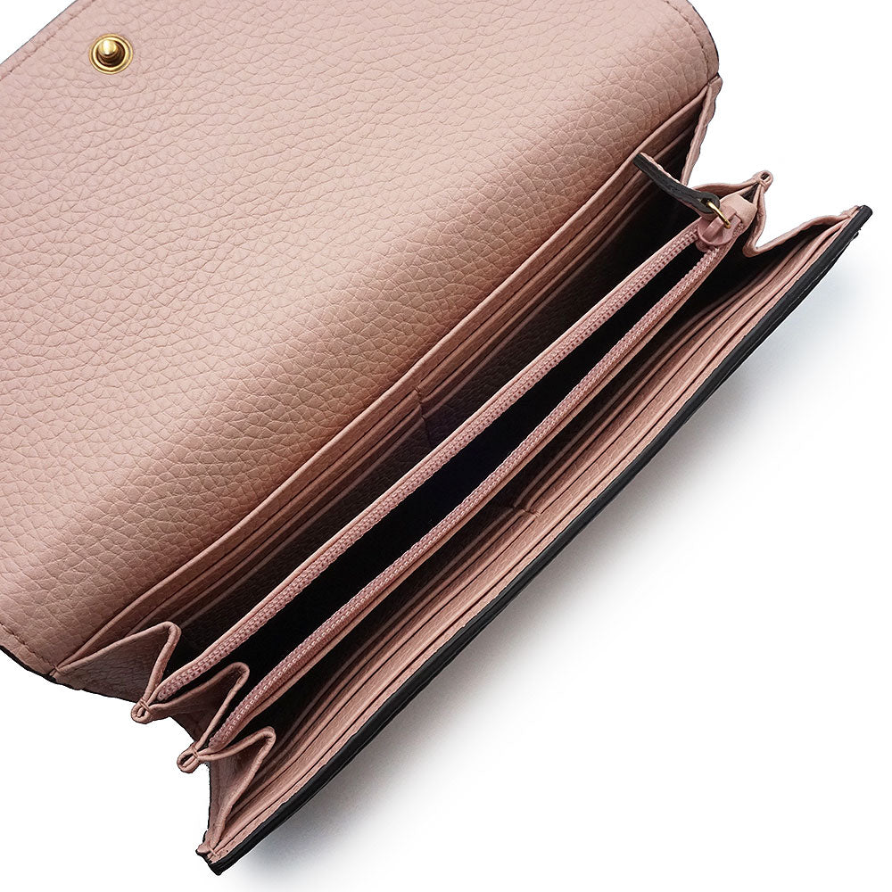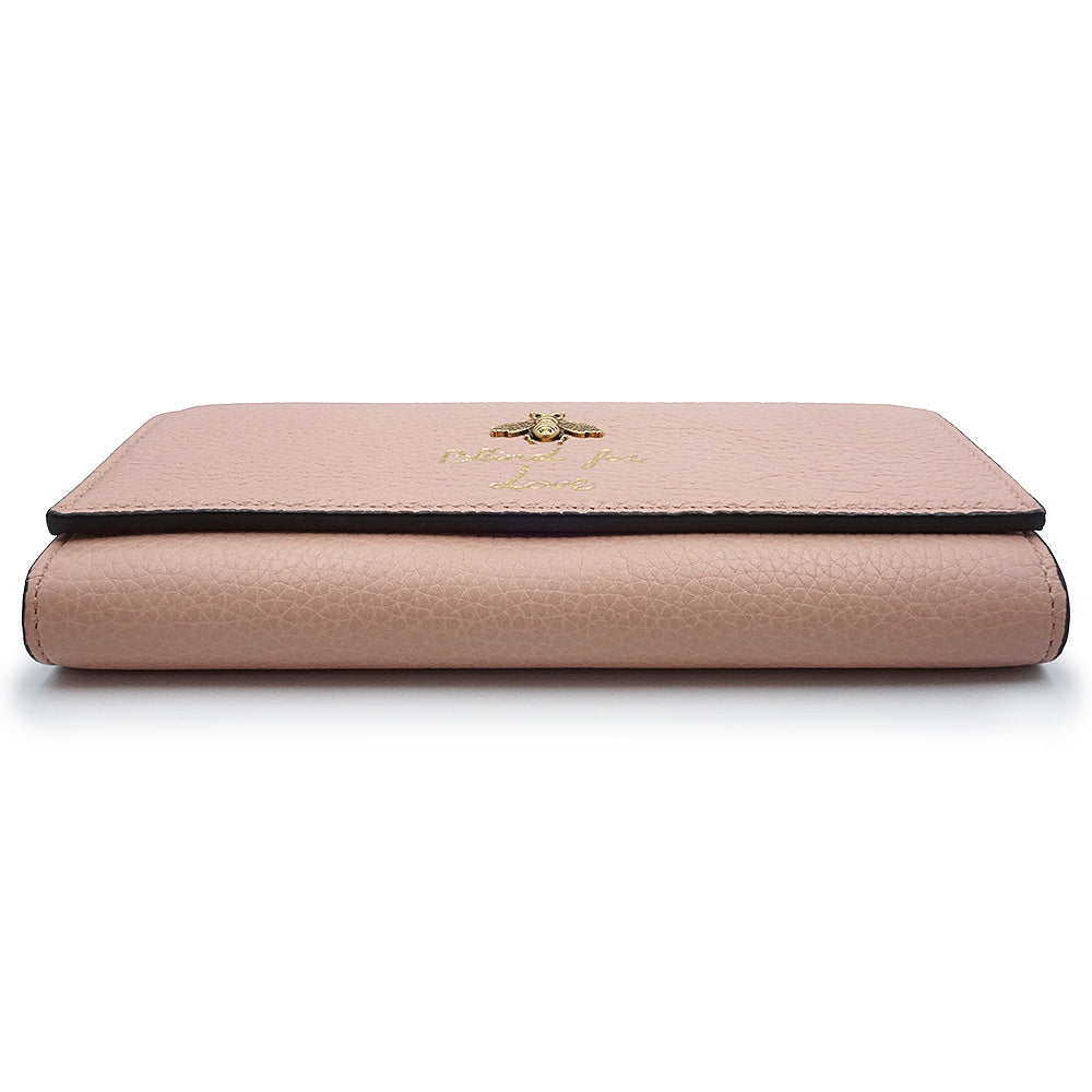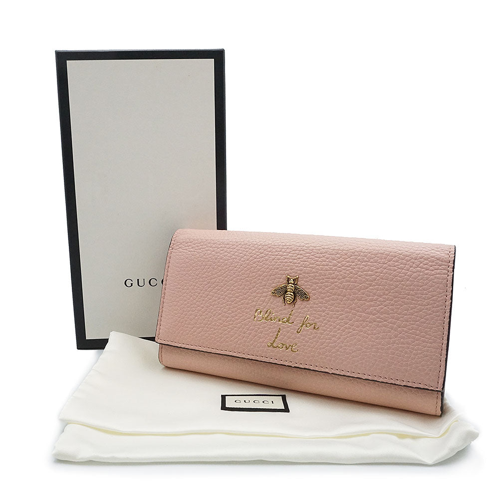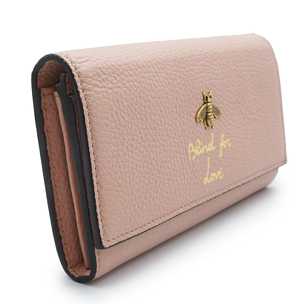 グッチのアニマリエ二つ折り長財布。手触りの良いライトピンクのボディには、メタル製ビー(ハチ) ディテールと、「盲目的な愛」という意味のフランス語L'Aveugle Par Amourを英語にしたBlind for Loveのゴールドホイルの刻印があしらわれています。充実したカード入れやポケットが備えられており使いやすさも抜群です。 |