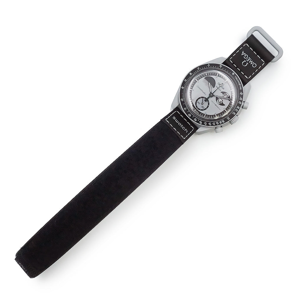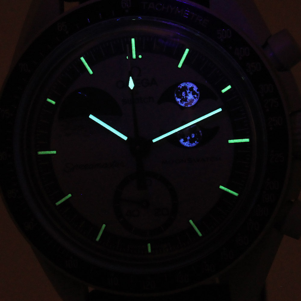 オメガ×スウォッチ「ムーンスウォッチ ミッション トゥ アースフェイズ」。月と地球を讃えて、ムーンフェイズとアースフェイズの両方の機能を備えているのが特徴。バイオセラミックケースは非常に軽量で、ベルトの着け心地も良く、オリジナルのスピードマスターには無い魅力が詰まっています。 |
