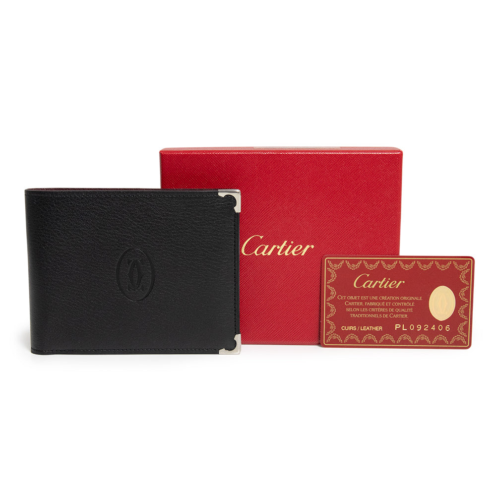 カルティエマークが上品な「マストライン カボション」ラインの二つ折り財布。ブラックのカーフスキンレザーに、カルティエの2Cモチーフが型押しされたシンプルなデザイン。小さなバッグや、スーツやパンツのポケットにスマートに収まります。飽きのこないデザインで幅広い年代の方に永く愛用していただけます。 |