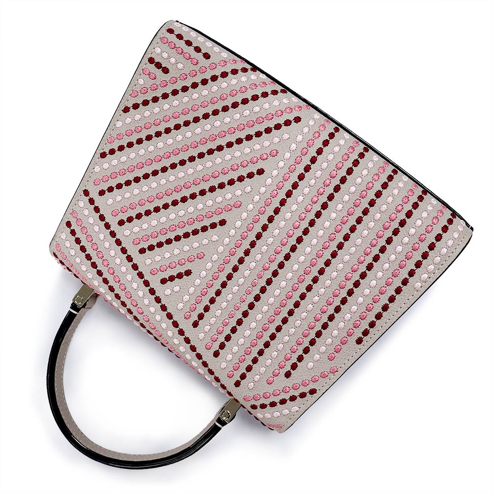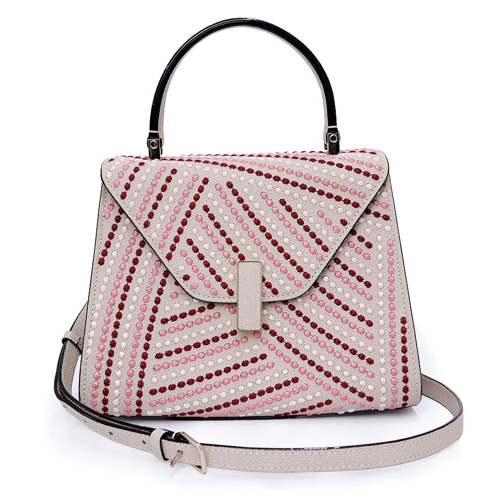 VALEXTRAのアイコンバッグ「ミニ イジィデ 」。3色のコットンスレッドで施された繊細な刺繍パターンが華やかなムードを醸し出します。財布やスマートフォンを収納するのに最適な小柄なサイズ感で、コーディネートを上品にクラスアップしてくれるアイテムです。 |