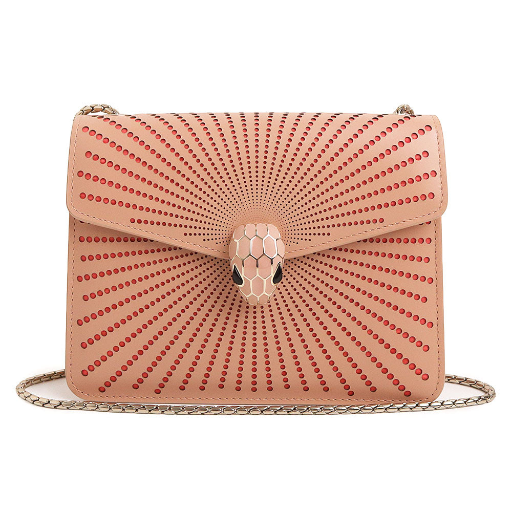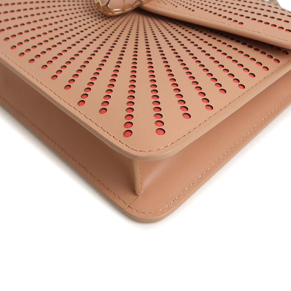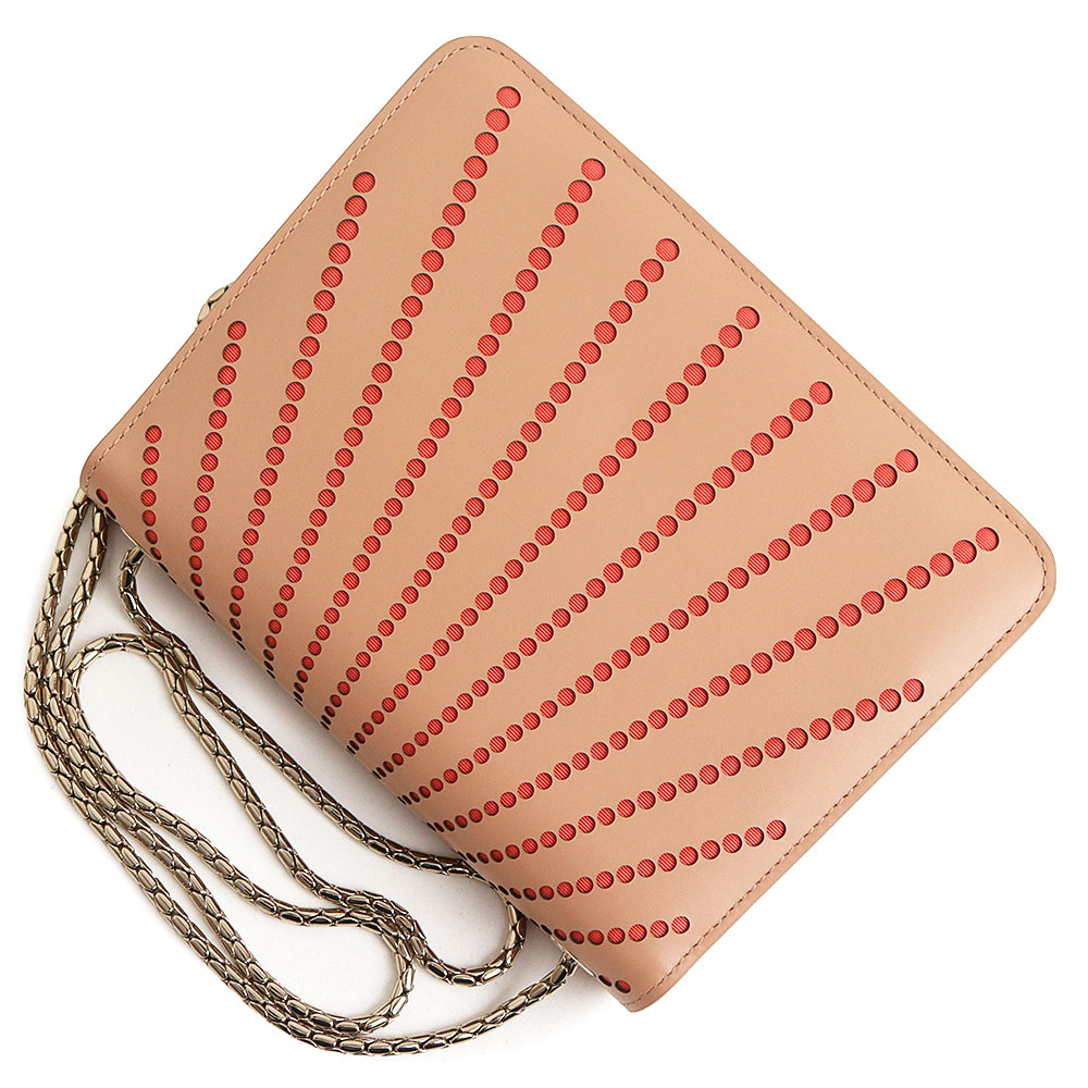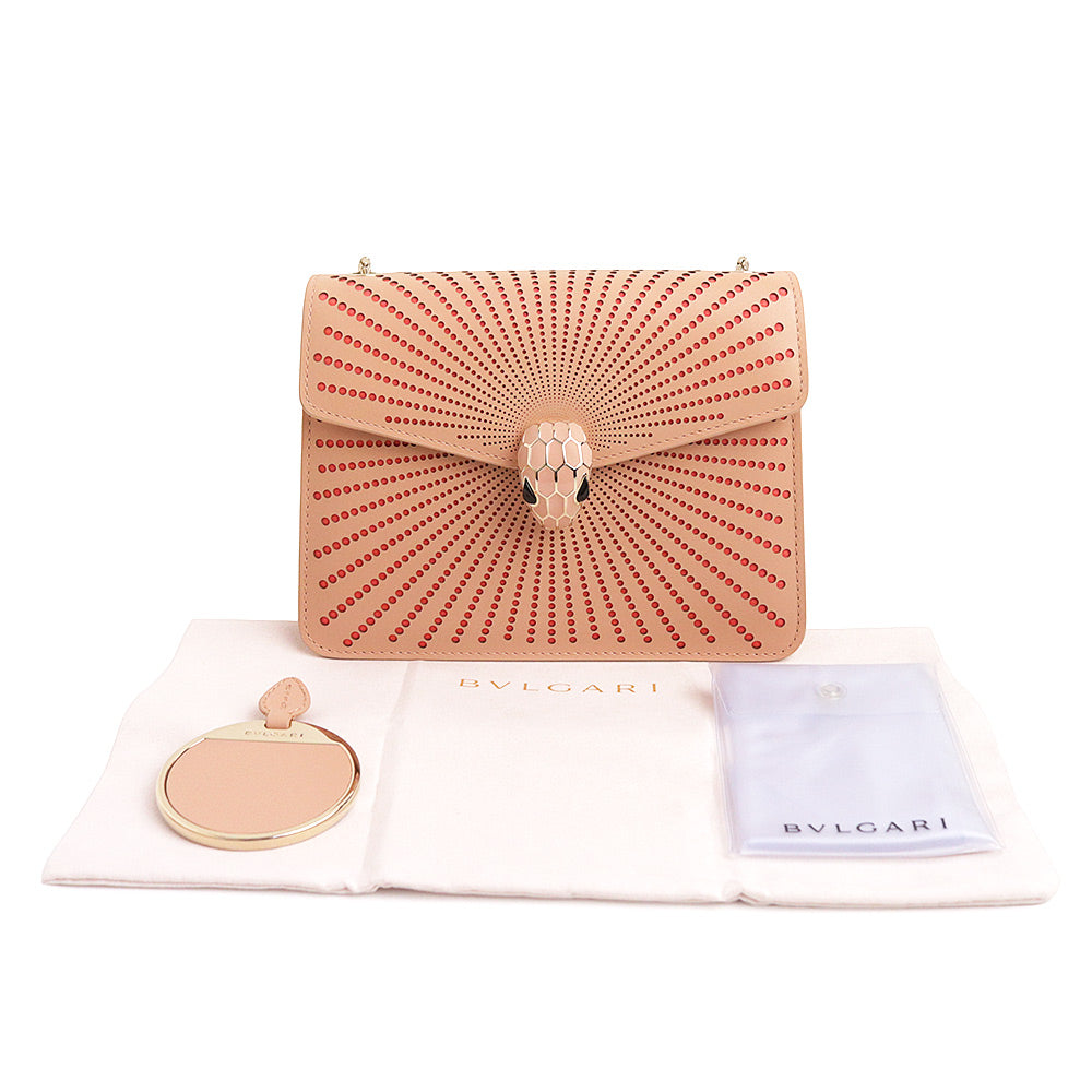スネークヘッドクロージャーが目を惹く、ブルガリの「セルペンティ フォーエバー」ショルダーバッグ。スネークに向かって放射線状にひろがるパンチングが存在感抜群で、高級感のある仕上がりとなっております。 |