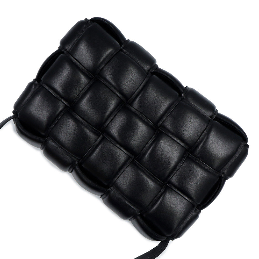 イントレチャート技法によるソフトなパディングを施したラムスキンレザーのクロスボディバッグ。ちょっとしたお出かけに丁度いいサイズ感で、使い勝手のよいアイテムです。 |