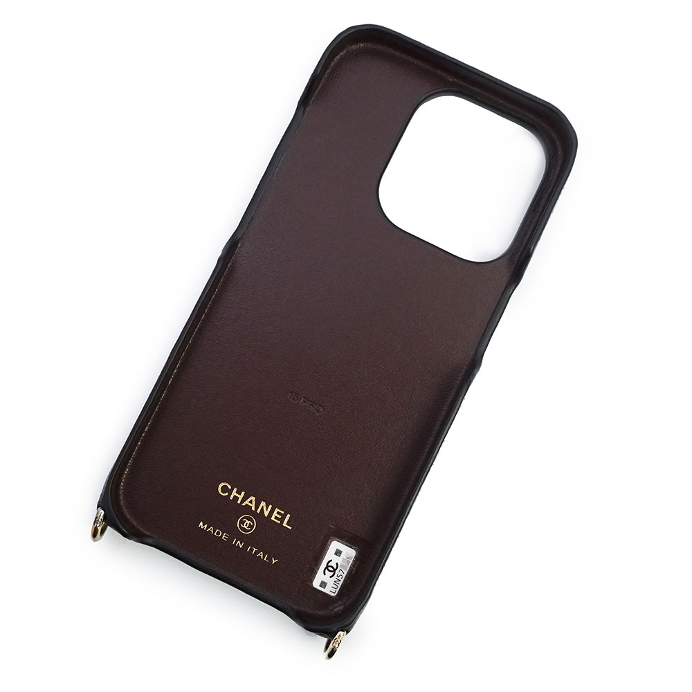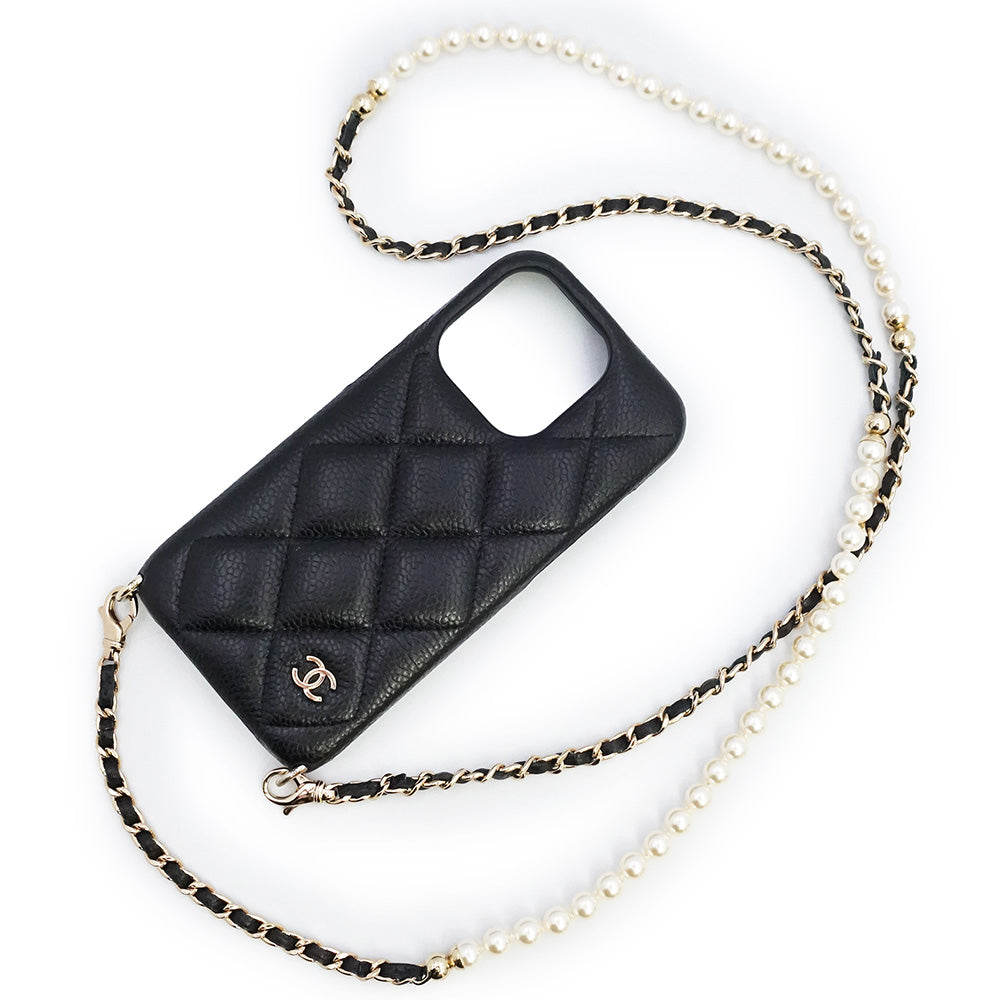 CHANELより、iPhone 15 PROのスマホケース。シンプルなマトラッセのデザイン、端にはキラリと煌くココマーク。さらにパールロングチェーンが華やかさをより演出してくれます。 |