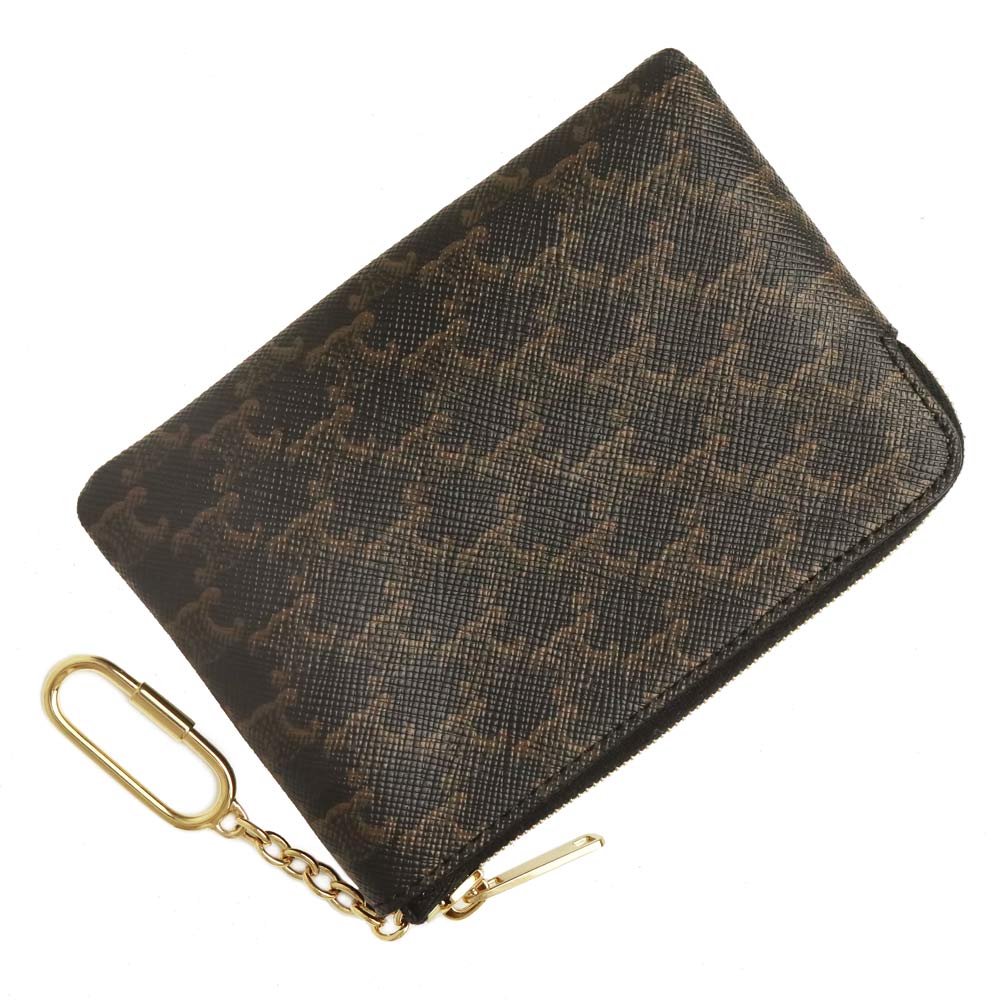 トリオンフのモノグラム柄レザーにNEWロゴのプリントが際立つ、キーチェーン付きのコイン&カードケース。カードやコインだけでなく、薬や化粧品などの小物を収納するポーチとしても使用できるサイズ感で、使い勝手のいいアイテムです。