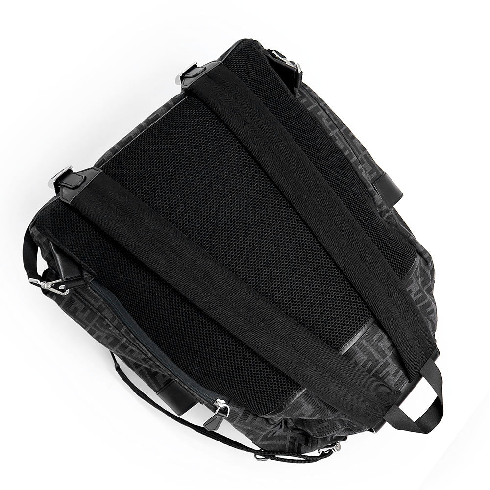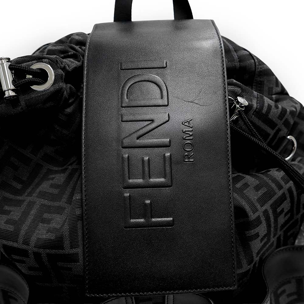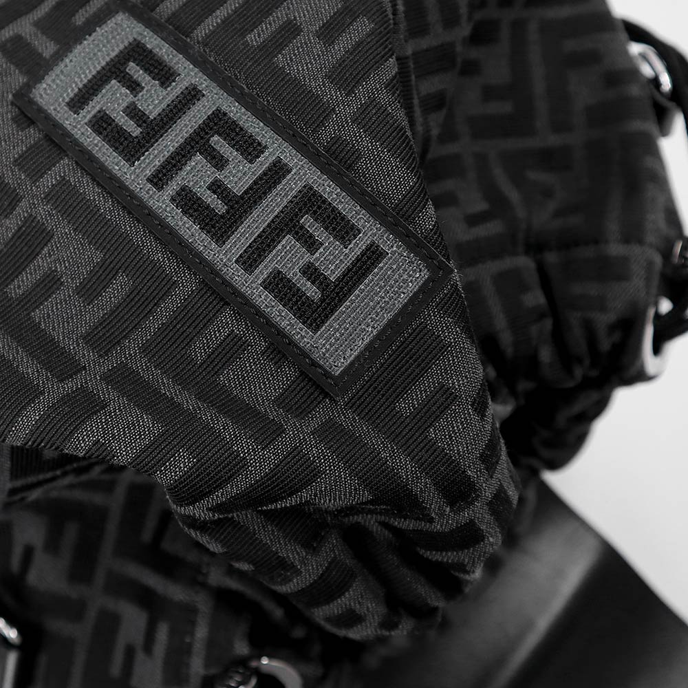 ミディアムサイズのバックパック。ブラックとグレーのFFモチーフをジャカードで織り込んだファブリック製。ブラックのレザーディテール、FENDI ROMAのエンボスロゴがあしらわれたフラップ。取り外し可能なストラップが付いているので、肩にかけることも手で携帯することもできます。 |