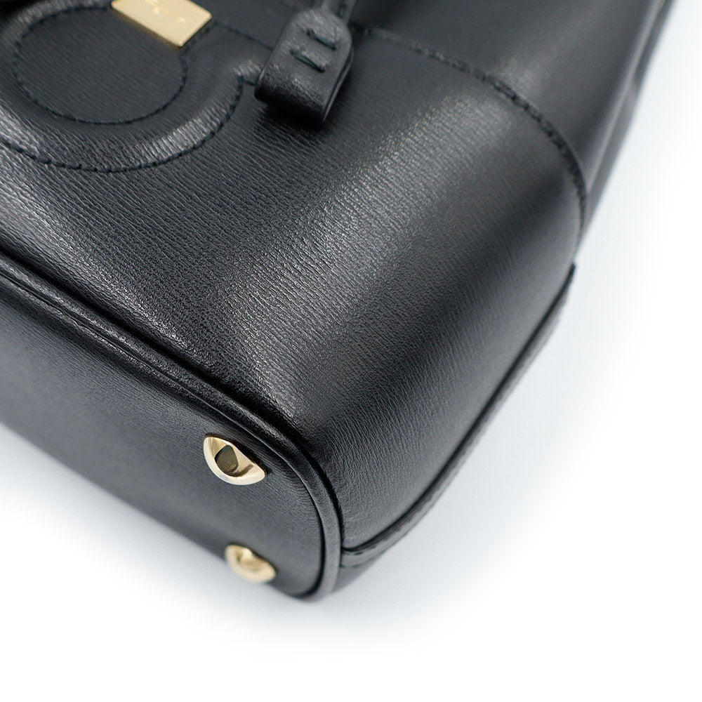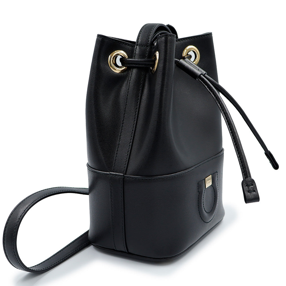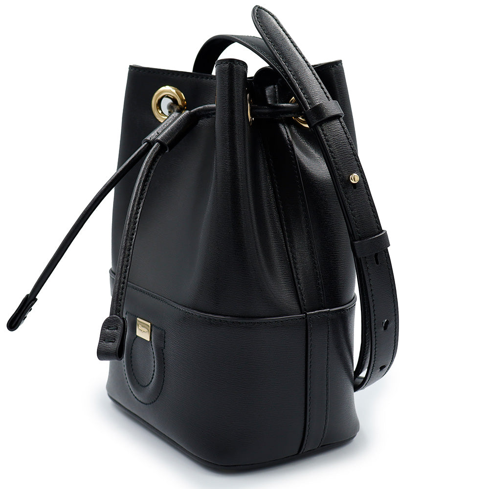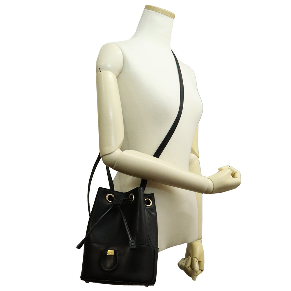 【美品】Salvatore Ferragamo サルヴァトーレフェラガモ AU-21H484 ガンチーニ ミニ バケット カーフスキン ネロ ブラック ドローストリング ショルダーバッグ 巾着 斜め掛け レザー ゴールド金具