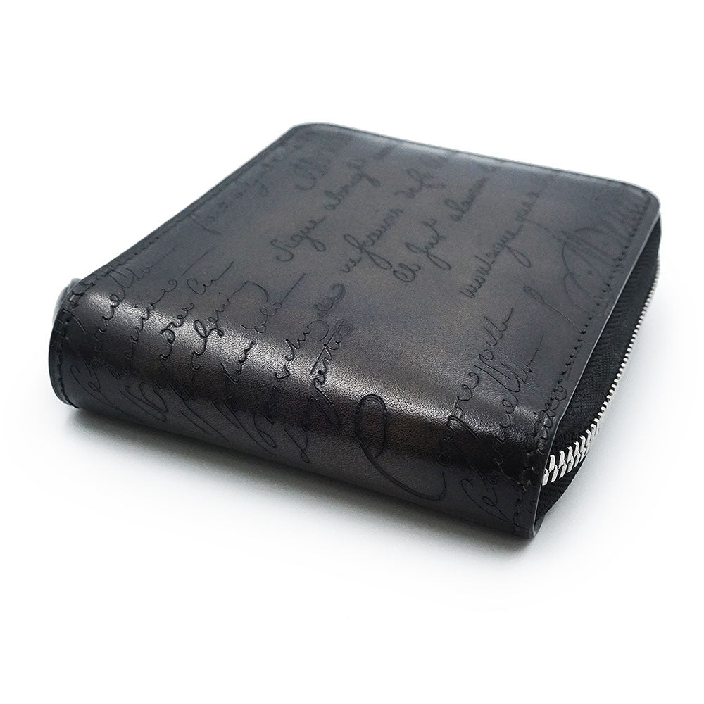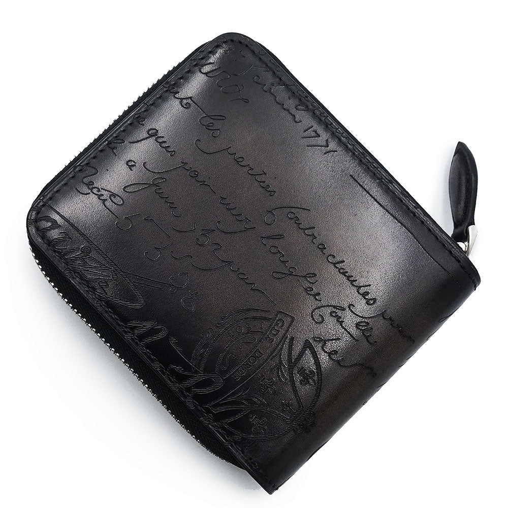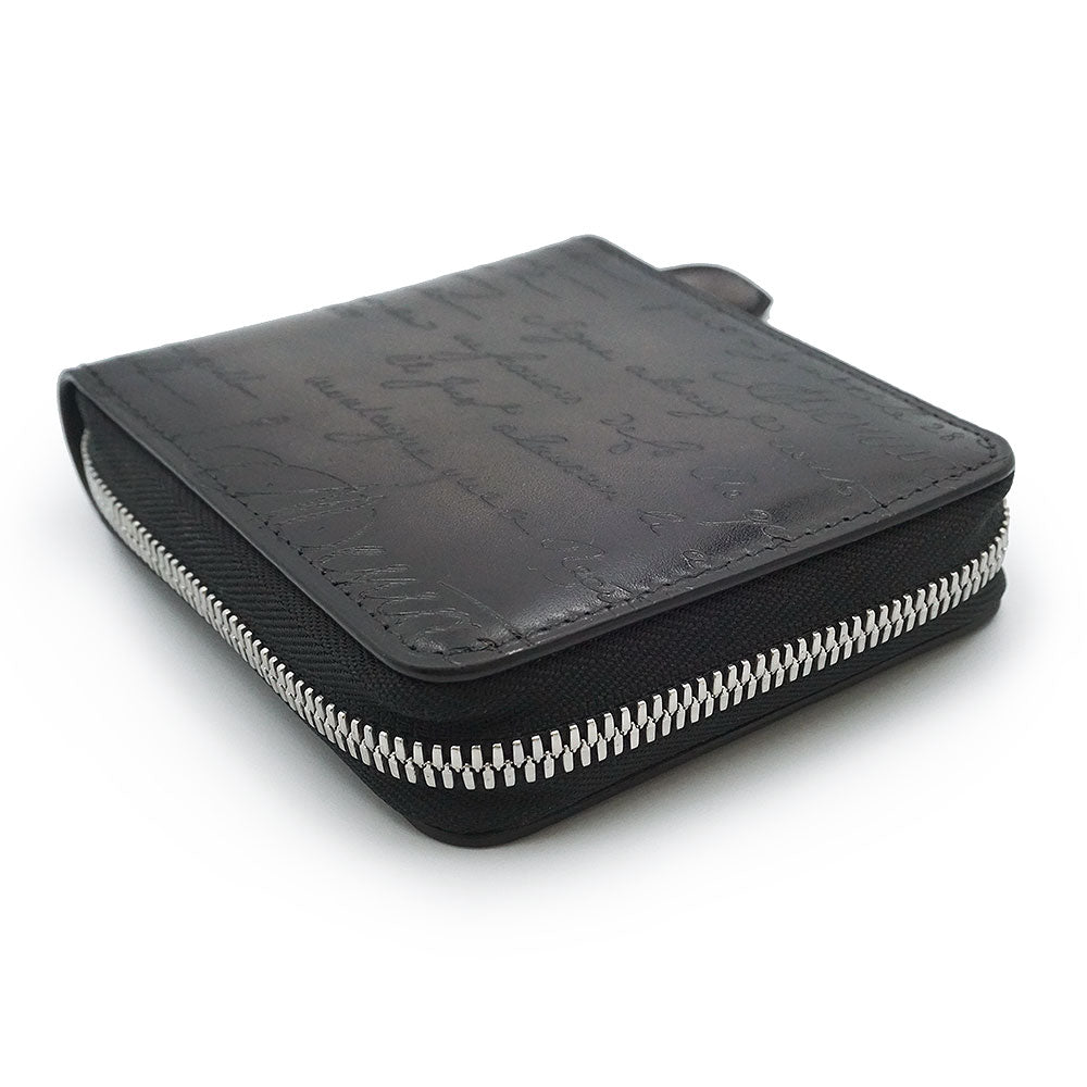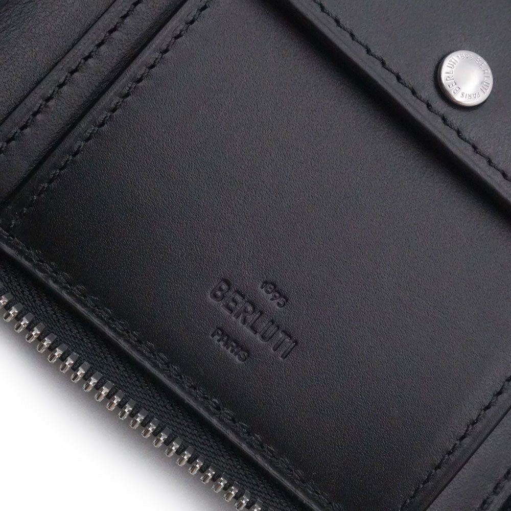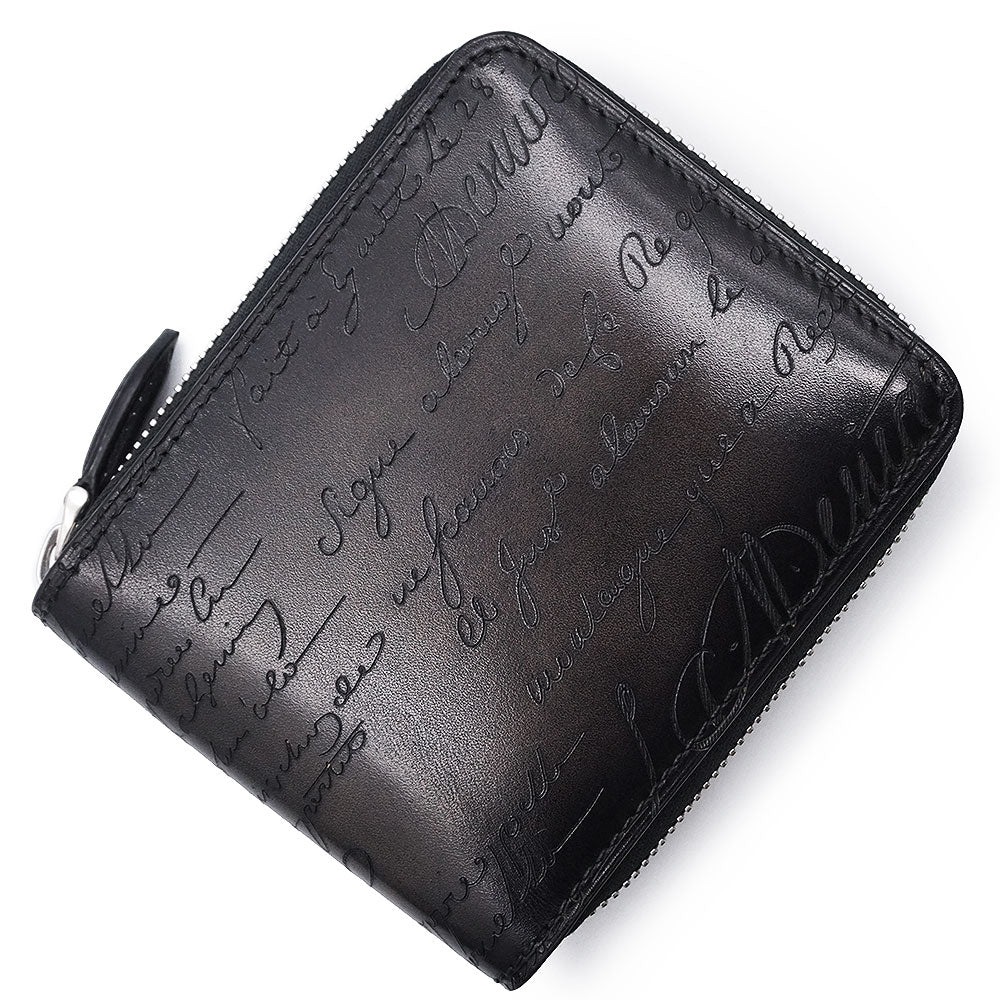 【未使用 展示品】Berluti ベルルッティ カリグラフィ イタウバ スクエア コンパクトジップウォレット ヴェネチアカーフレザー ネログリージョ ブラック ラウンドファスナー 二つ折り財布 シルバー金具