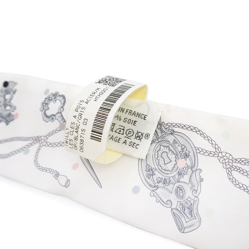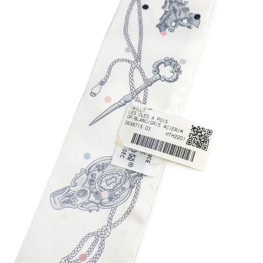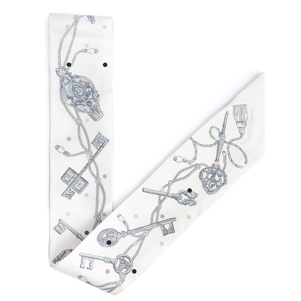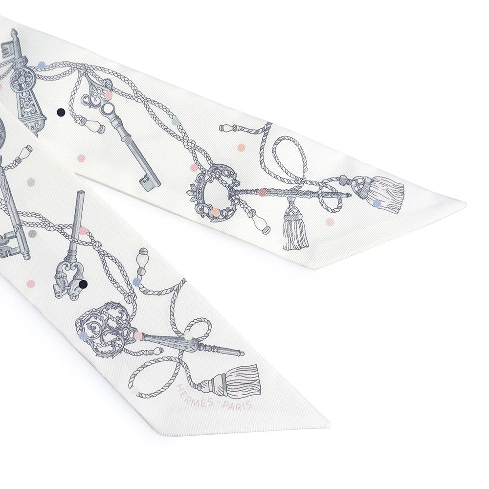 【新品・未使用品】HERMES エルメス ツイリー Les Cles a Pois レ クレ ア ポア シルク100% ブラン グリアシエ マルチカラー ホワイト リボン スカーフ 箱付