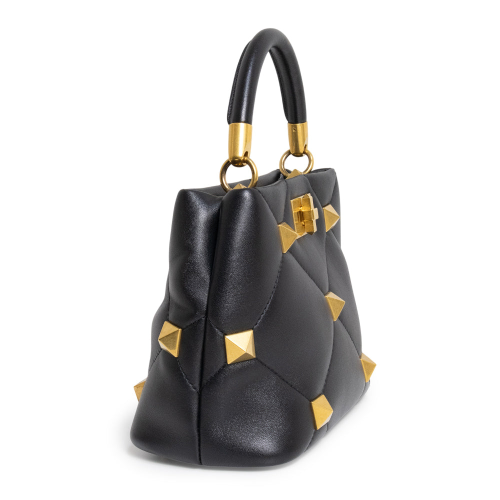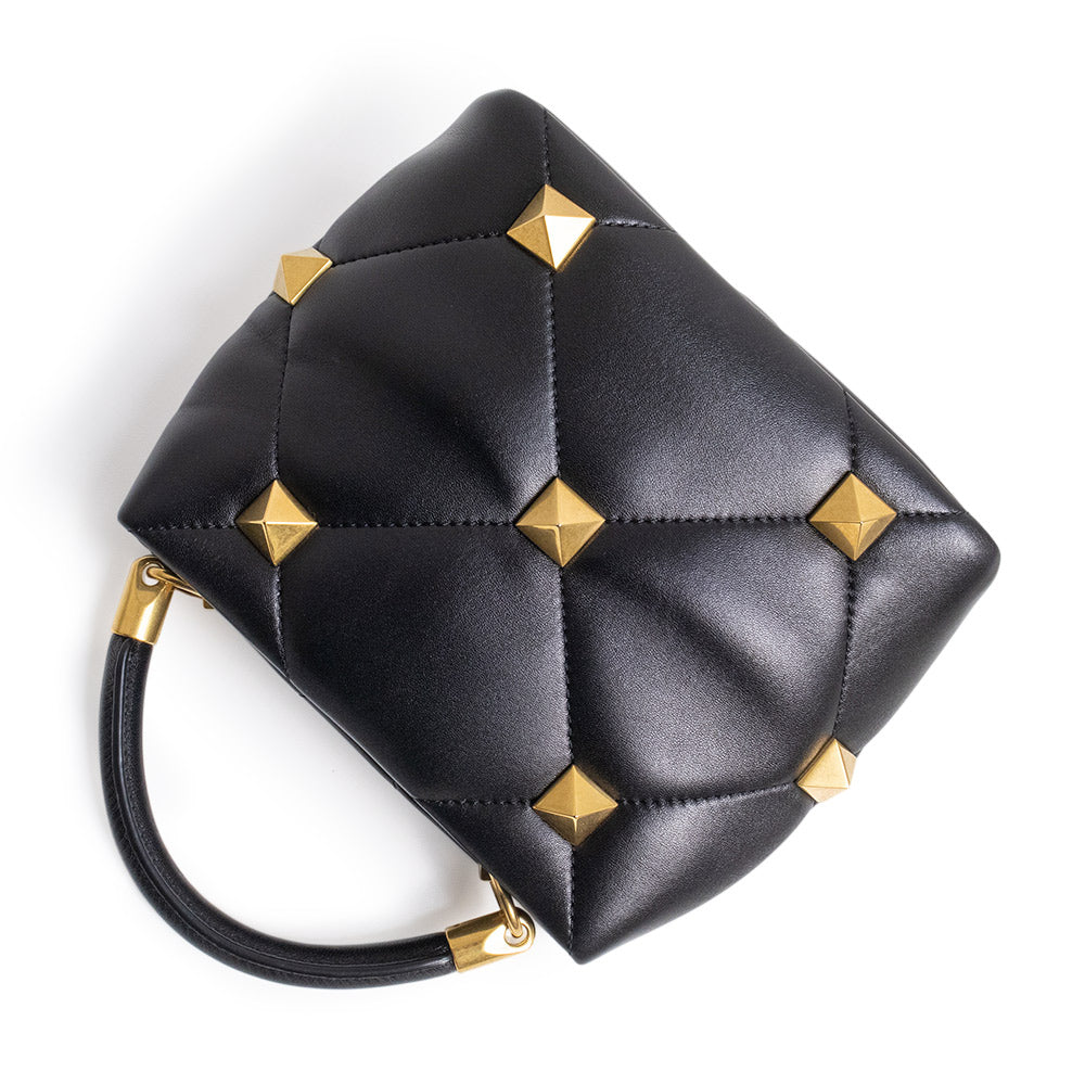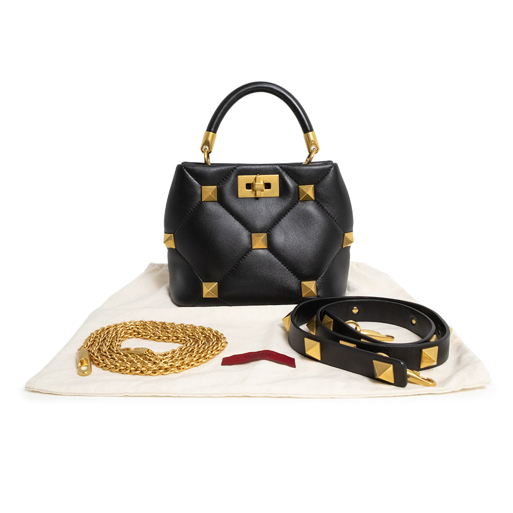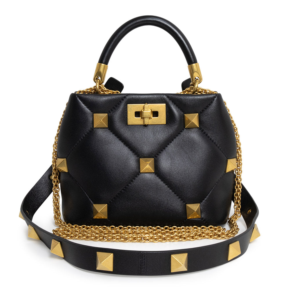 ヴァレンティノ ローマンスタッズ ナッパレザー バッグ。柔らかなレザーにダイヤ柄のステッチとハードなロックスタッズデザインです。取り外し可能なチェーンストラップとレザーショルダーストラップで、ハンドバッグ、ショルダーバッグ、クロスボディバッグとしてお使いいただけます。 |
