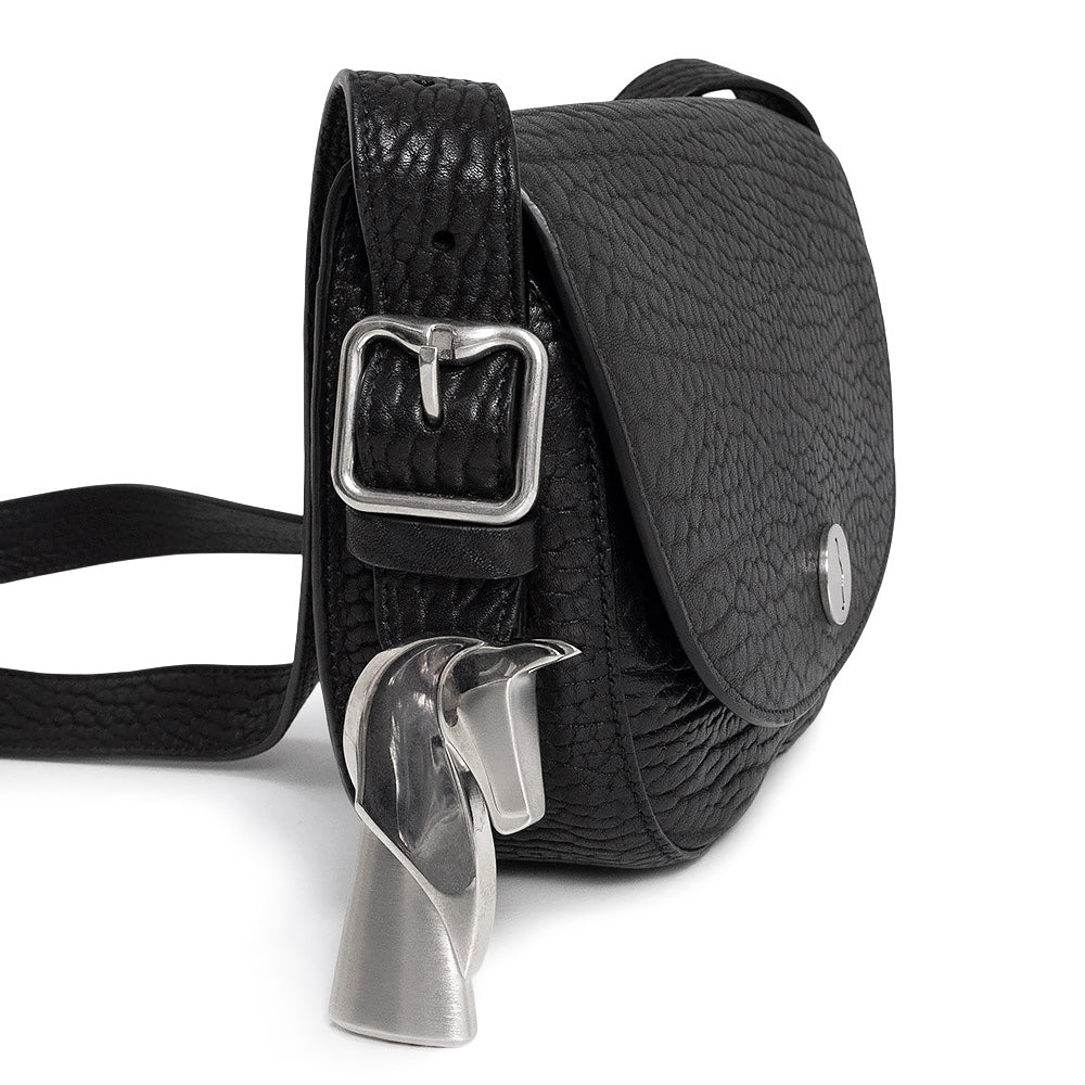 シボ感のあるレザーがヴィンテージのような風合いのバーバリーのショルダーバッグ。ストラップの先端には、チェスの駒をかたどった重厚感のあるメタルのモチーフがあしらわれています。普段使いしやすいサイズ感で、シンプルなのでスタイリングにも取り込みやすいアイテムです。 |